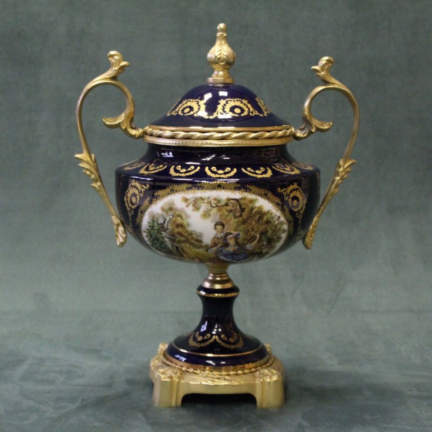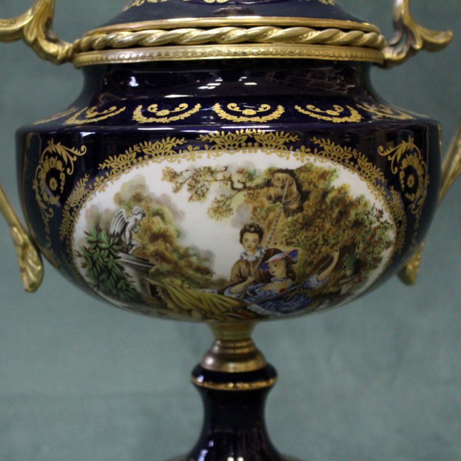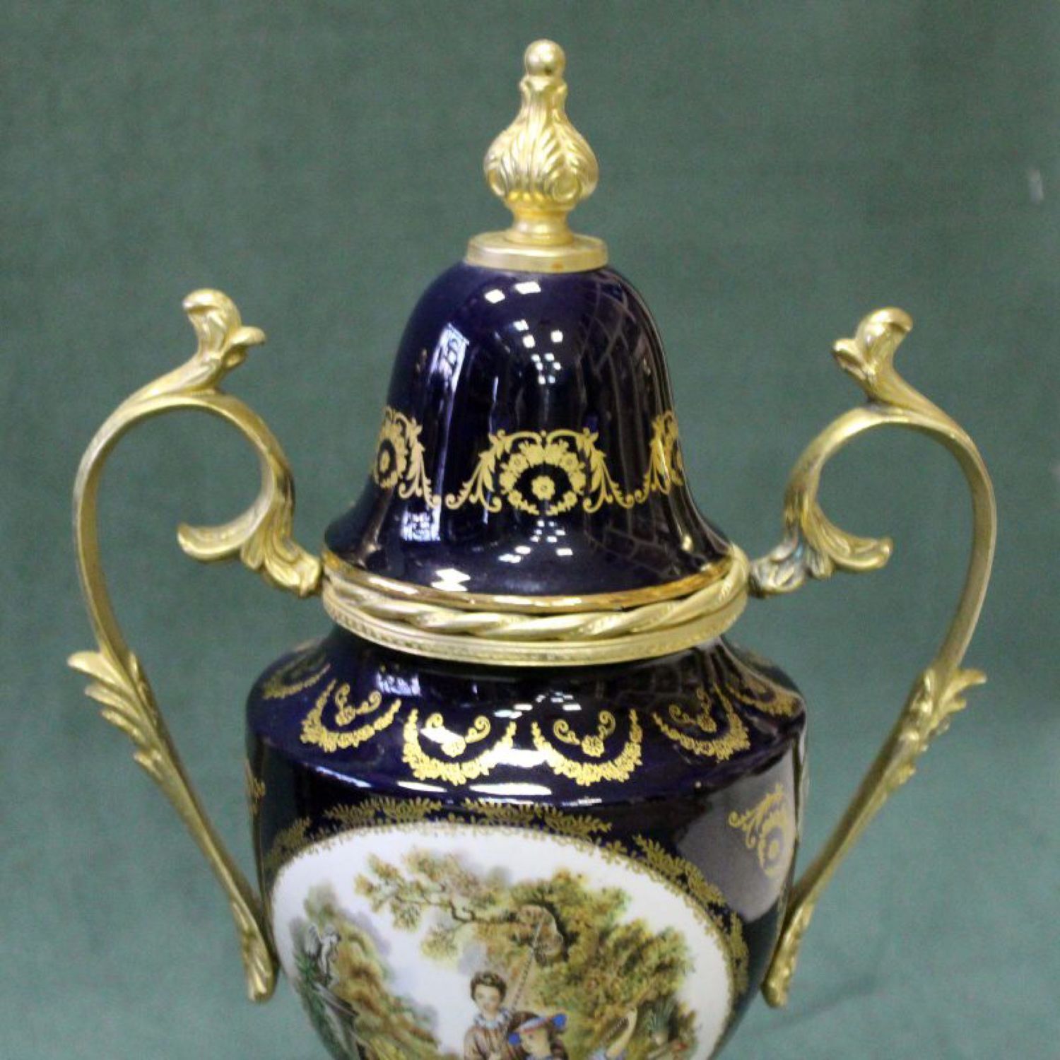 Комплект ваз в дворцовом стиле. изготовленный на Лиможской фарфоровой мануфактуре. Декоративное оформление гарнитура представлено живописными композициями в окружении золотой рамки. Также гарнитур дополнен бронзовыми элементами.