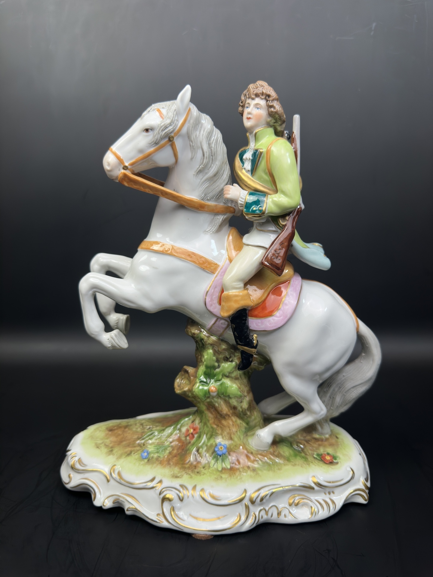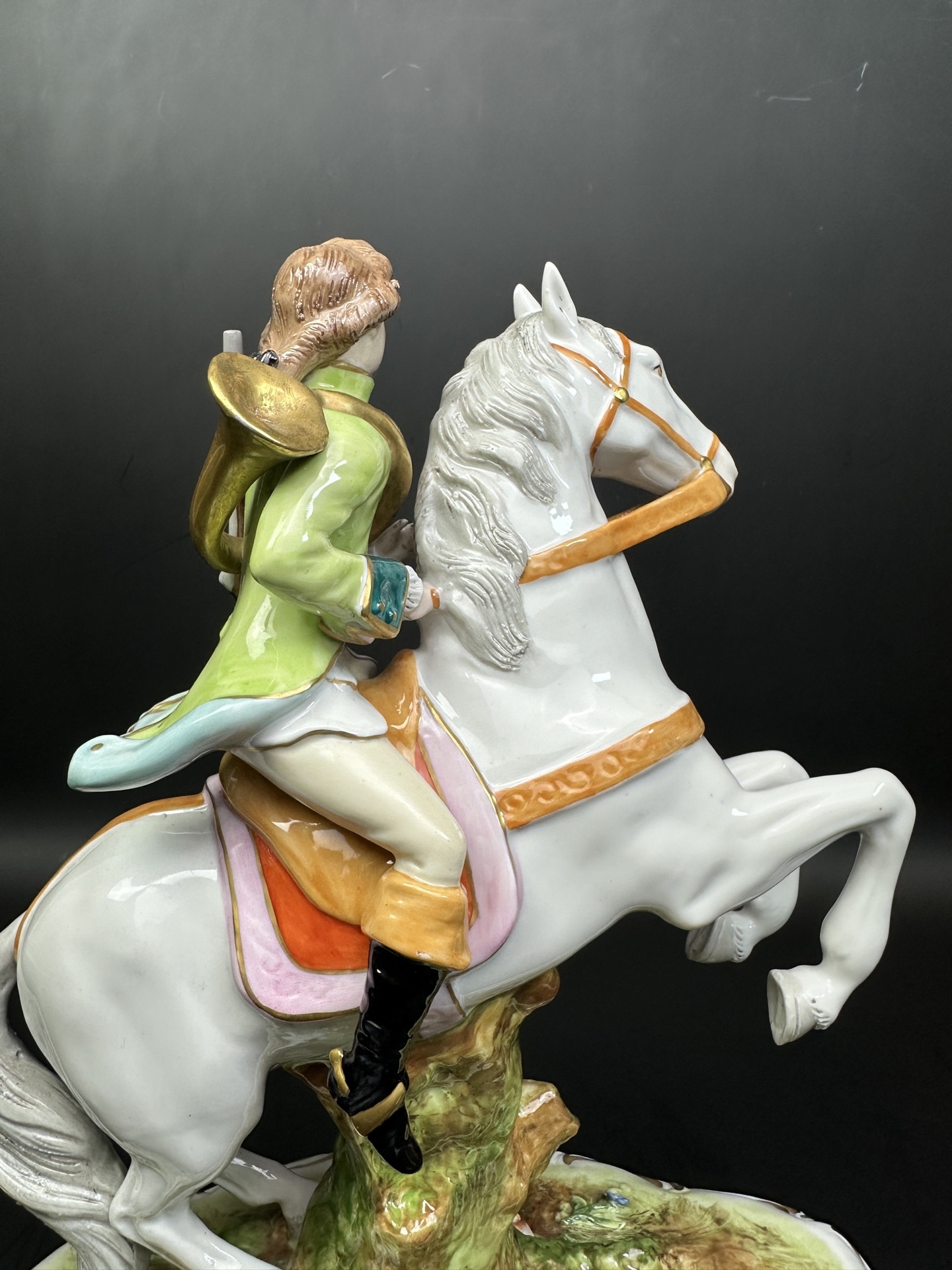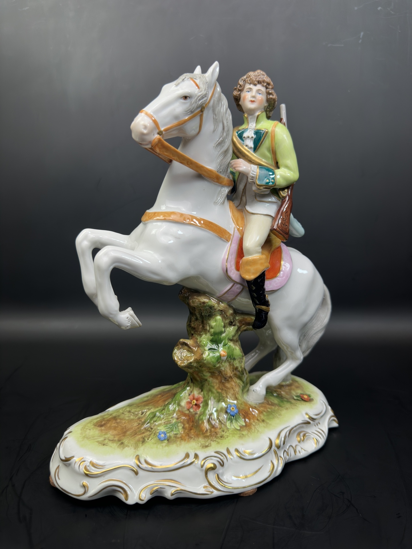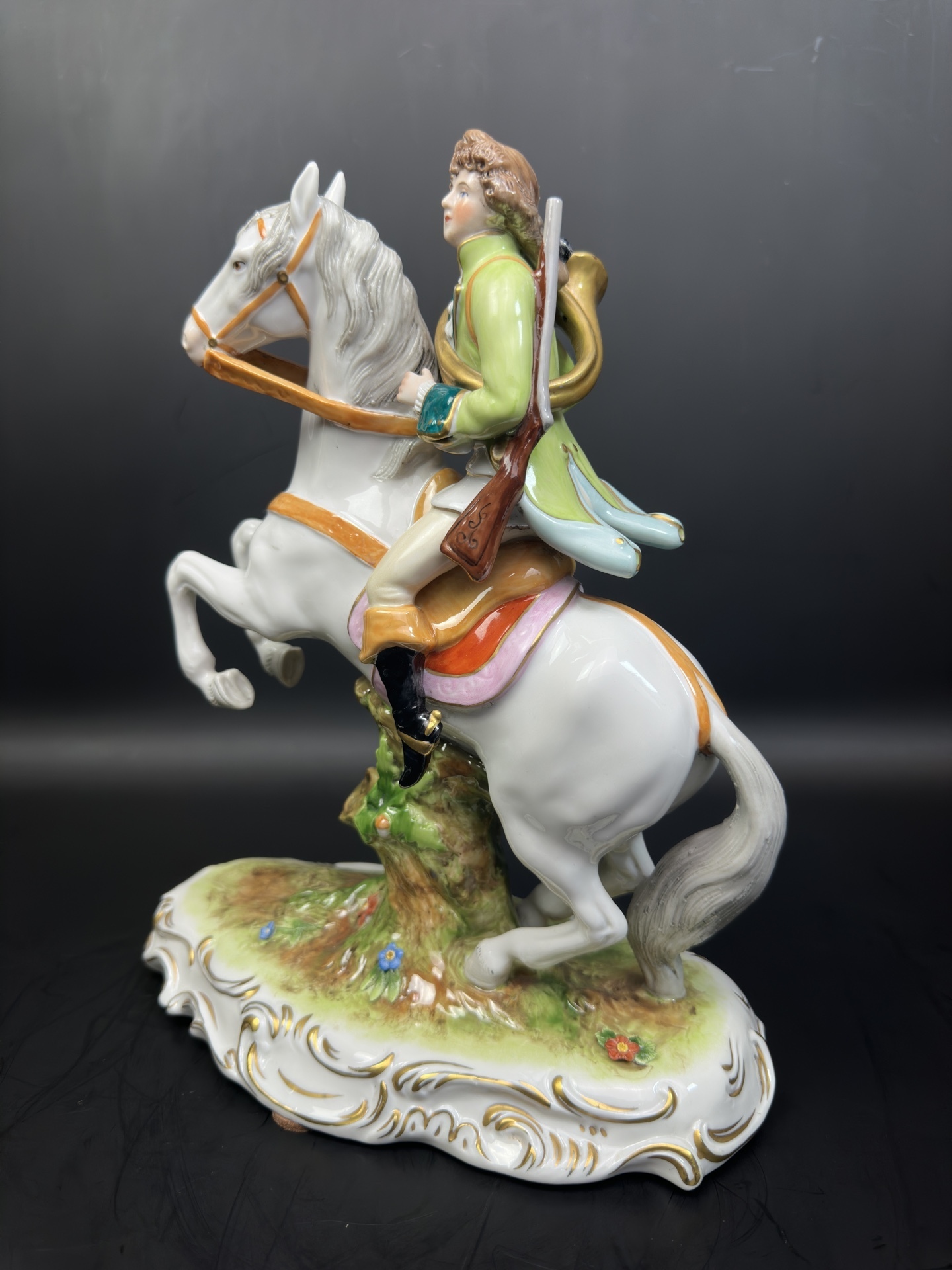 Изысканная фарфоровая статуэтка немецкой мануфактуры Scheibe-Alsbach, изображающую всадника с охотничьим ружьем и горном.