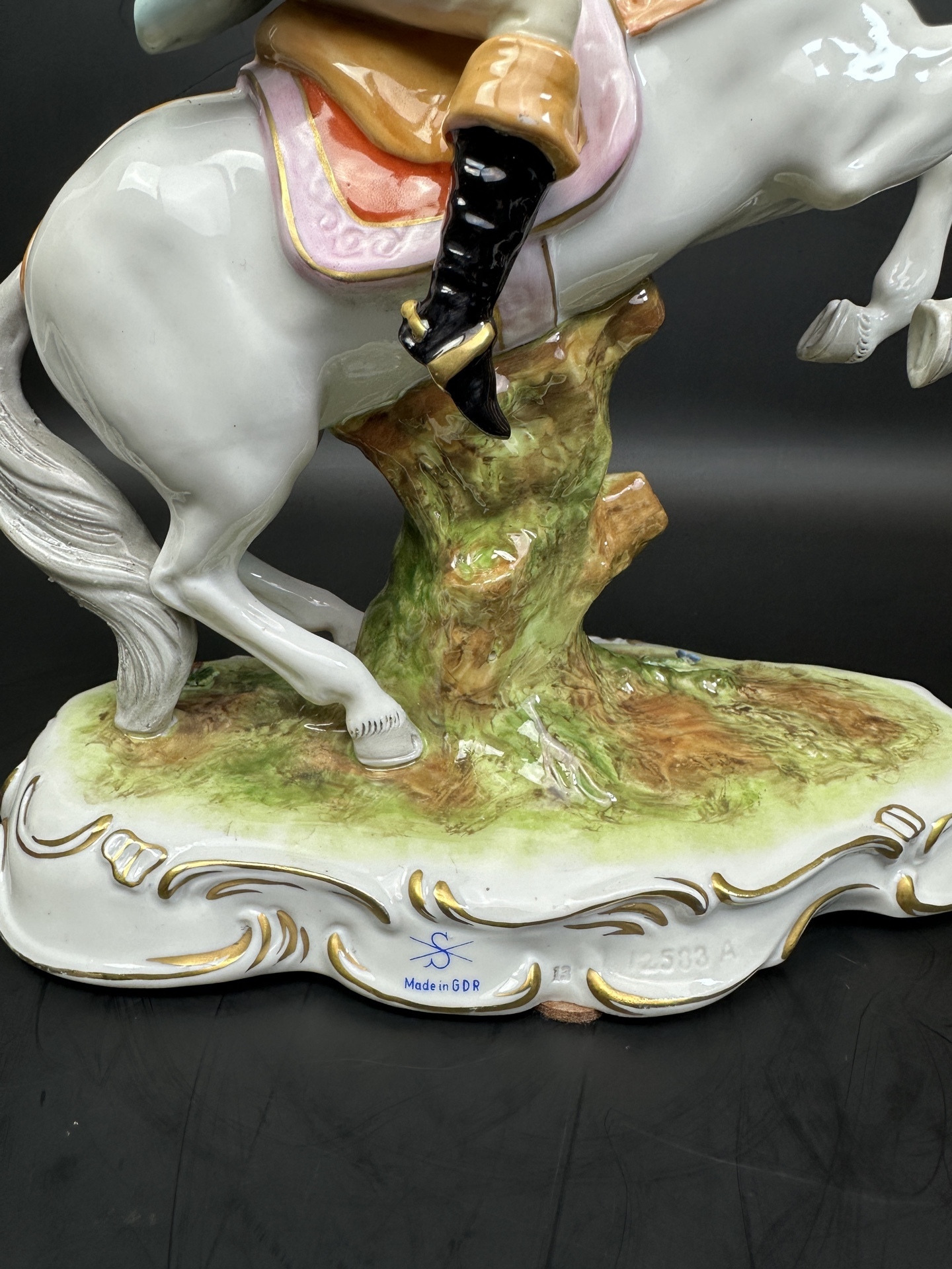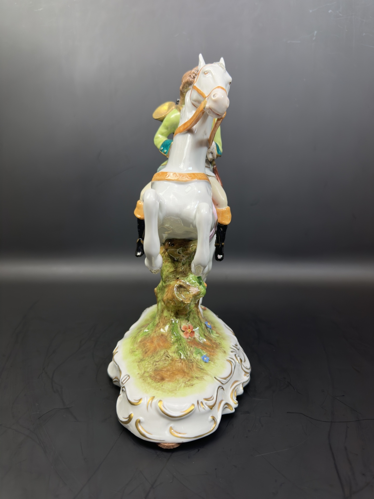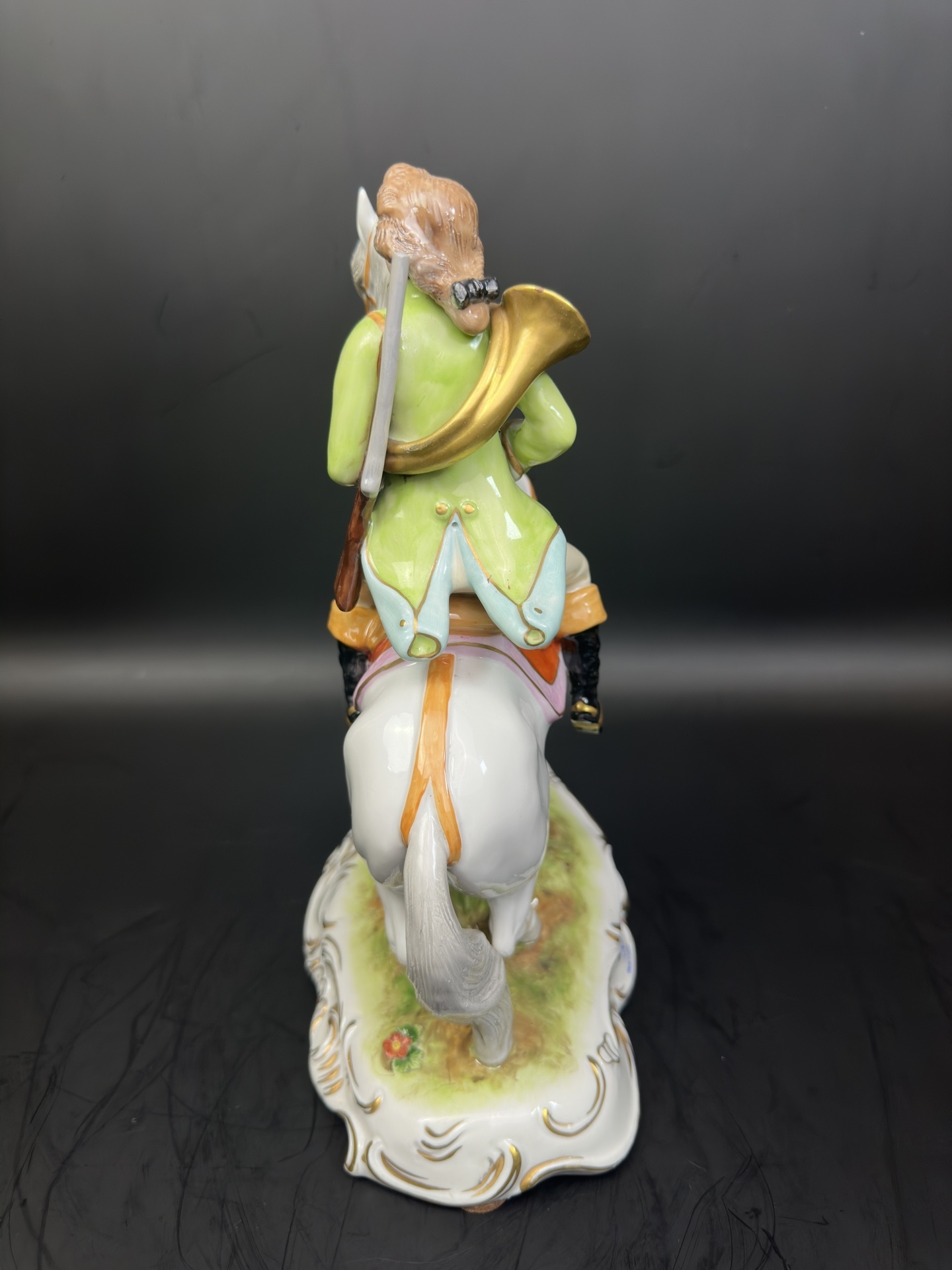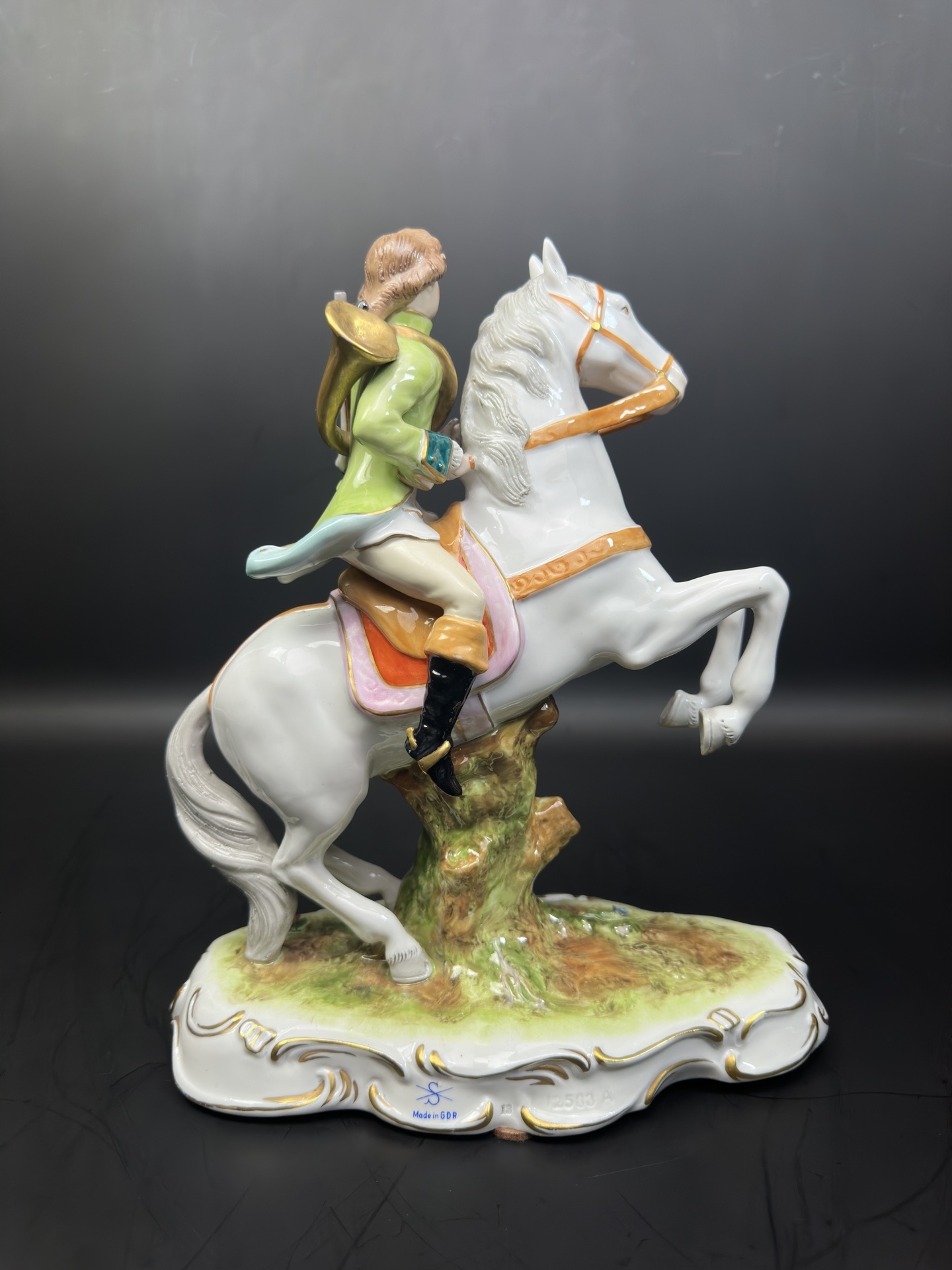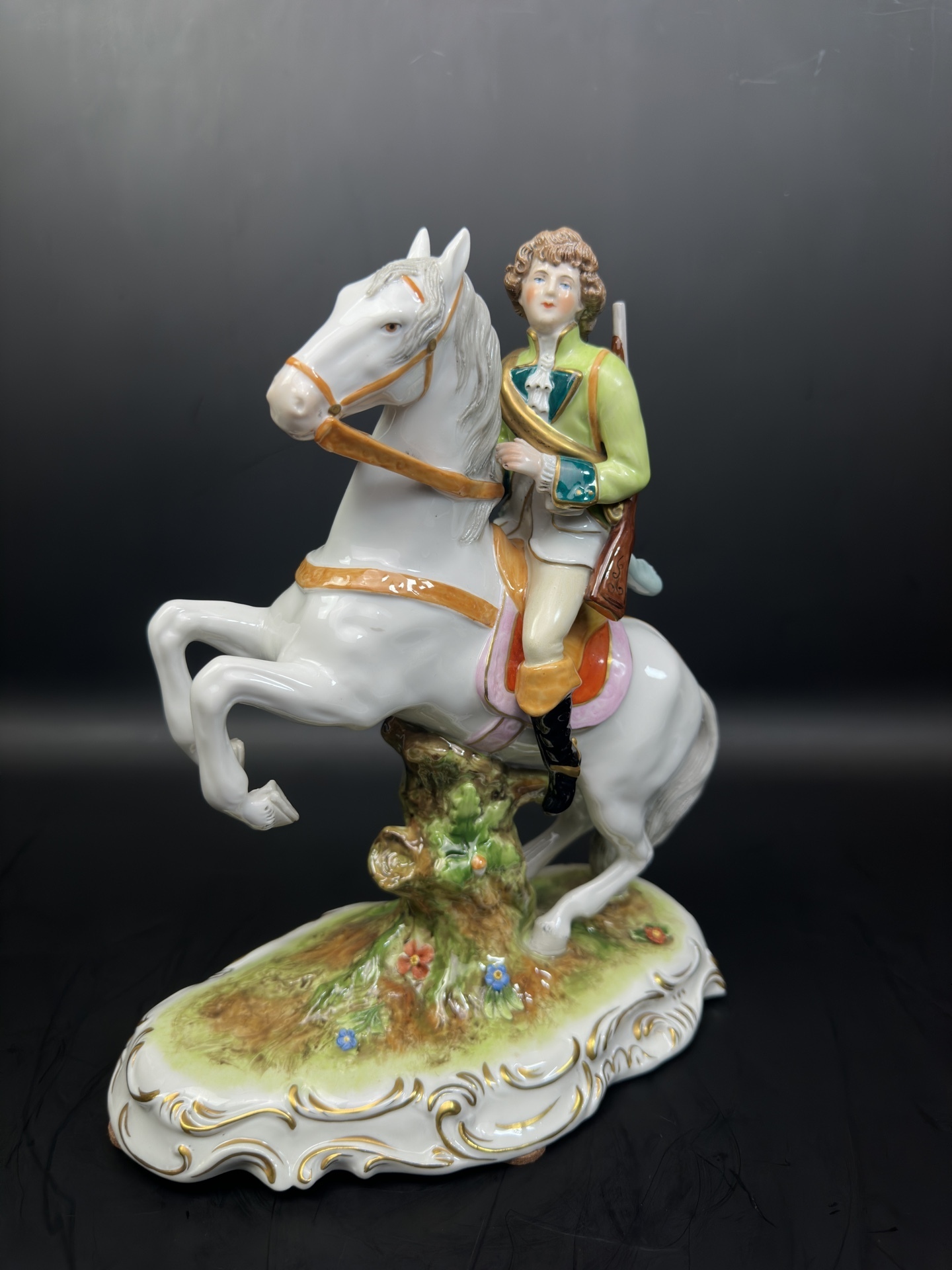 Изысканная фарфоровая статуэтка немецкой мануфактуры Scheibe-Alsbach, изображающую всадника с охотничьим ружьем и горном.
