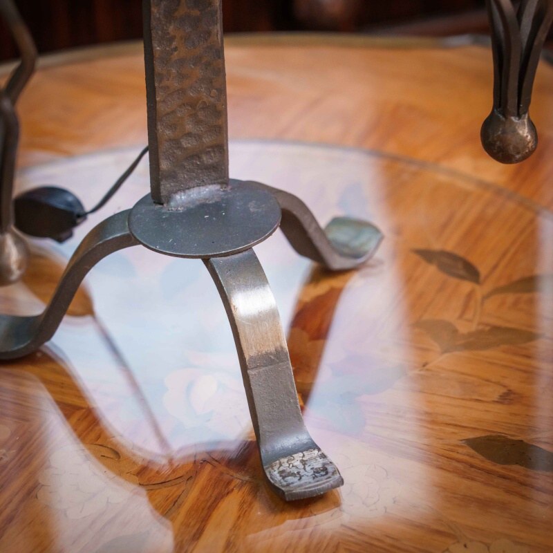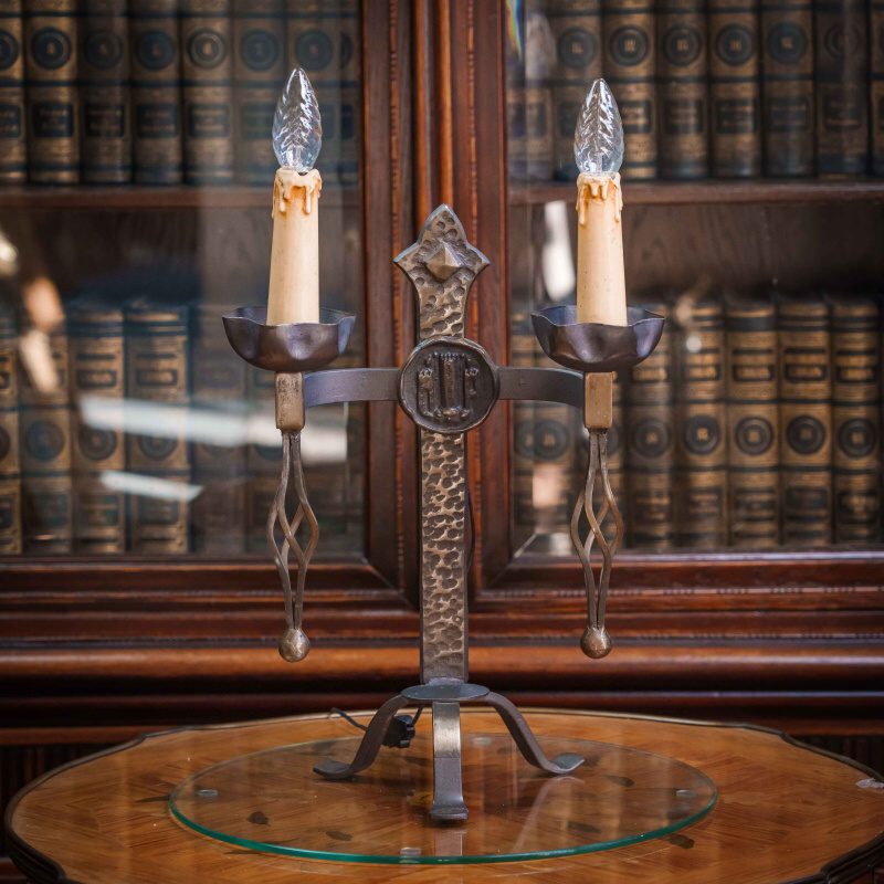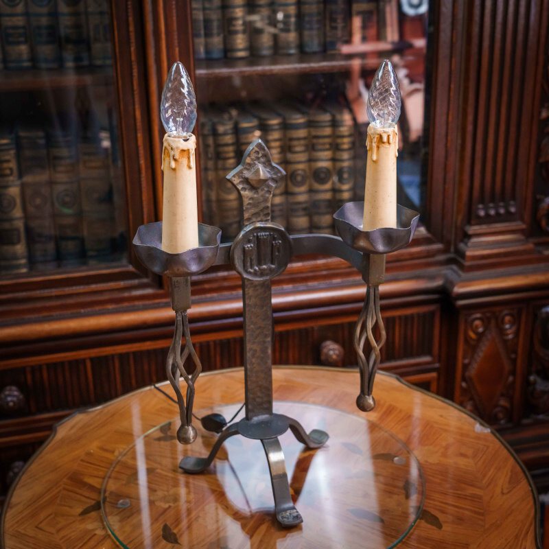 Редкий настольный светильник, выполненный в готическом стиле, — выразительный пример европейской художественной ковки середины XX века. Основание изготовлено из металла ручной работы, с характерной молотковой фактурой и декоративными элементами, придающими предмету аутентичный средневековый облик.