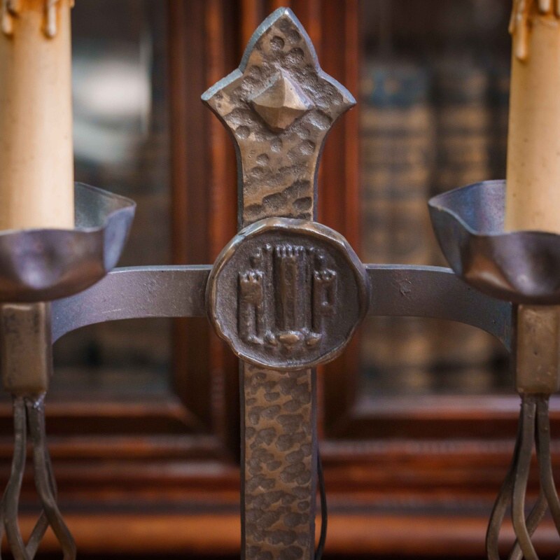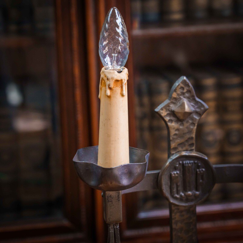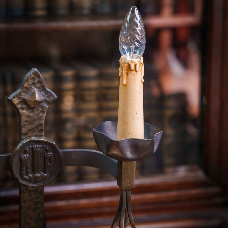 Светильник оформлен в виде двухрожкового канделябра, украшенного стилизованным крестом и изящными коваными держателями. “Свечи” снабжены электрическими лампами с декоративными плафонами под форму пламени, что создаёт эффект живого света и атмосферу старинного замка.