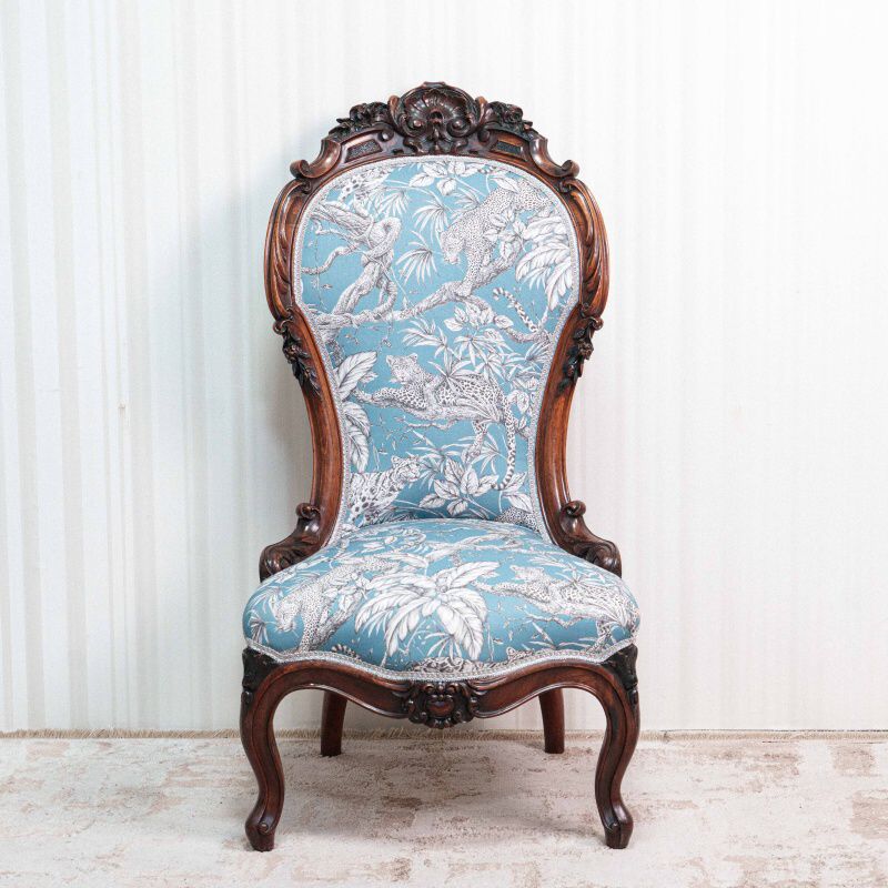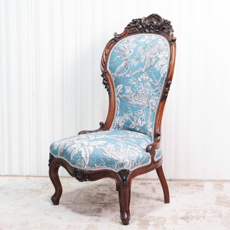 Мягкие подлокотники снабжены небольшими мягкими накладками и опираются на резные стойки с растительными мотивами, плавно переходящие в основание сиденья.