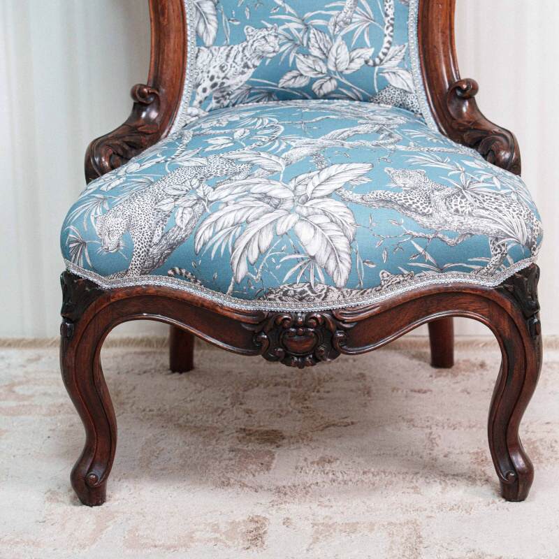 Само сиденье обтянуто аналогичной жаккардовой тканью с цветочным узором, а край обивки по всему периметру подчеркнут рядом декоративных мебельных гвоздиков с круглыми шляпками.