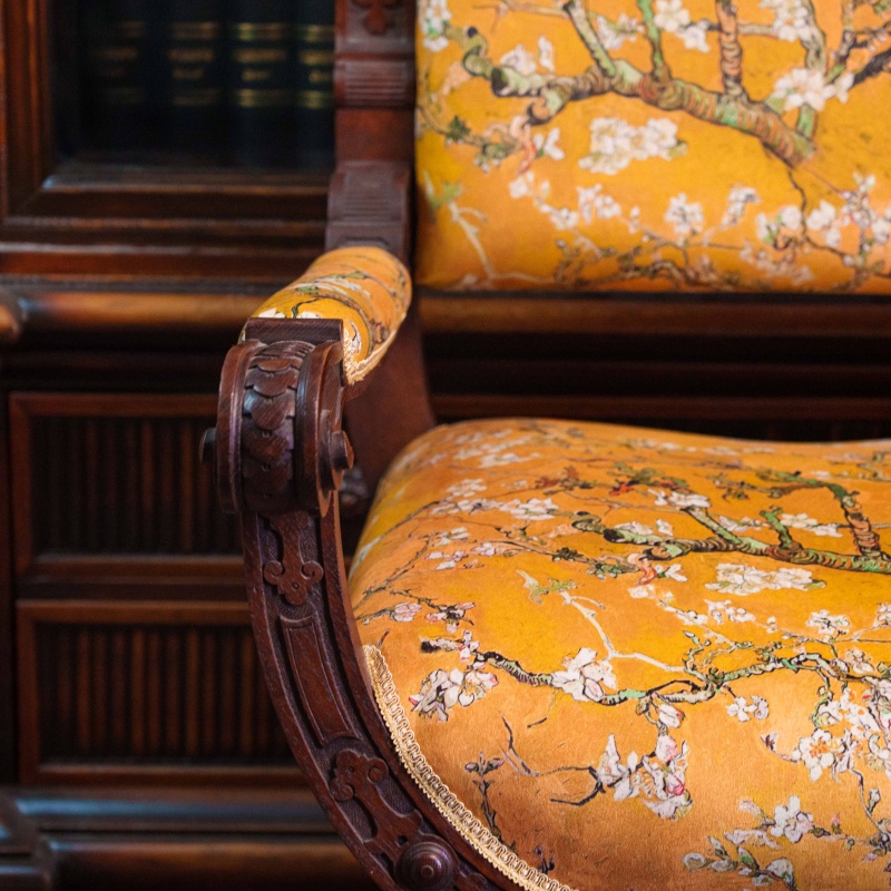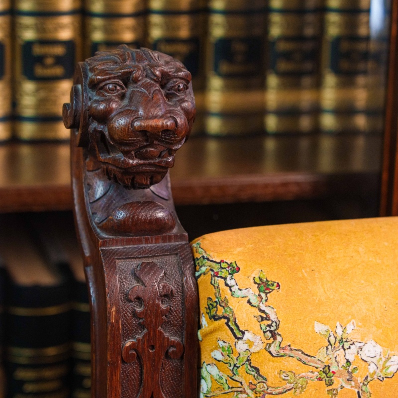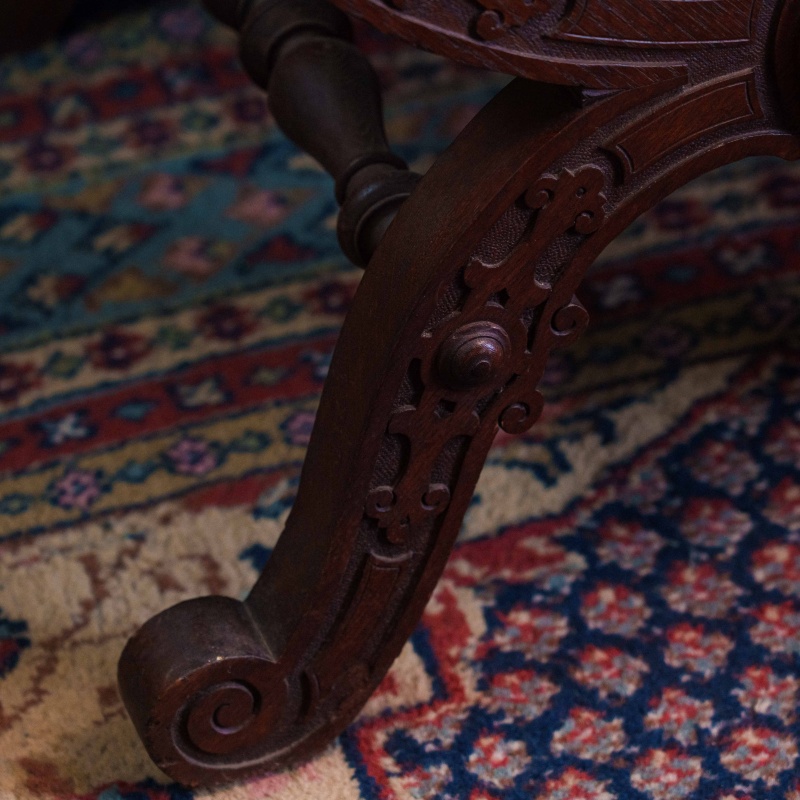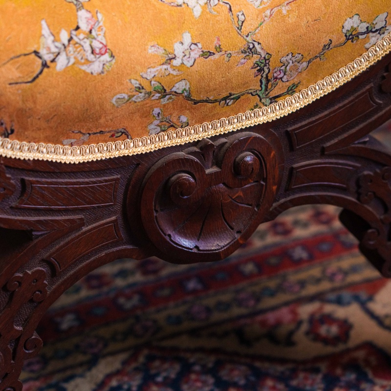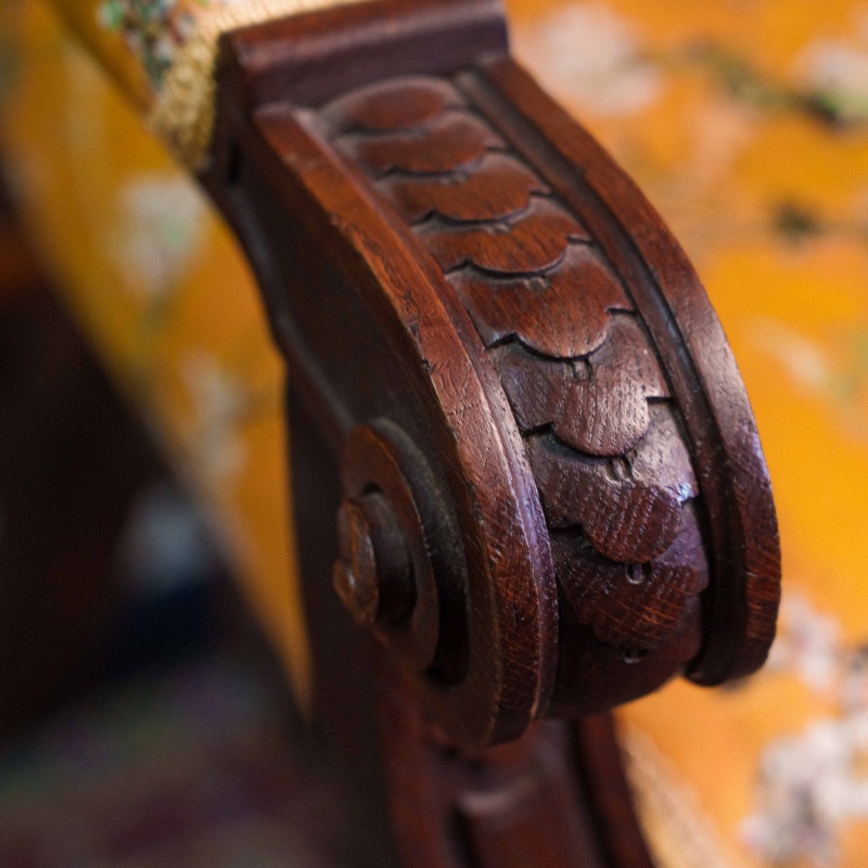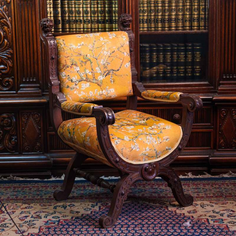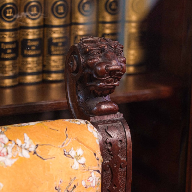 Перед нами изысканное антикварное кресло кабинетного типа, выполненное в историческом стиле с явным влиянием неоренессансных форм XIX века.