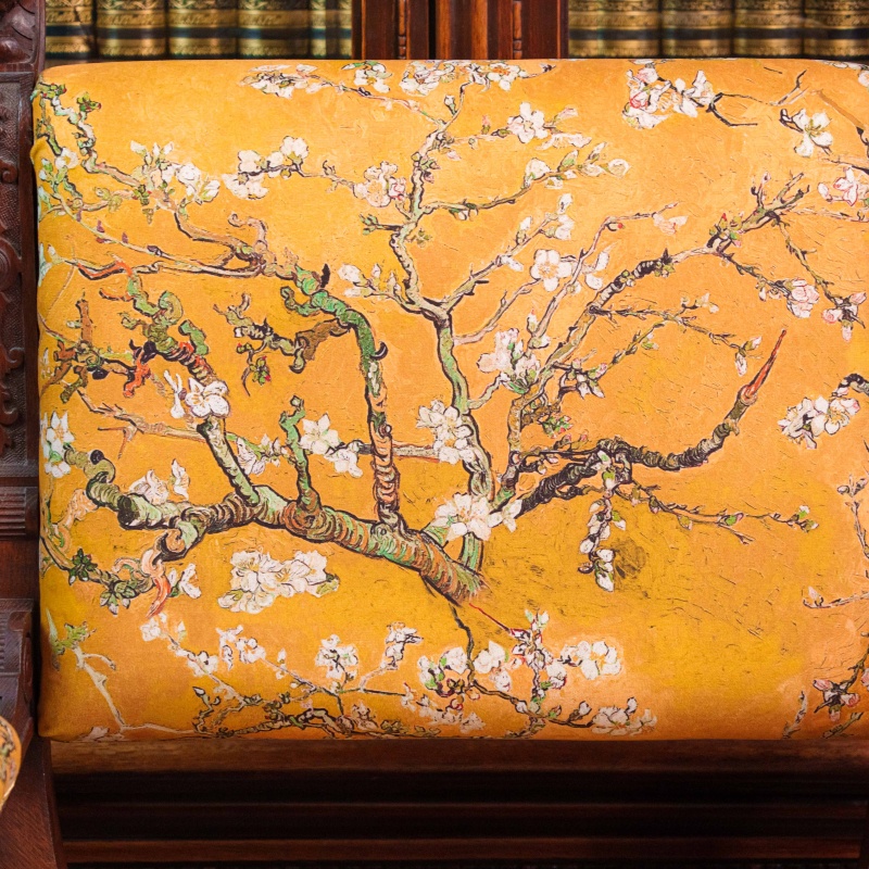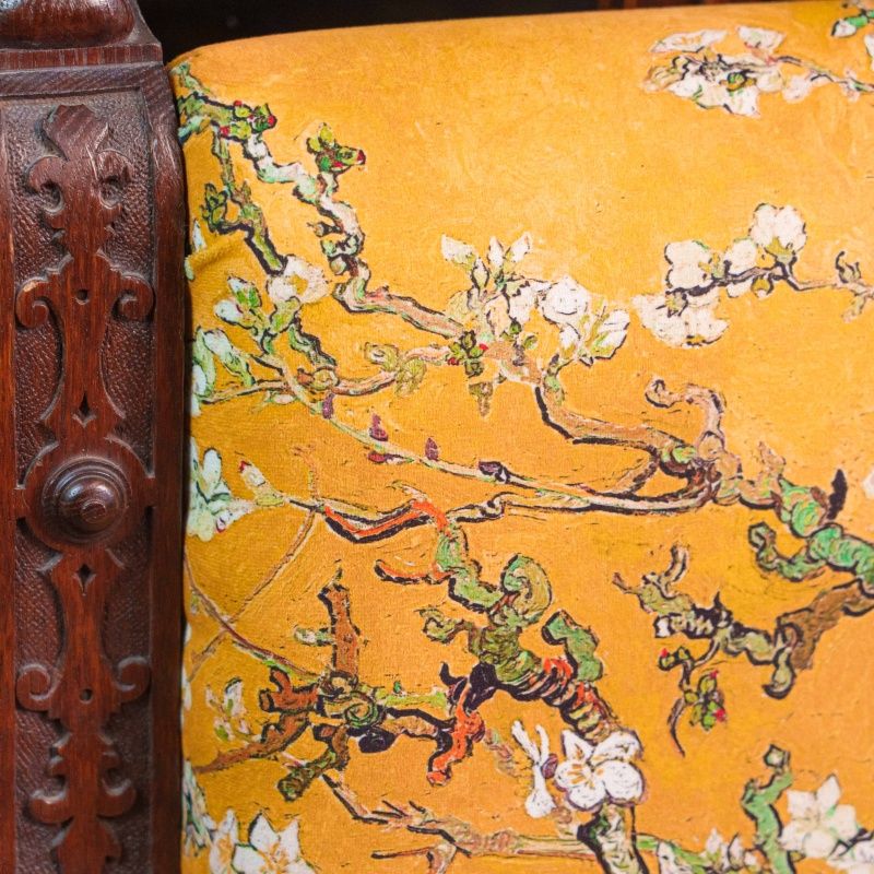 Спинка высокая, прямоугольной формы, слегка наклонённая назад для удобства посадки. Верхний край завершён резным декоративным элементом — акцентными волютами и скульптурной проработкой, придающими креслу торжественный, почти монументальный характер. Боковые стойки спинки массивные, с профилированными гранями.