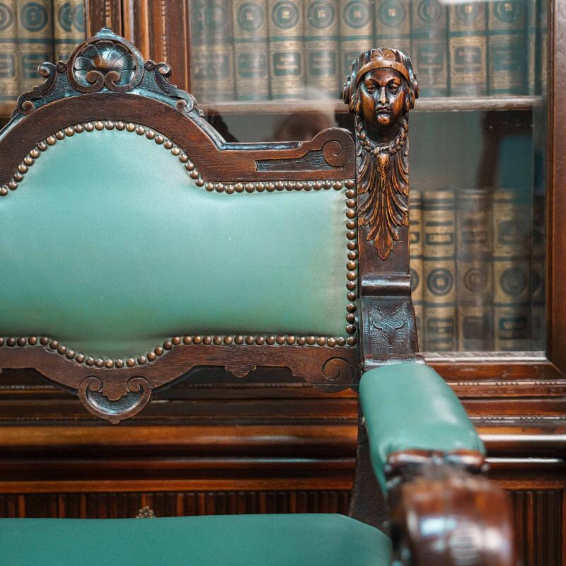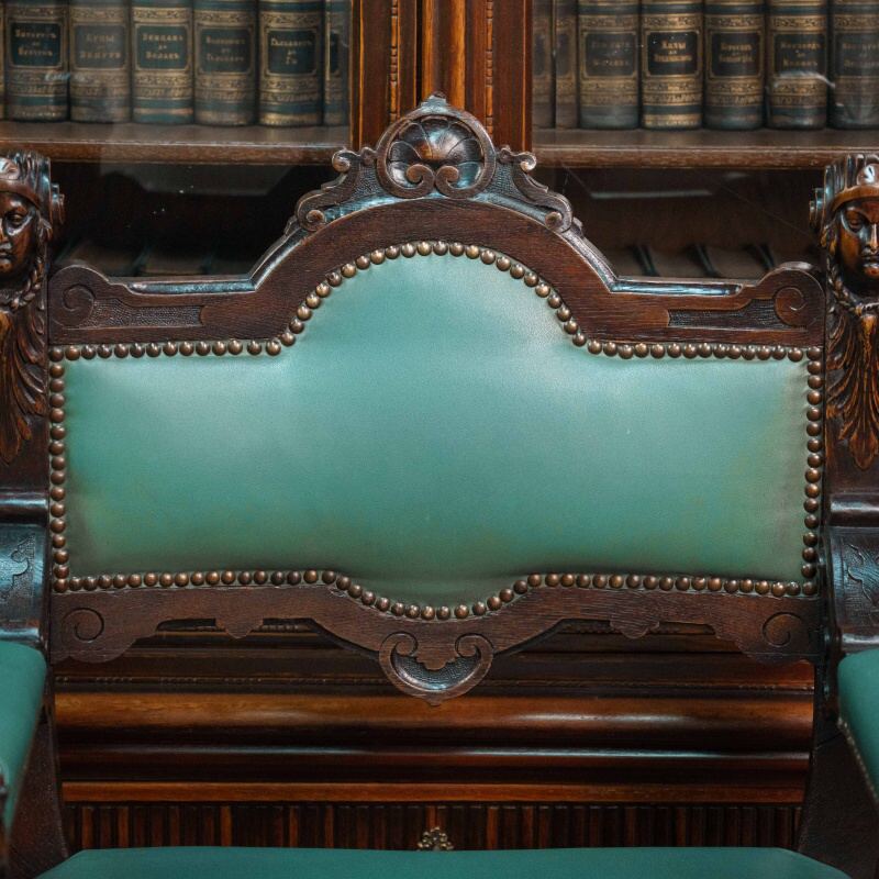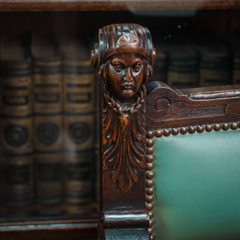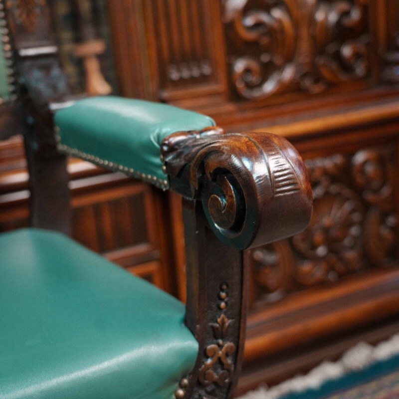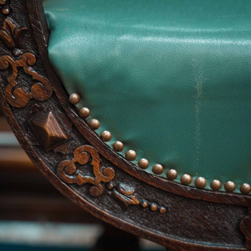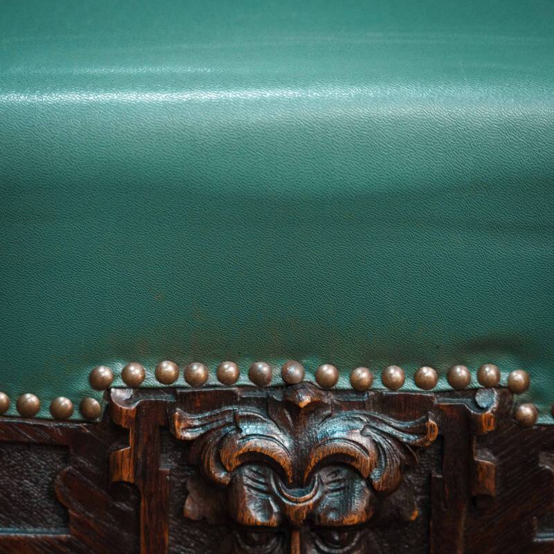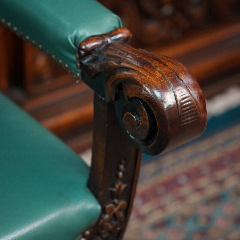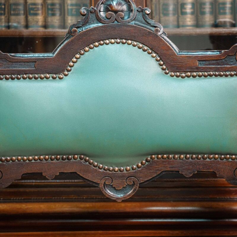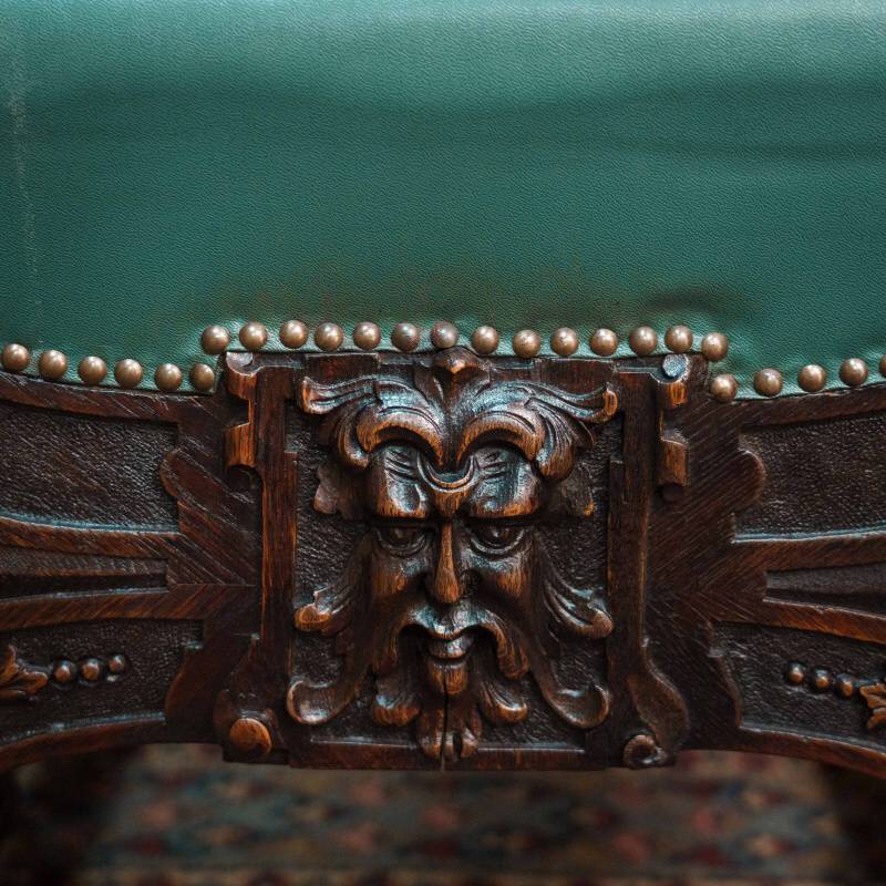 Спинка и сиденье обтянуты гладкой кожей глубокого зелёного цвета, которая отлично сочетается с тёплыми тонами древесины. Края обивки украшены рядом декоративных бронзовых гвоздей, создающих эффект изысканной рамки. Форма спинки изогнута и обрамлена резными элементами с мотивами аканта и стилизованных цветов, а в верхней части расположен резной медальон с маскароном — символом силы и мудрости.
