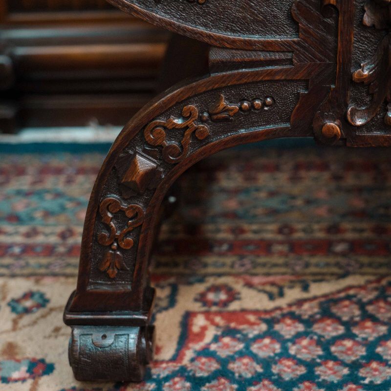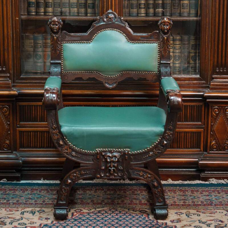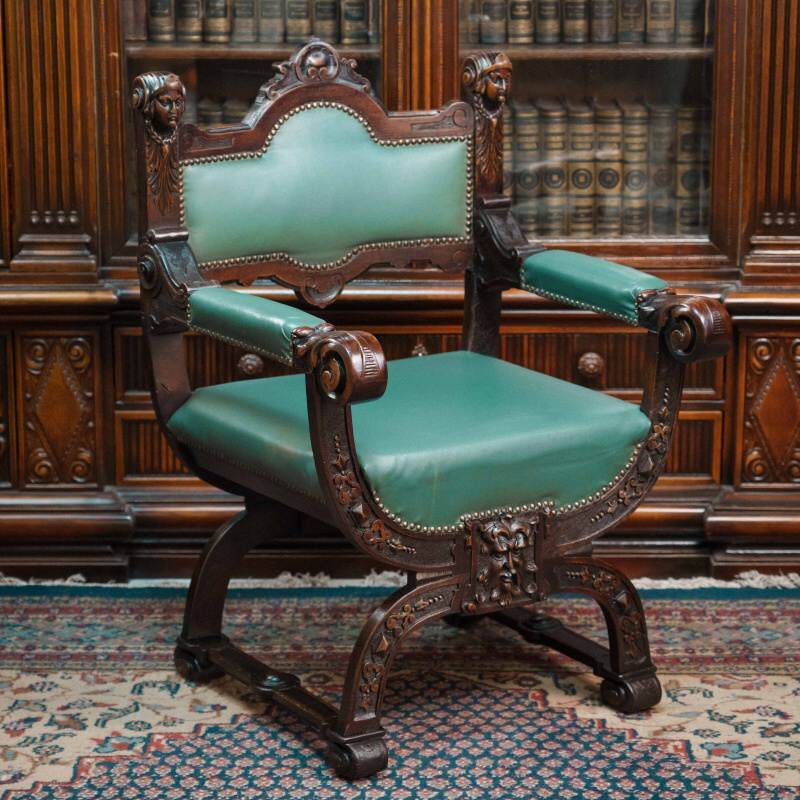 Антикварное кресло представляет собой выдающийся пример мебельного искусства конца XIX — начала XX века, выполненный в стиле неоренессанс. Конструкция изготовлена из массива тёмного дерева с насыщенным оттенком и изящной полировкой, подчёркивающей природную структуру материала. Массивная и в то же время гармоничная форма кресла придаёт ему внушительный, почти тронный облик, а богатый резной декор отражает высокий уровень ремесленного мастерства.