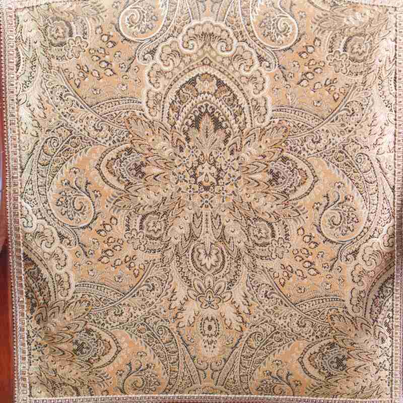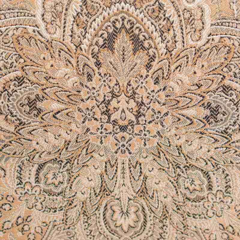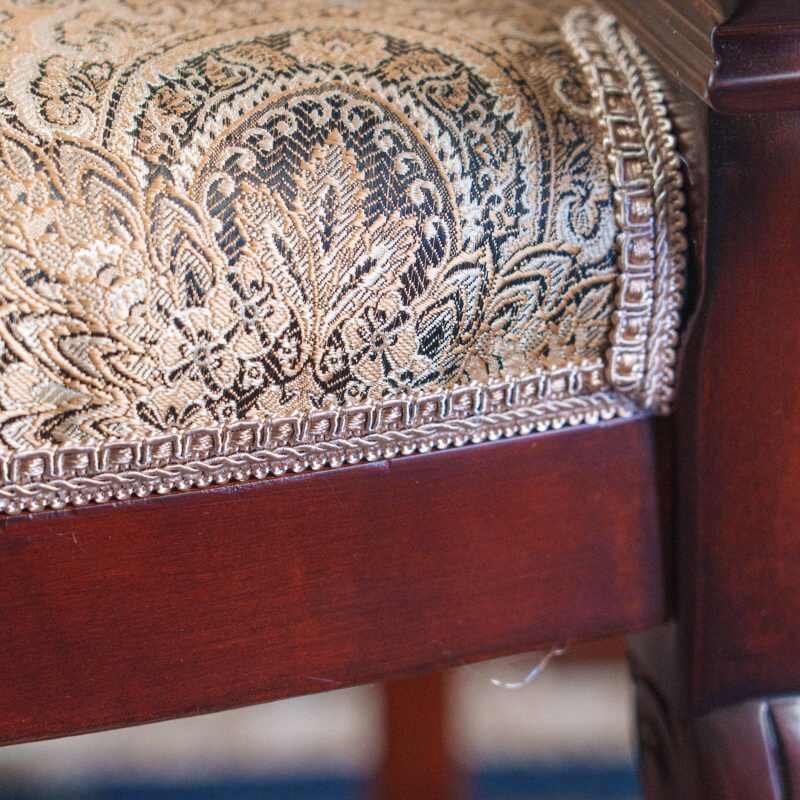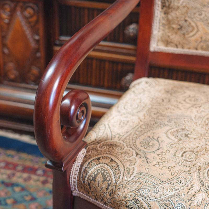 Цветовая палитра ткани включает теплые оттенки золота, коричневого и охры, что создает гармоничный контраст с темным тоном древесины. Деревянные подлокотники имеют элегантный изгиб и завершаются аккуратными резными завитками-волютами.