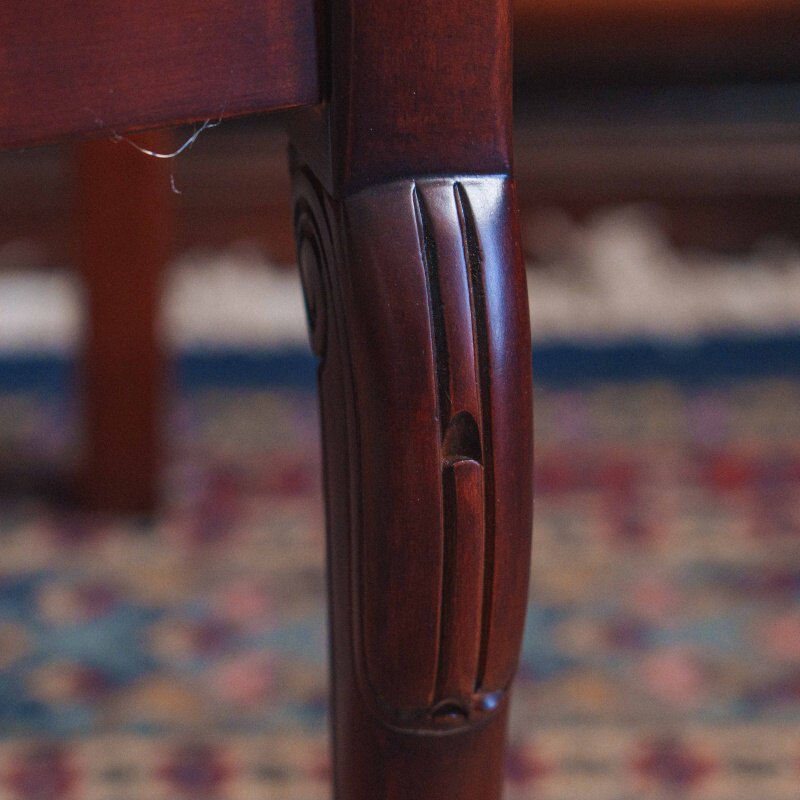 Это антикварное кресло представляет собой классический образец кабинетной мебели, сочетающий в себе строгую геометрию каркаса и богатую фактуру обивки. Изделие выполнено из темного дерева с гладкой полированной поверхностью, которая выигрышно подчеркивает благородный силуэт предмета.