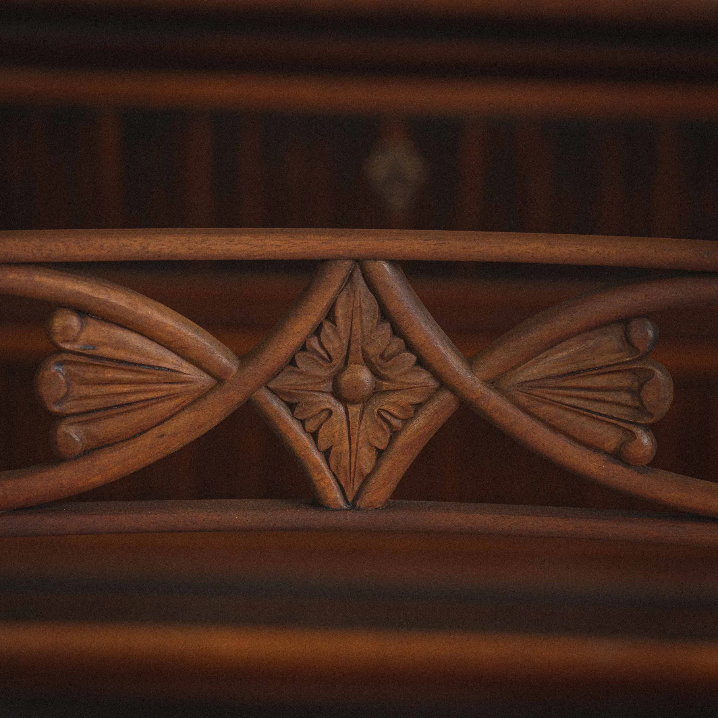 Каркас изготовлен из благородной древесины тёплого орехового оттенка, покрытой мягким, шелковистым полированным лаком, который подчёркивает естественный рисунок волокон. Спинка невысокая, изящно изогнутая, с открытой центральной частью, украшенной геометрическим резным элементом — изящной ромбовидной композицией с тонкими перекладинами. Этот декоративный мотив придаёт креслу особую лёгкость и художественную выразительность. Подлокотники плавно переходят из спинки, образуя цельную, текучую линию. Их изгиб мягкий и эргономичный, с аккуратно закрученными волютами на передних окончаниях — характерная деталь, добавляющая благородства и декоративности.