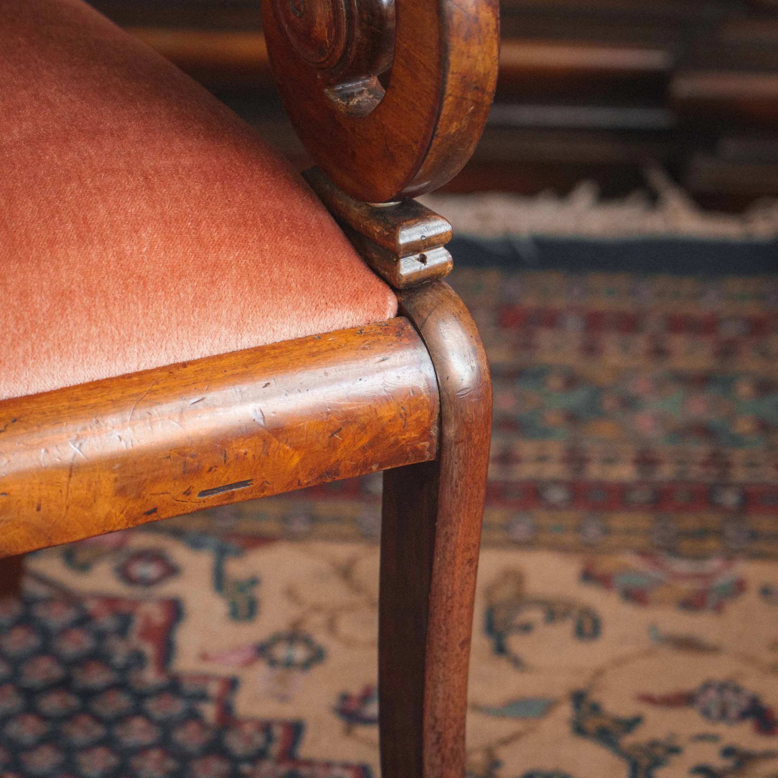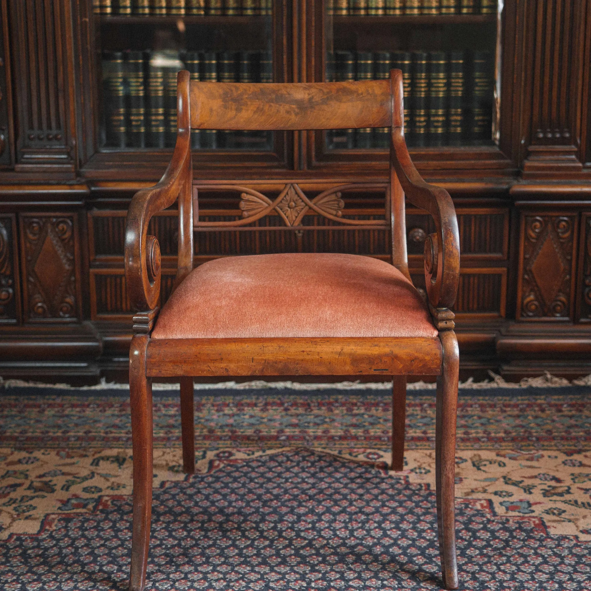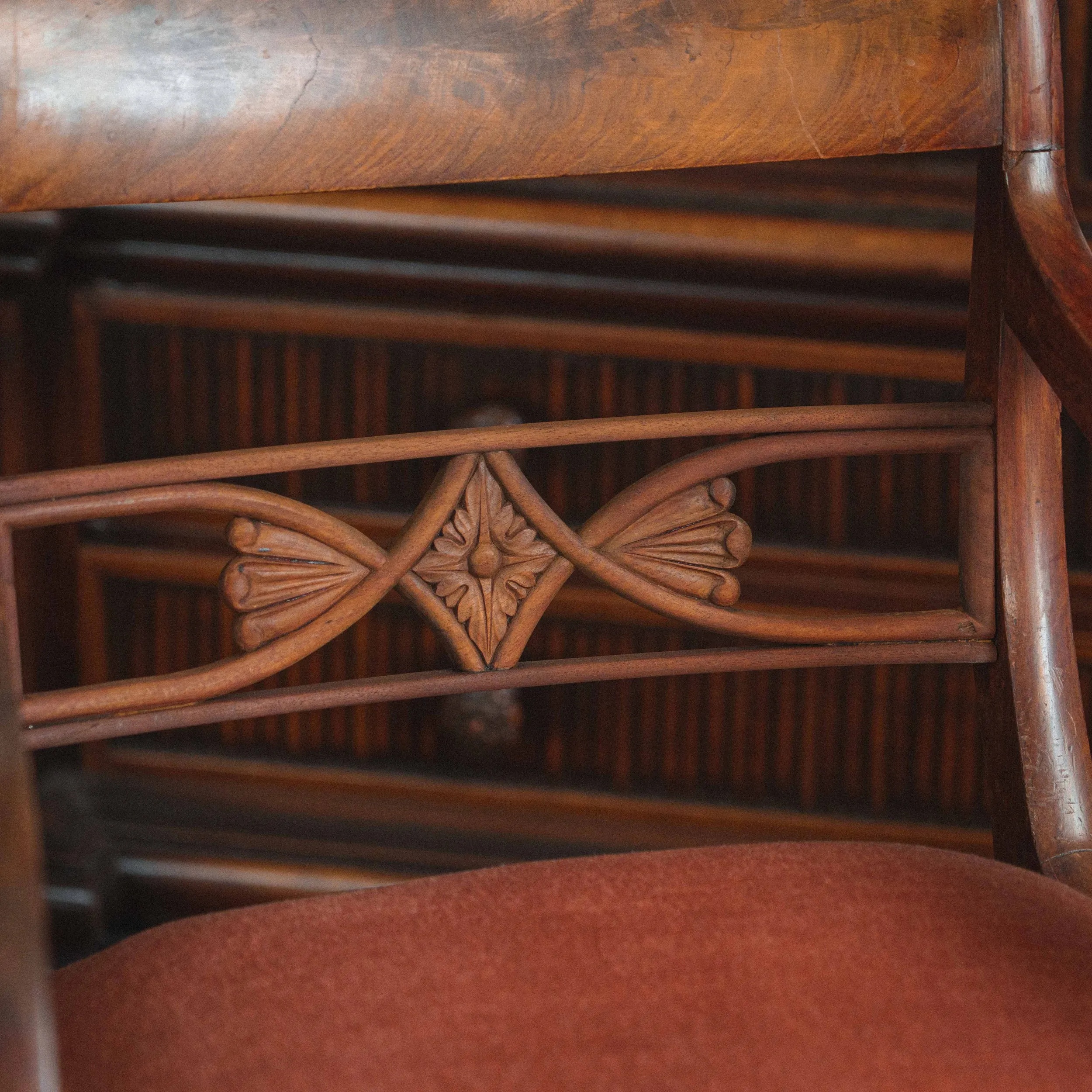 Перед нами изящное антикварное кресло, выполненное в классической манере с явным влиянием неоклассицизма и позднего ампира. Его силуэт легок и гармоничен: тонкие, плавно изогнутые ножки сужаются книзу, придавая всей конструкции ощущение воздушности и утончённой грации.