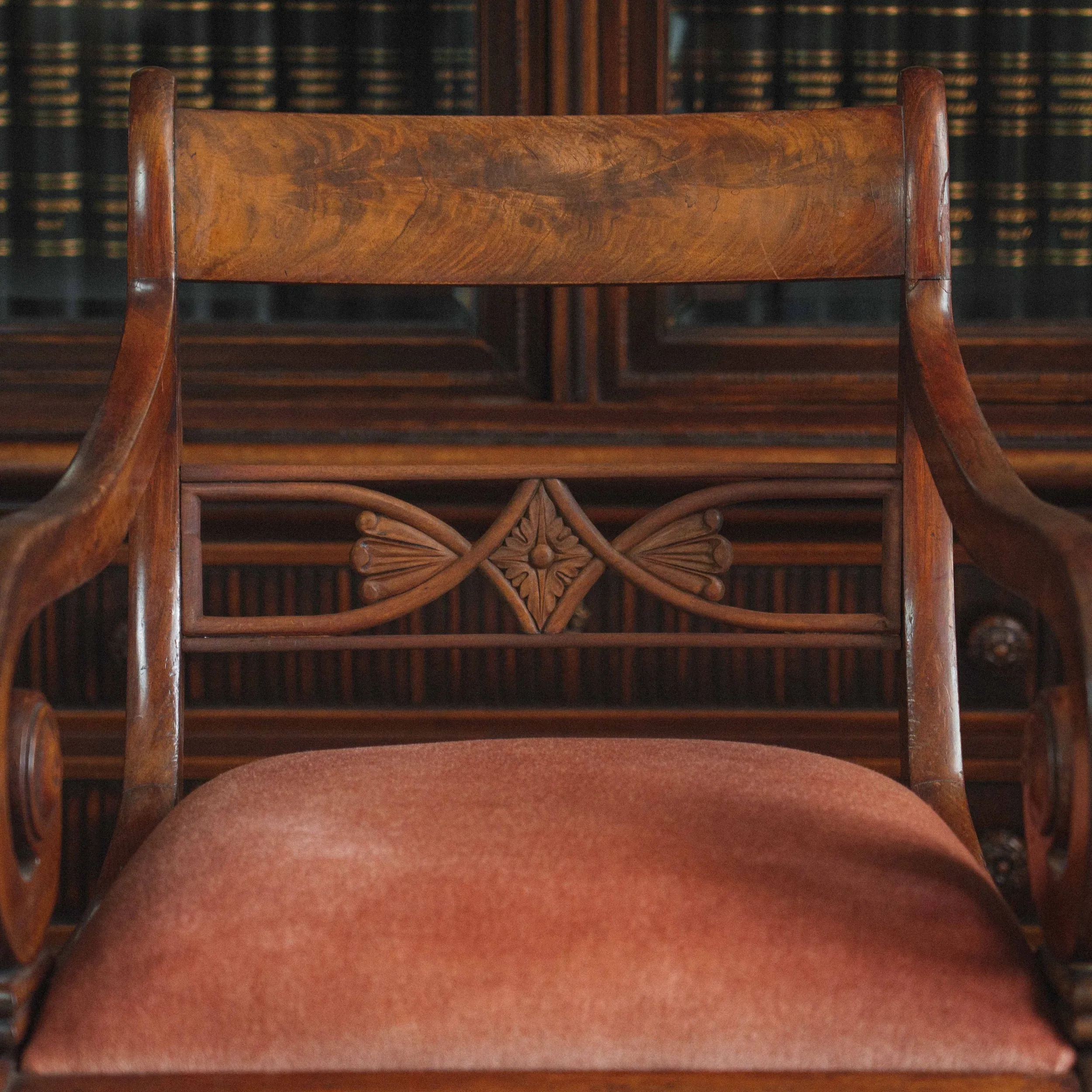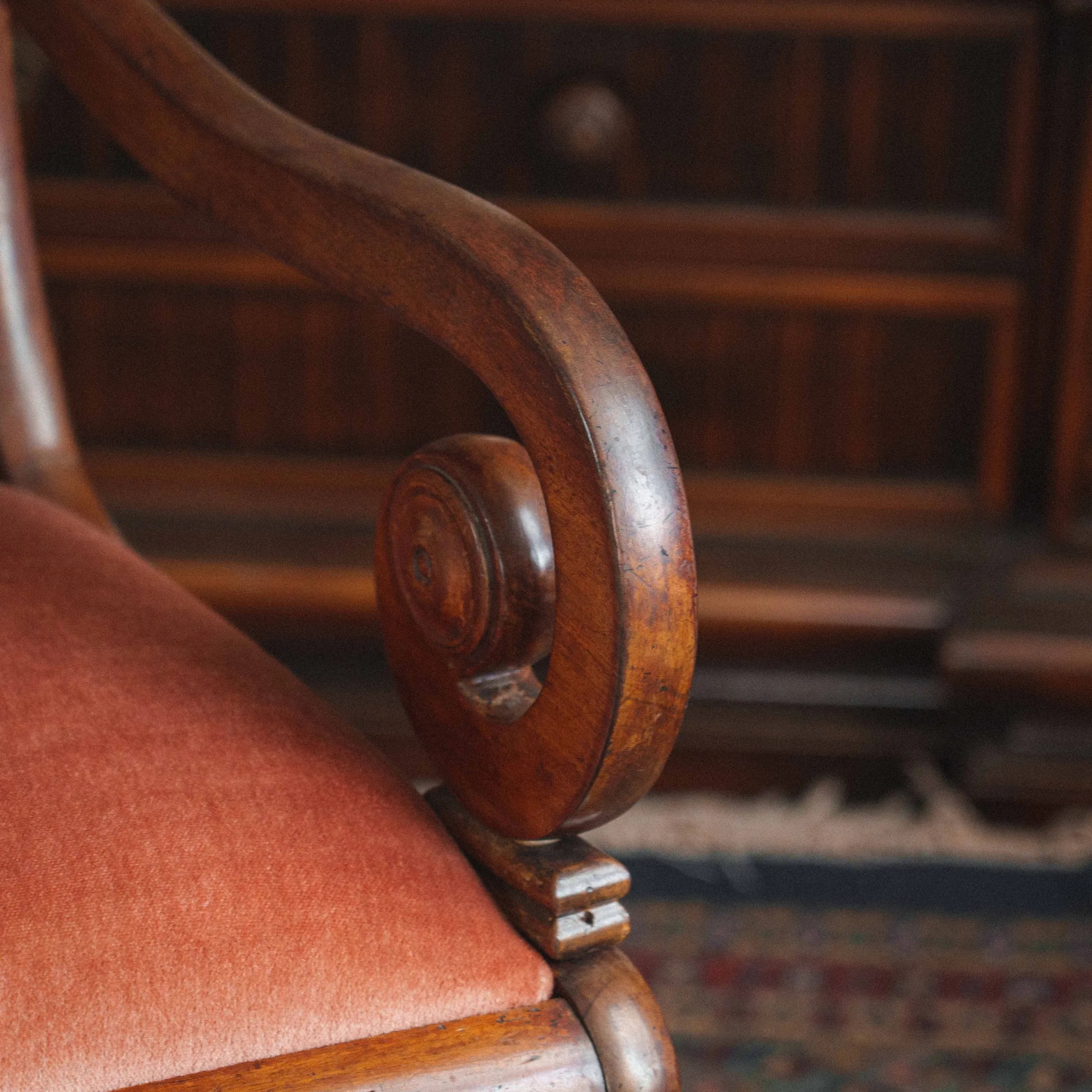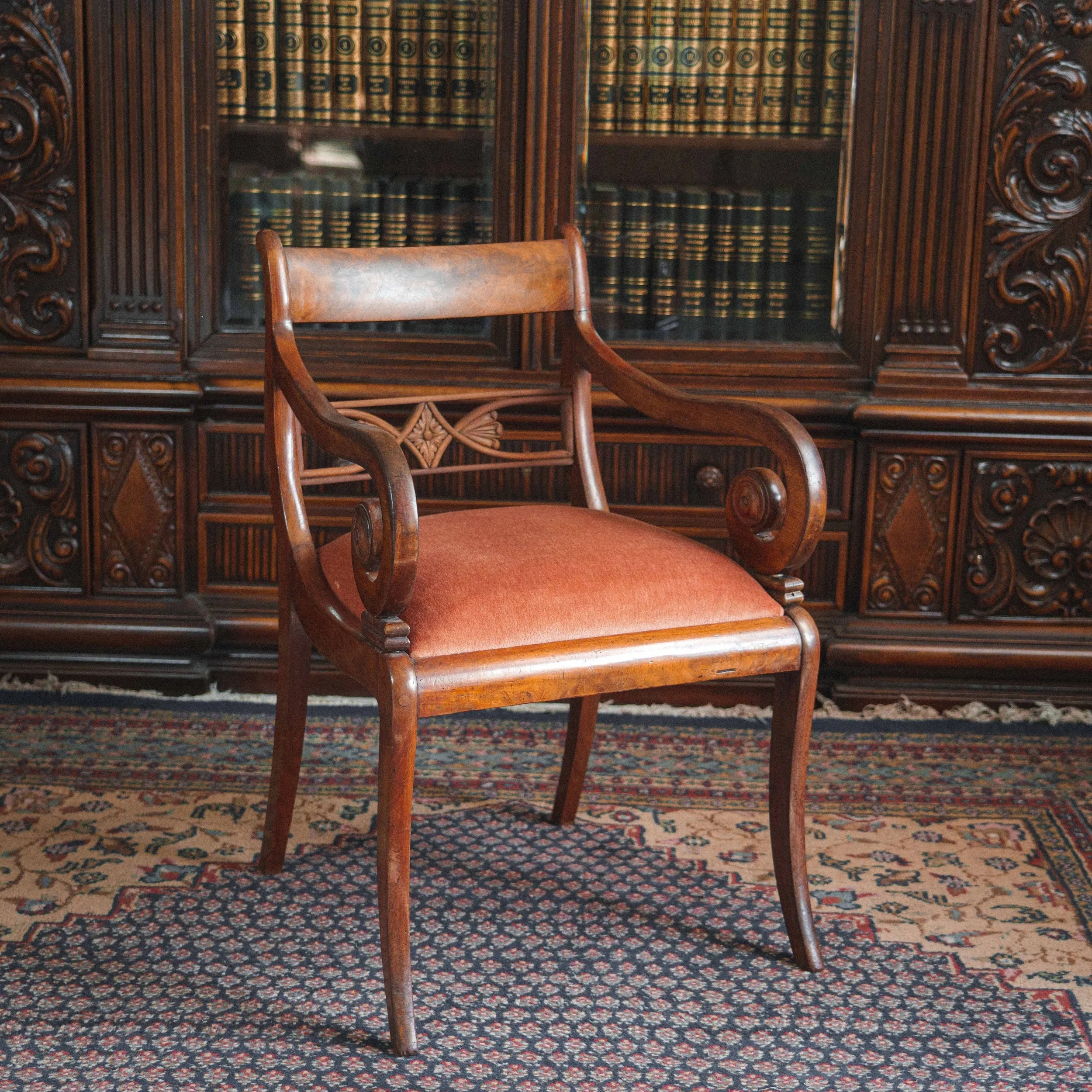 Перед нами изящное антикварное кресло, выполненное в классической манере с явным влиянием неоклассицизма и позднего ампира. Его силуэт легок и гармоничен: тонкие, плавно изогнутые ножки сужаются книзу, придавая всей конструкции ощущение воздушности и утончённой грации.