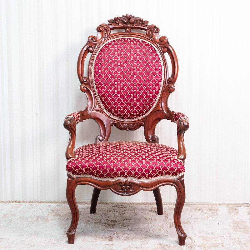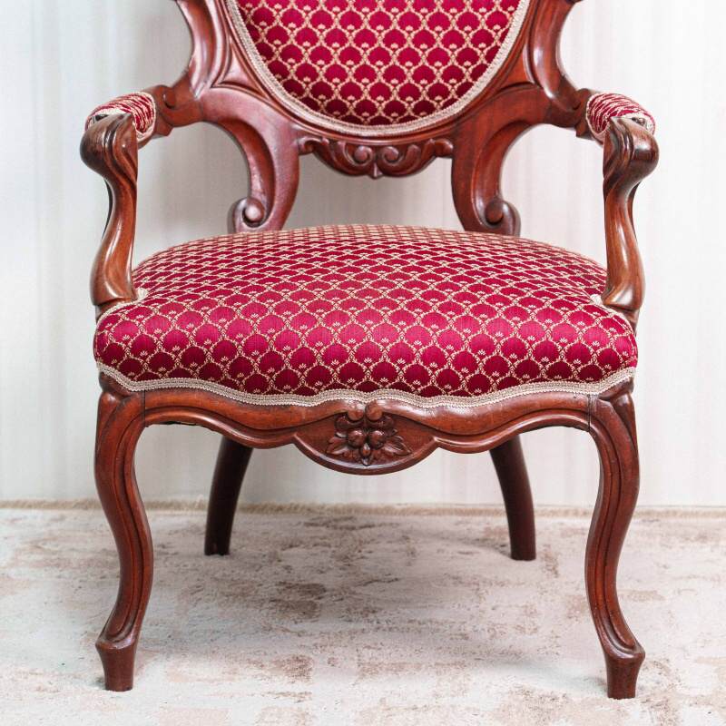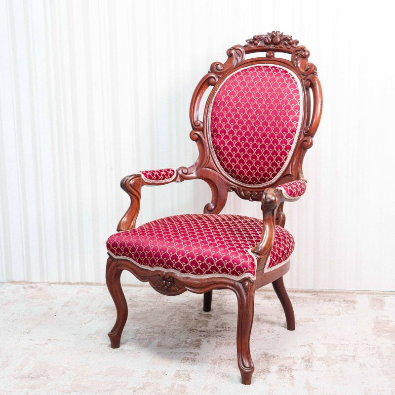 Это антикварное кресло является характерным образцом мебели в стиле Луи-Филиппа, для которого свойственна рациональность форм, комфорт и мягкие, плавные линии каркаса.