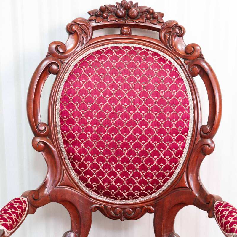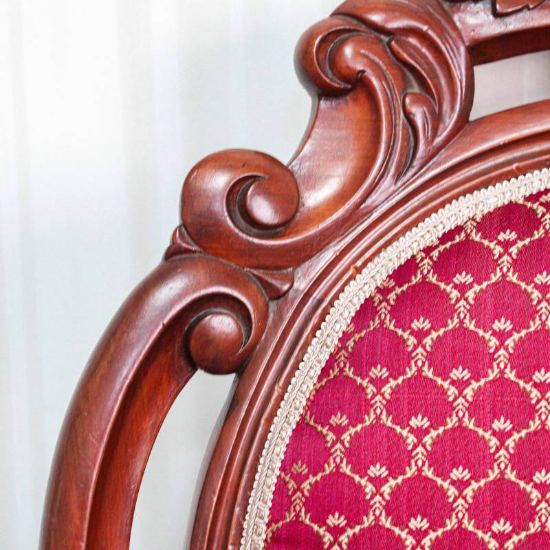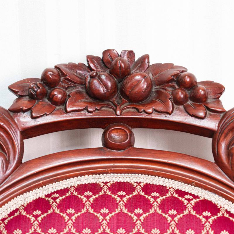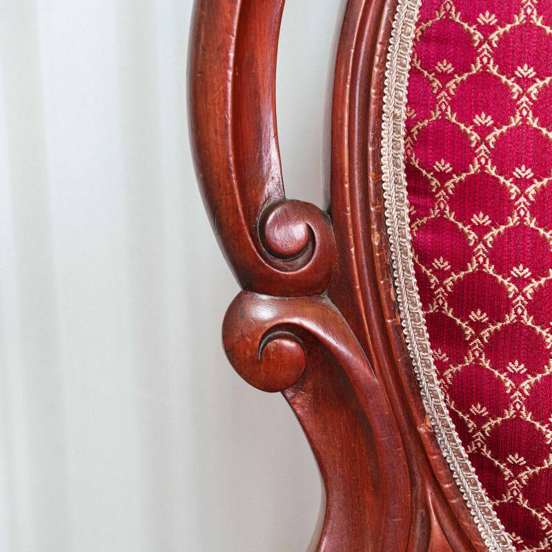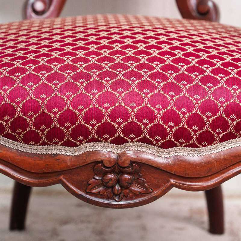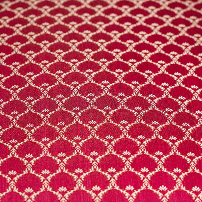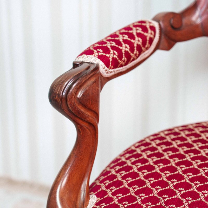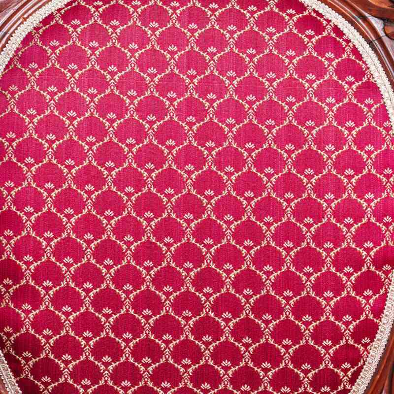 Глубокое и широкое сиденье, как и спинка, обито плотной жаккардовой тканью насыщенного красного цвета, украшенной повторяющимся золотистым орнаментом в виде классических медальонов.