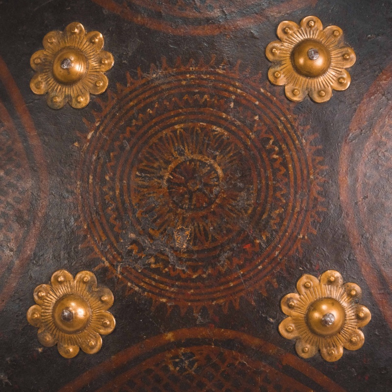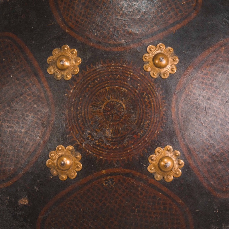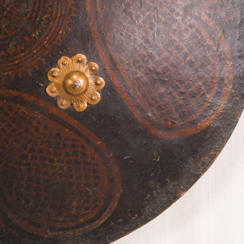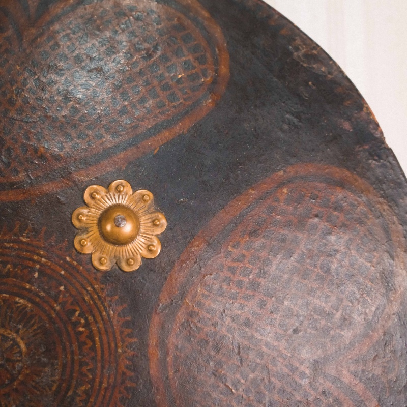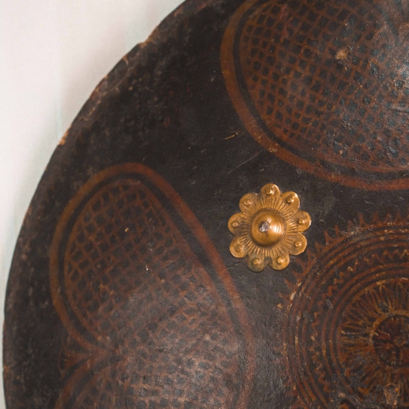 Круглый кожаный щит типа дхал, выполненный в индо-персидской традиции, представляет собой характерный образец восточного защитного вооружения, распространённого на территории Индии и Персии в период позднего Средневековья — XIX века. Подобные щиты использовались как в боевых условиях, так и в церемониальном и парадном контексте.