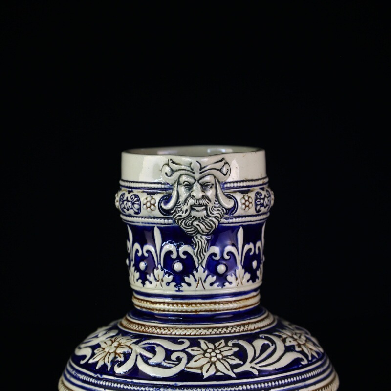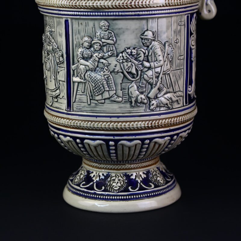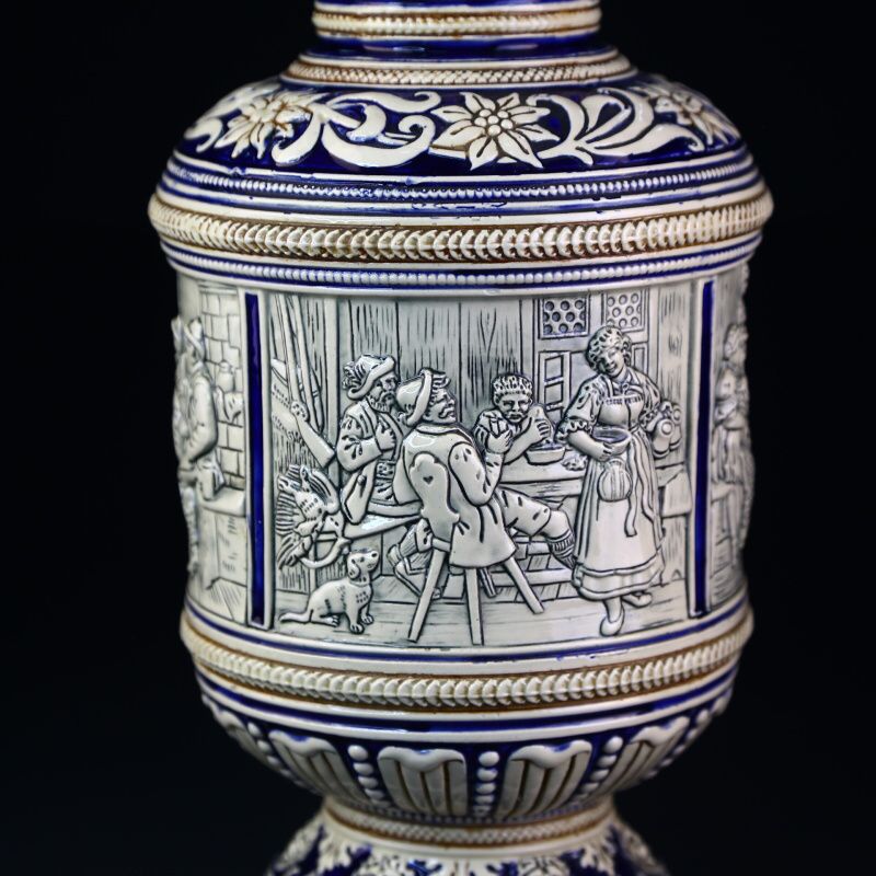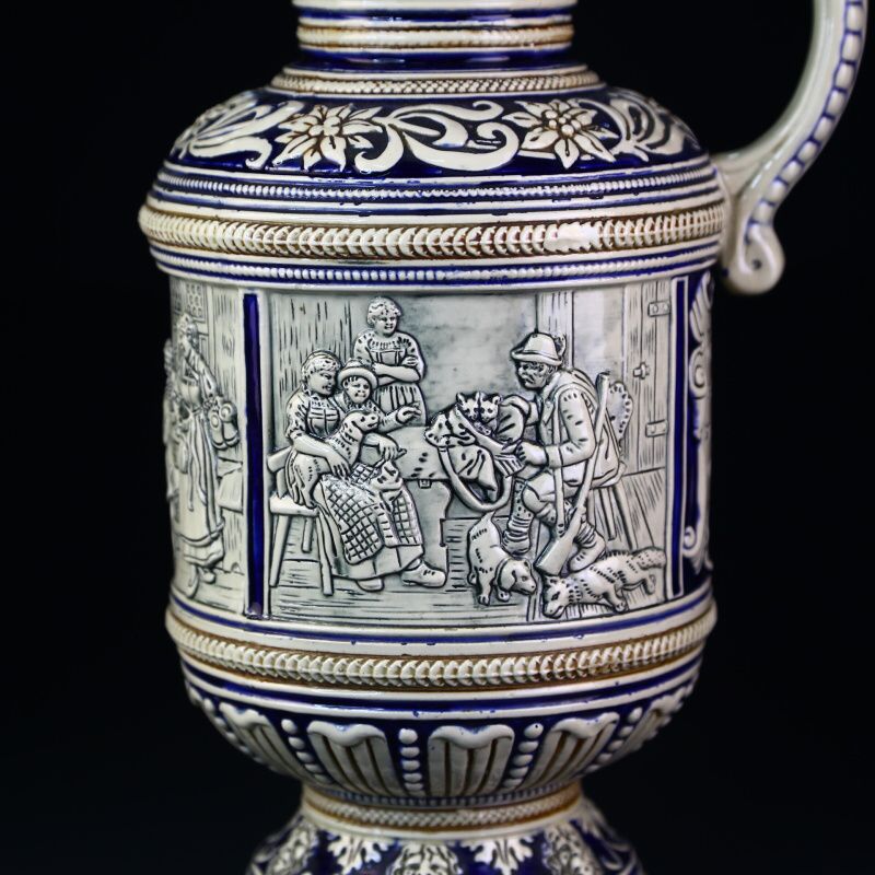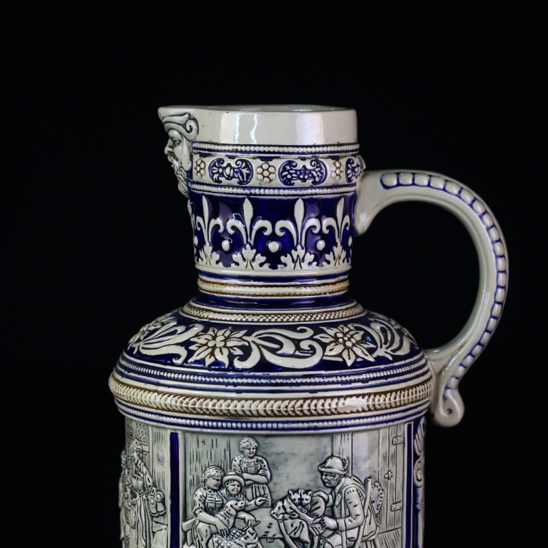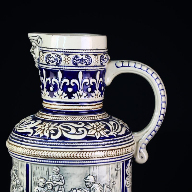 Большой немецкий пивной кувшин выполнен в классической технике рельефного декора, расписан синей краской и покрыт солевой глазурью. Поверхность кувшина украшают сюжетные композиции с изображением сюжетных классических немецких композиций с охотниками и застольями.