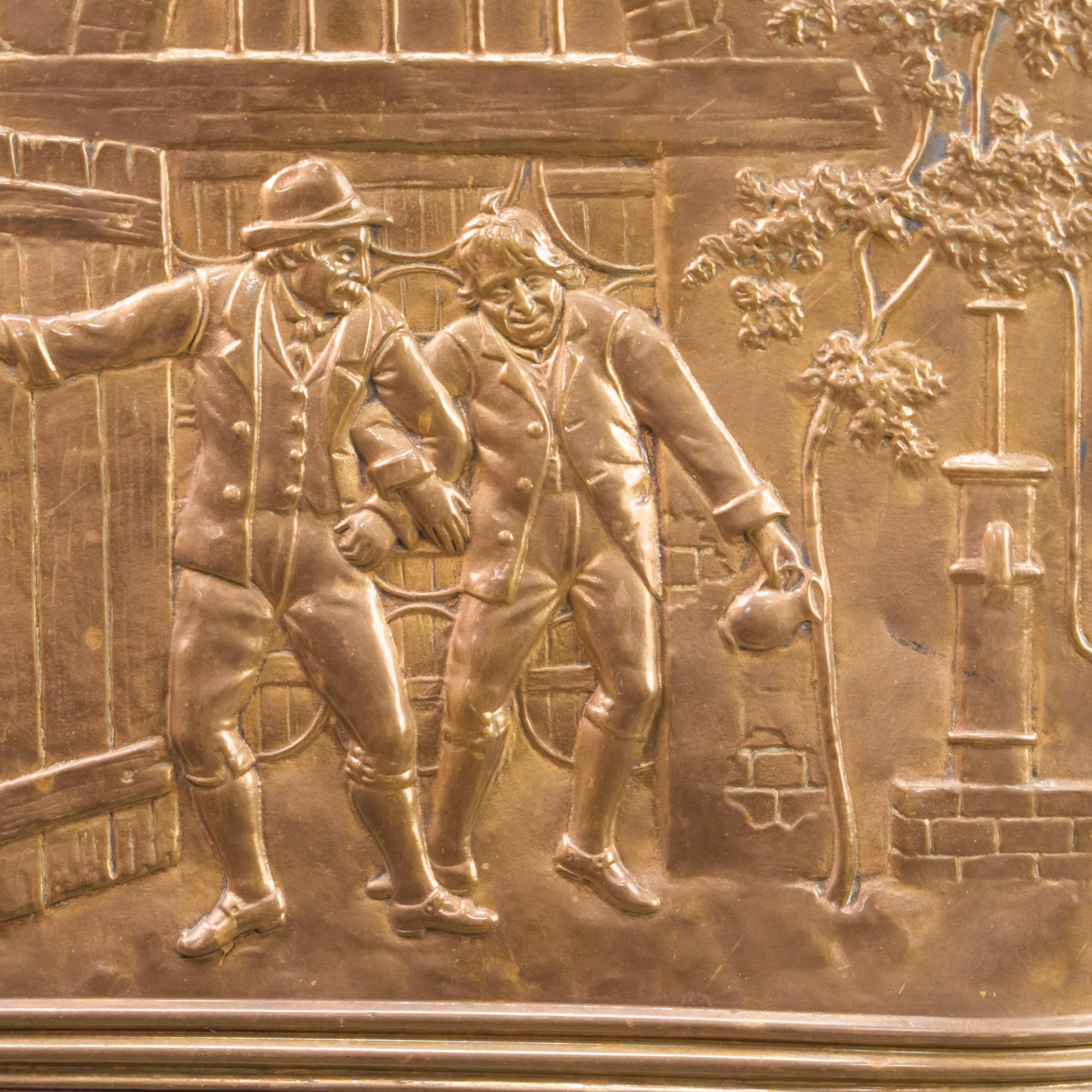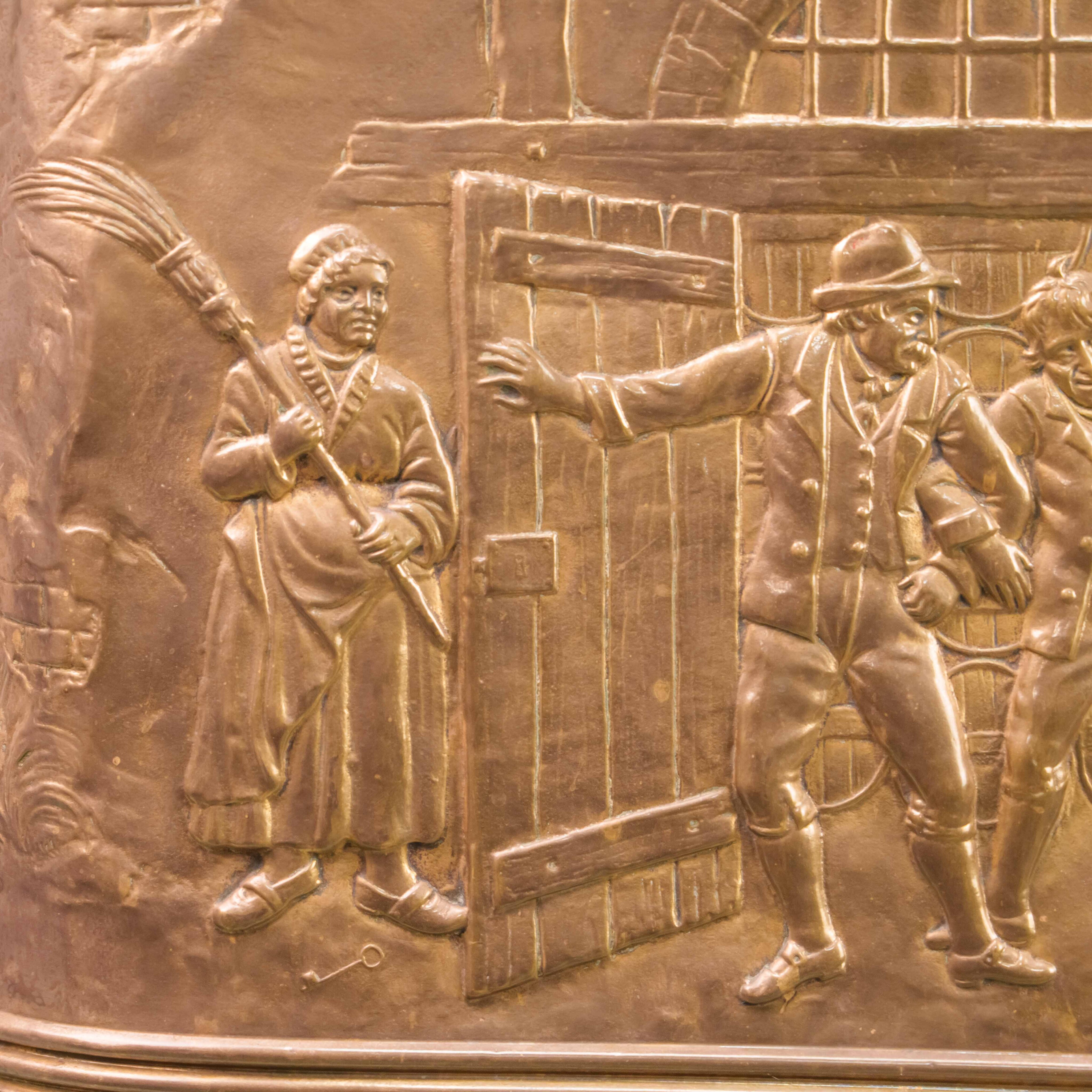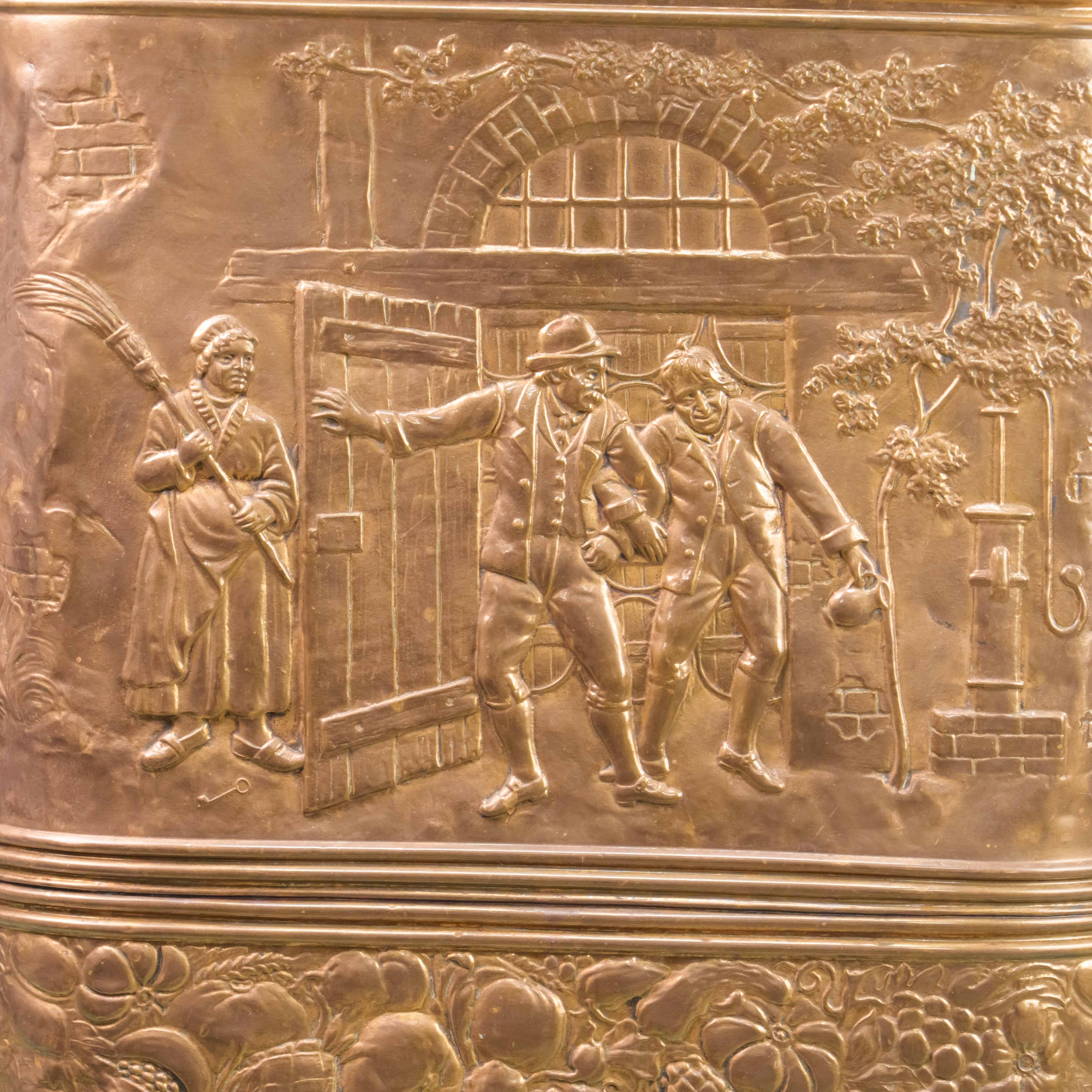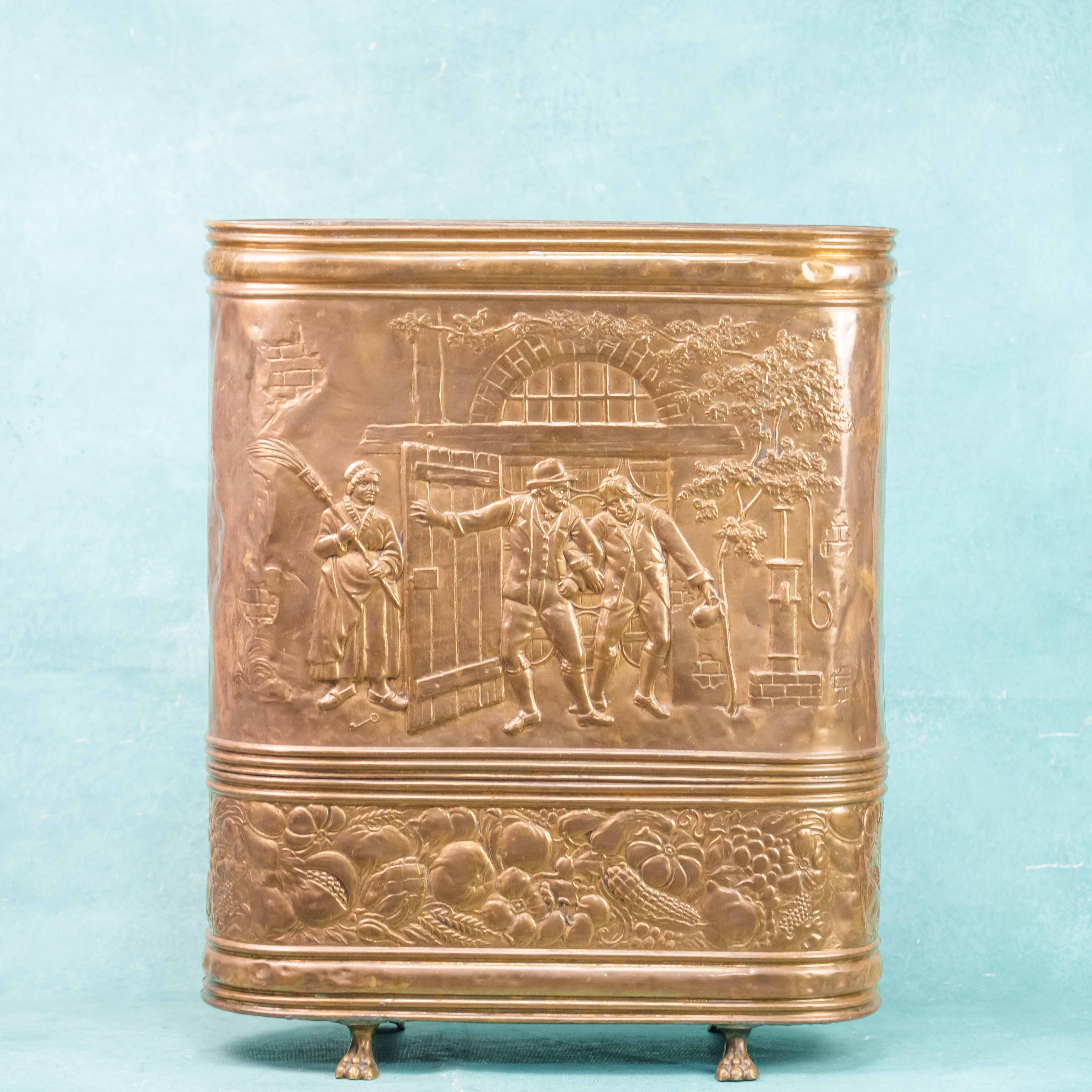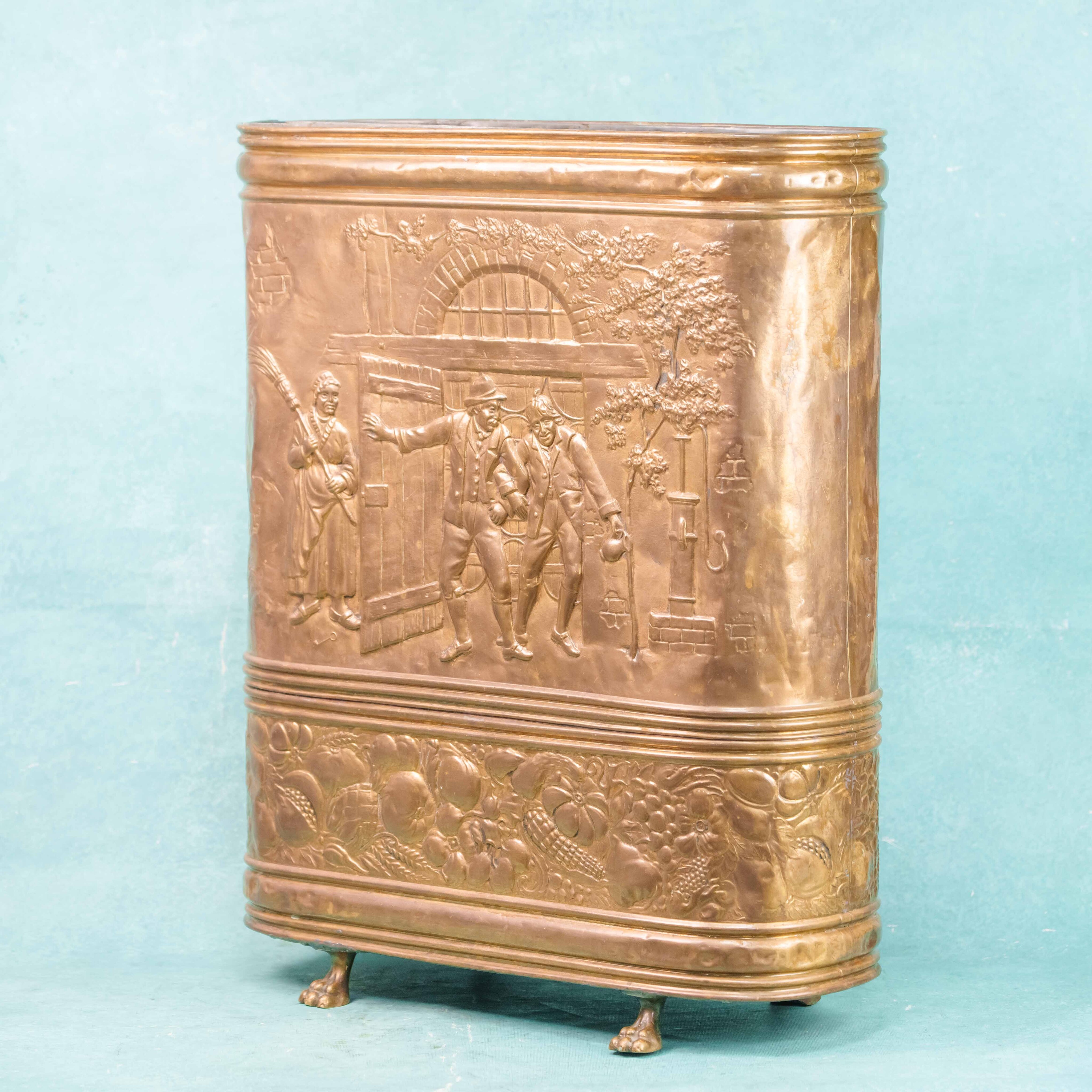Эта антикварная зонтница представляет собой высокий вертикальный контейнер с овальным сечением, выполненный из полированной латуни, что придает ей характерный теплый золотистый блеск. Основным украшением предмета является масштабная художественная чеканка, занимающая всю лицевую панель и изображающая детальную жанровую сцену в рустикальном стиле. На барельефе запечатлена группа людей в традиционных старинных одеждах возле входа в таверну или сельский дом: мужчина в шляпе жестикулирует перед спутниками, в то время как рядом стоит женщина с метлой, а на заднем плане видны элементы пейзажа, включая дерево и колодец. Нижняя часть зонтницы отделена горизонтальным рельефным пояском и декорирована широким фризом с обильным натюрмортом из различных плодов, фруктов и колосьев, что символизирует плодородие и достаток. Конструкция опирается на небольшие литые ножки, выполненные в классической форме львиных лап, что добавляет предмету устойчивости и завершенности.