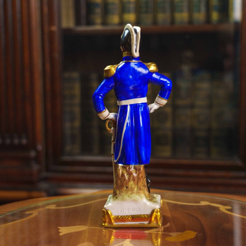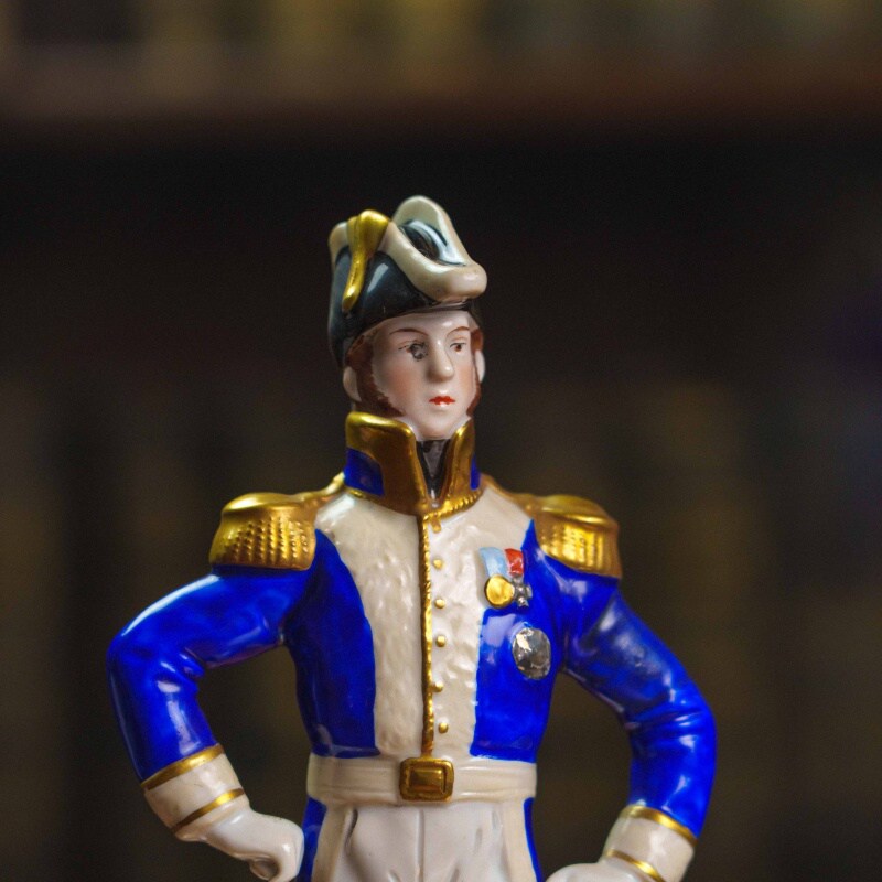 Треуголка с белым султаном, тщательная ручная роспись, насыщенная цветовая палитра и аккуратно прорисованные детали мундира делают фигурку эффектной интерьерной миниатюрой.