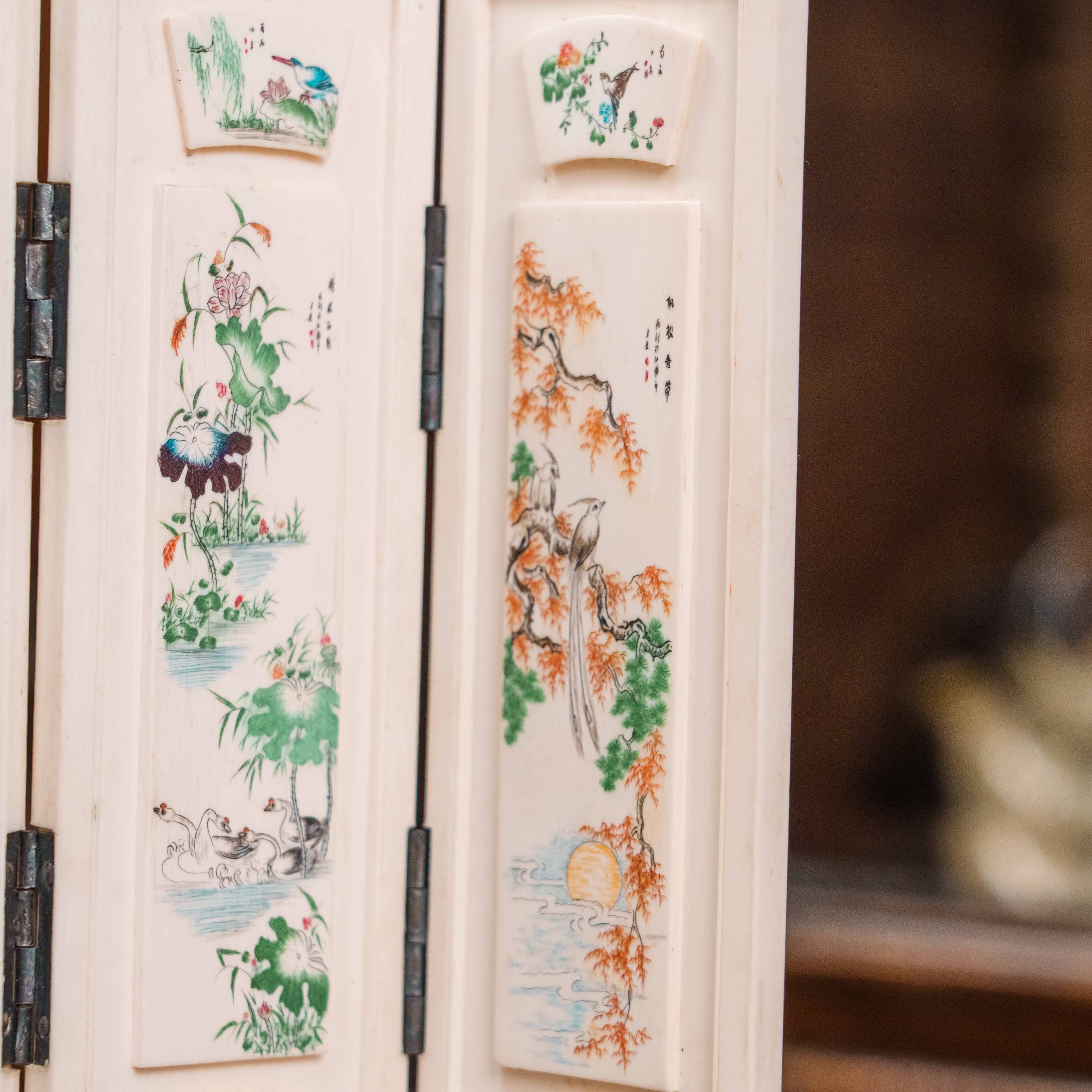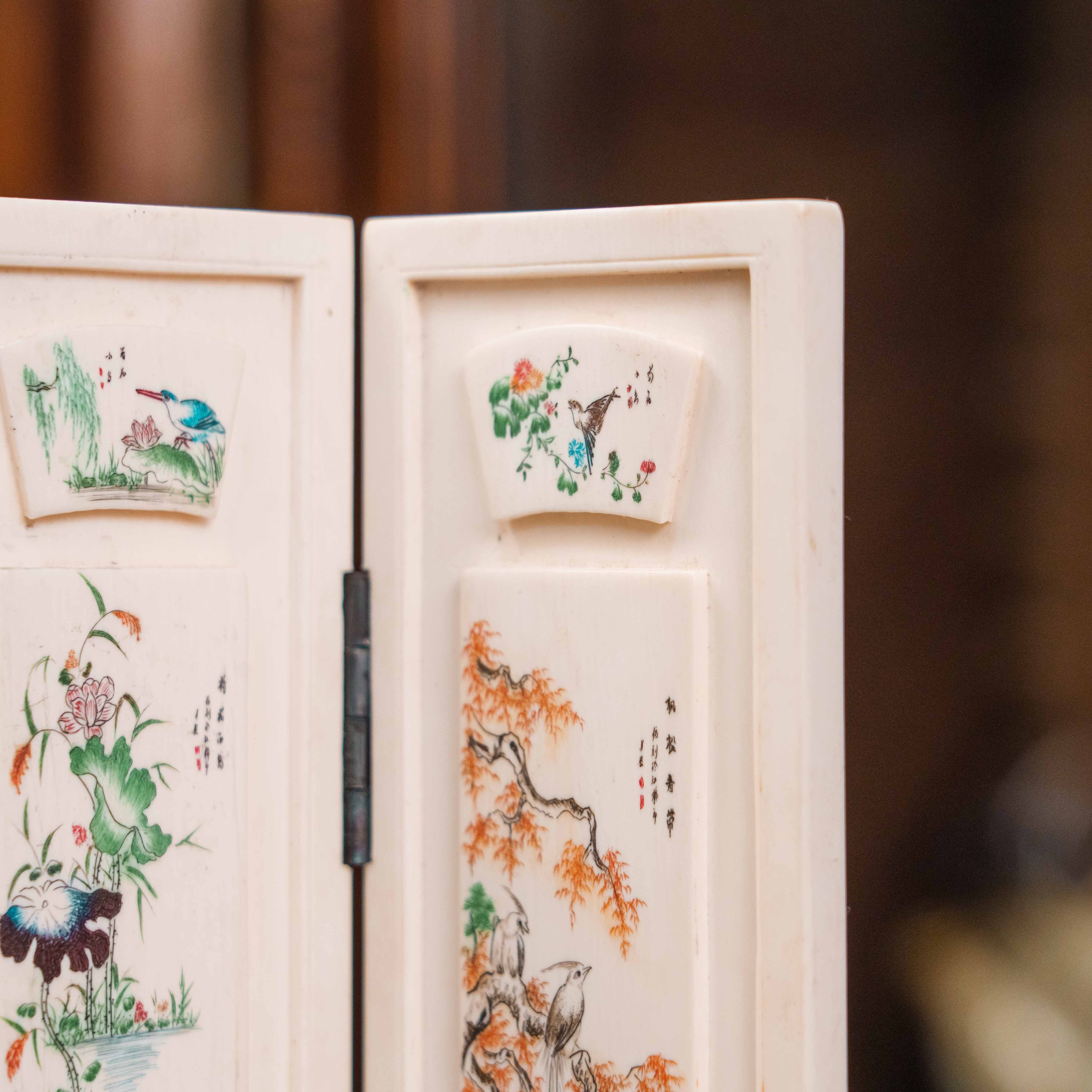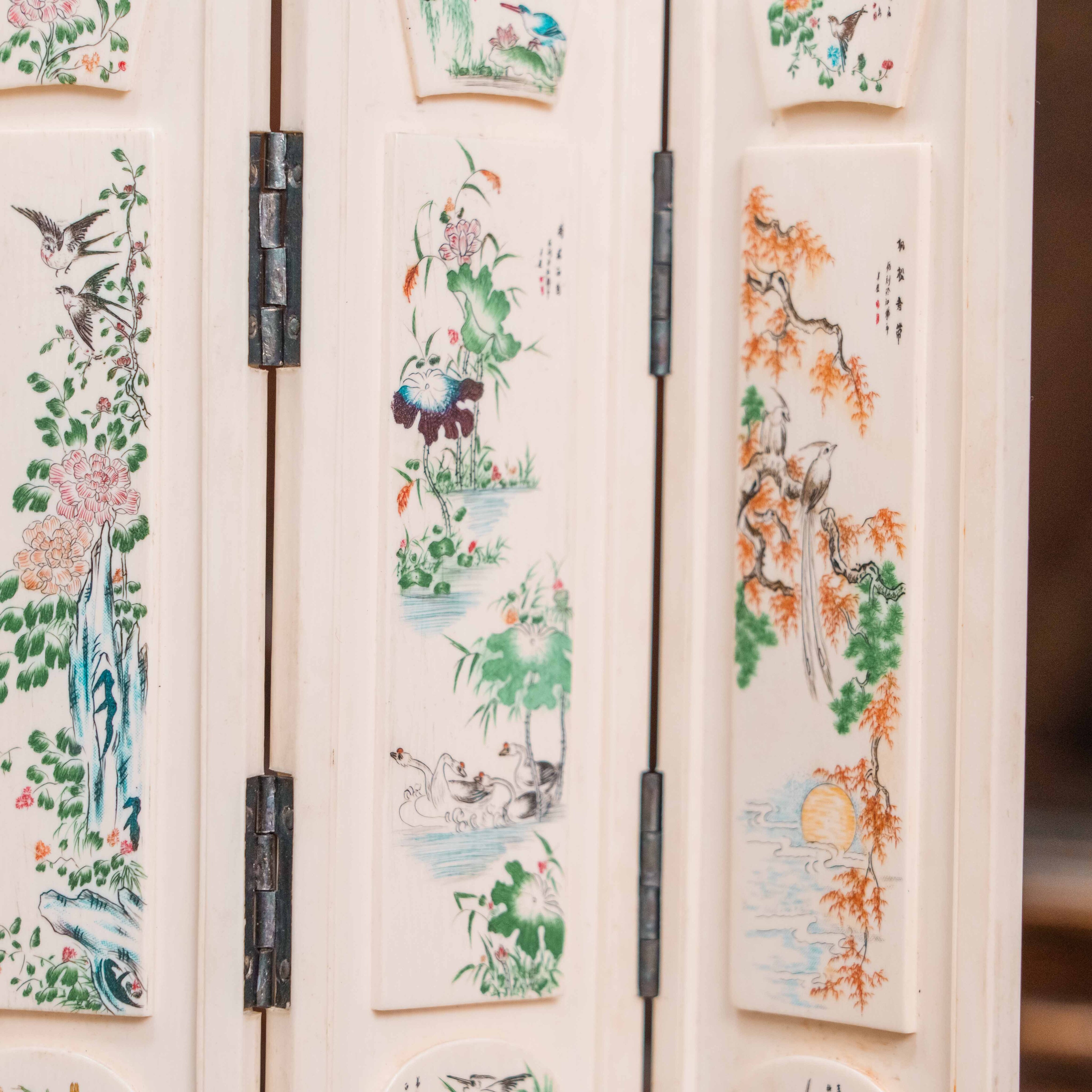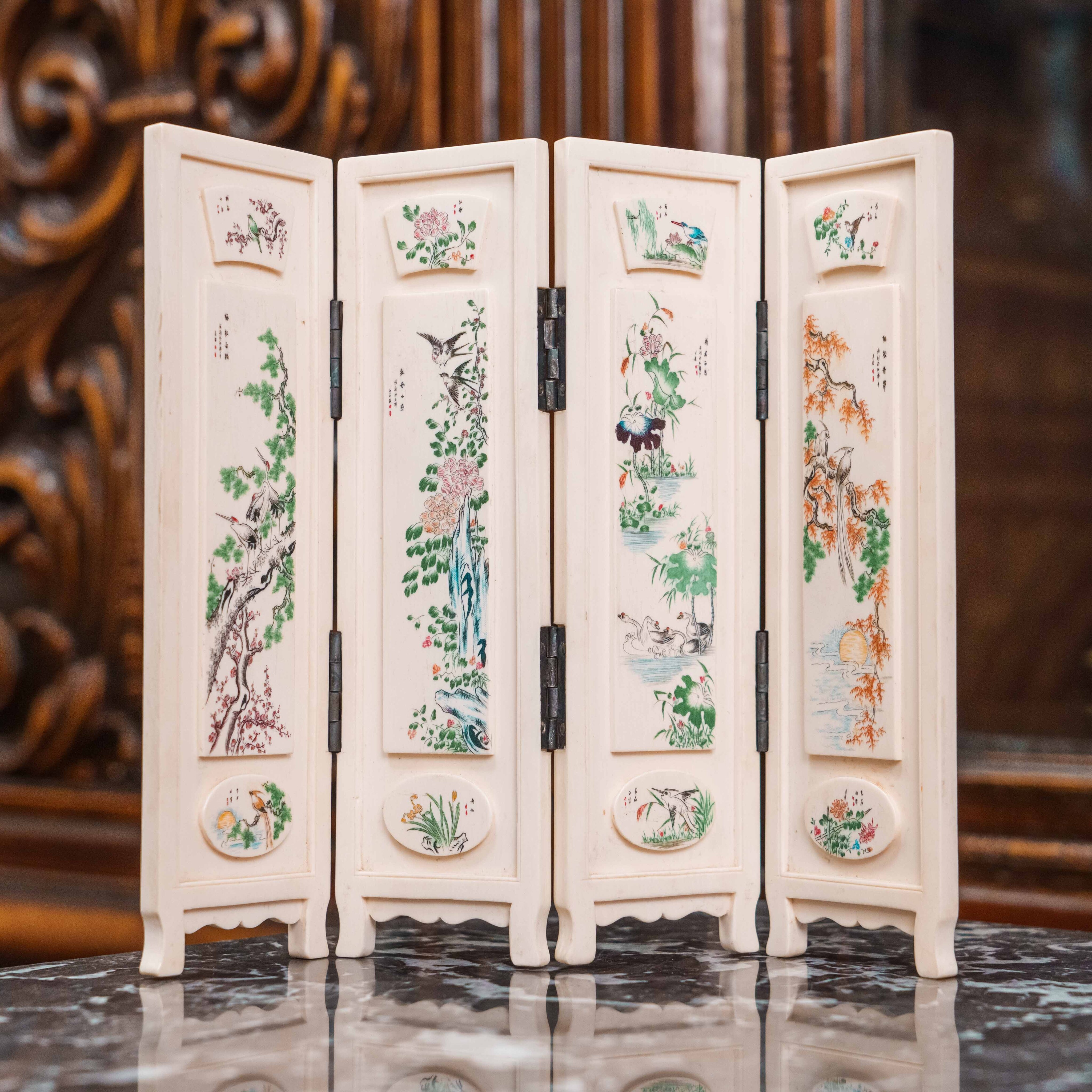 Миниатюрная настольная ширма, выполненная в китайском стиле. Такие изделия, также известные как пинфэн (屏风), что означает «защита от ветра», традиционно используются для зонирования пространства или в качестве декоративного элемента интерьера. Декоративный предмет интерьера, часто используемый как сувенир или украшение стола. Изделие выполнено в стиле шинуазри (Chinoiserie) или традиционном китайском стиле, для которого характерны узоры с изображением птиц, цветов и пейзажей. Каждый из четырех экранов имеет уникальный рисунок. Выполнена из слоновой кости китайским мастером.