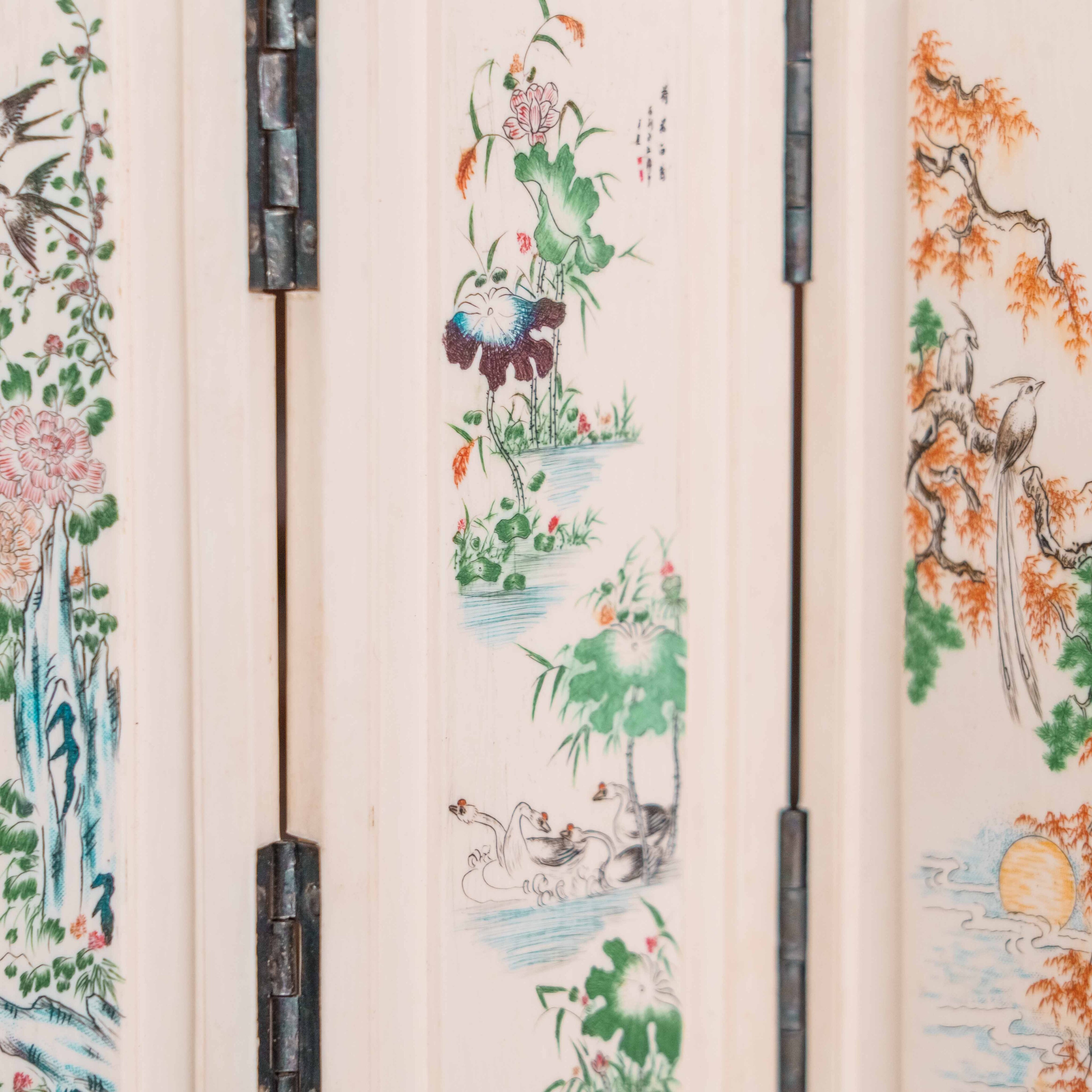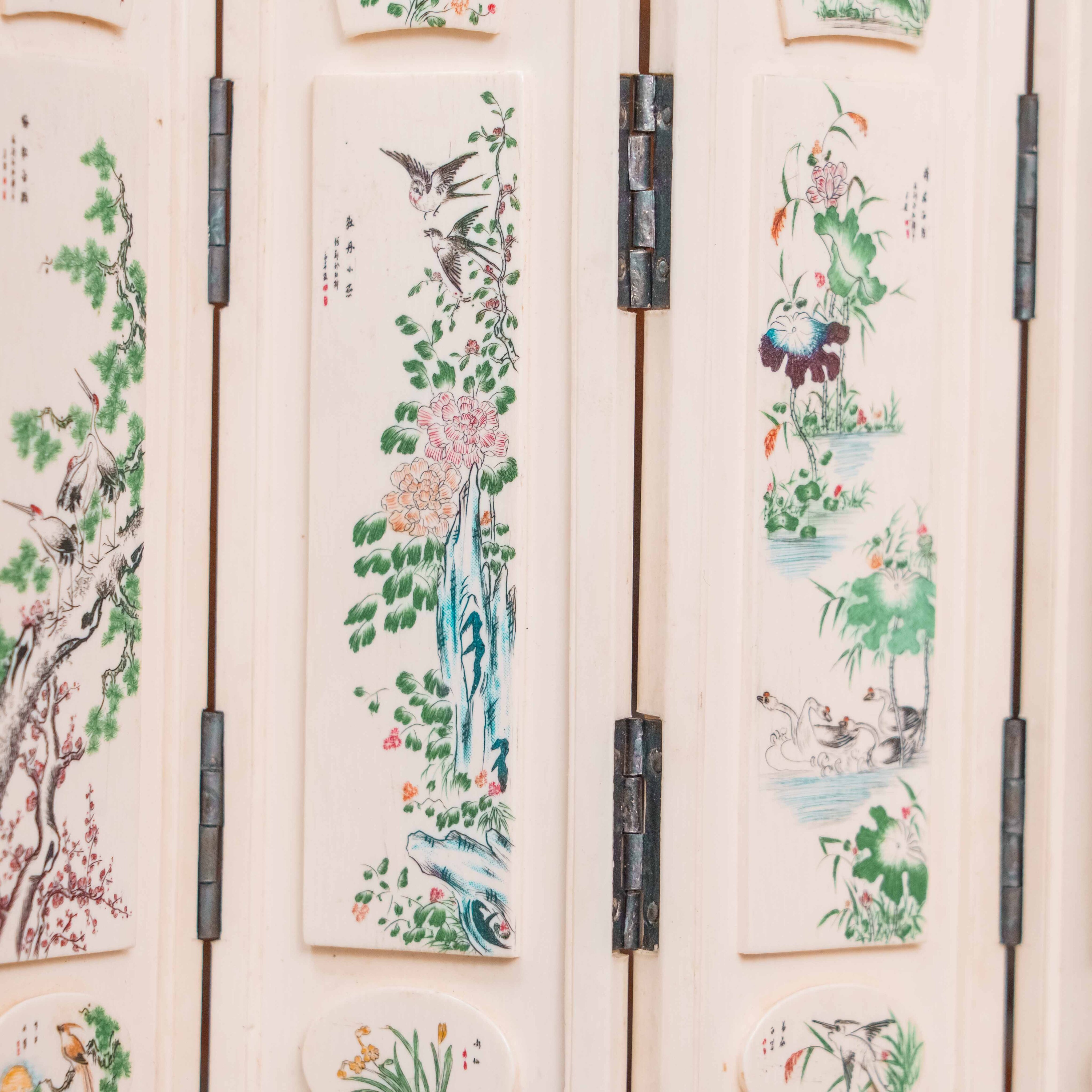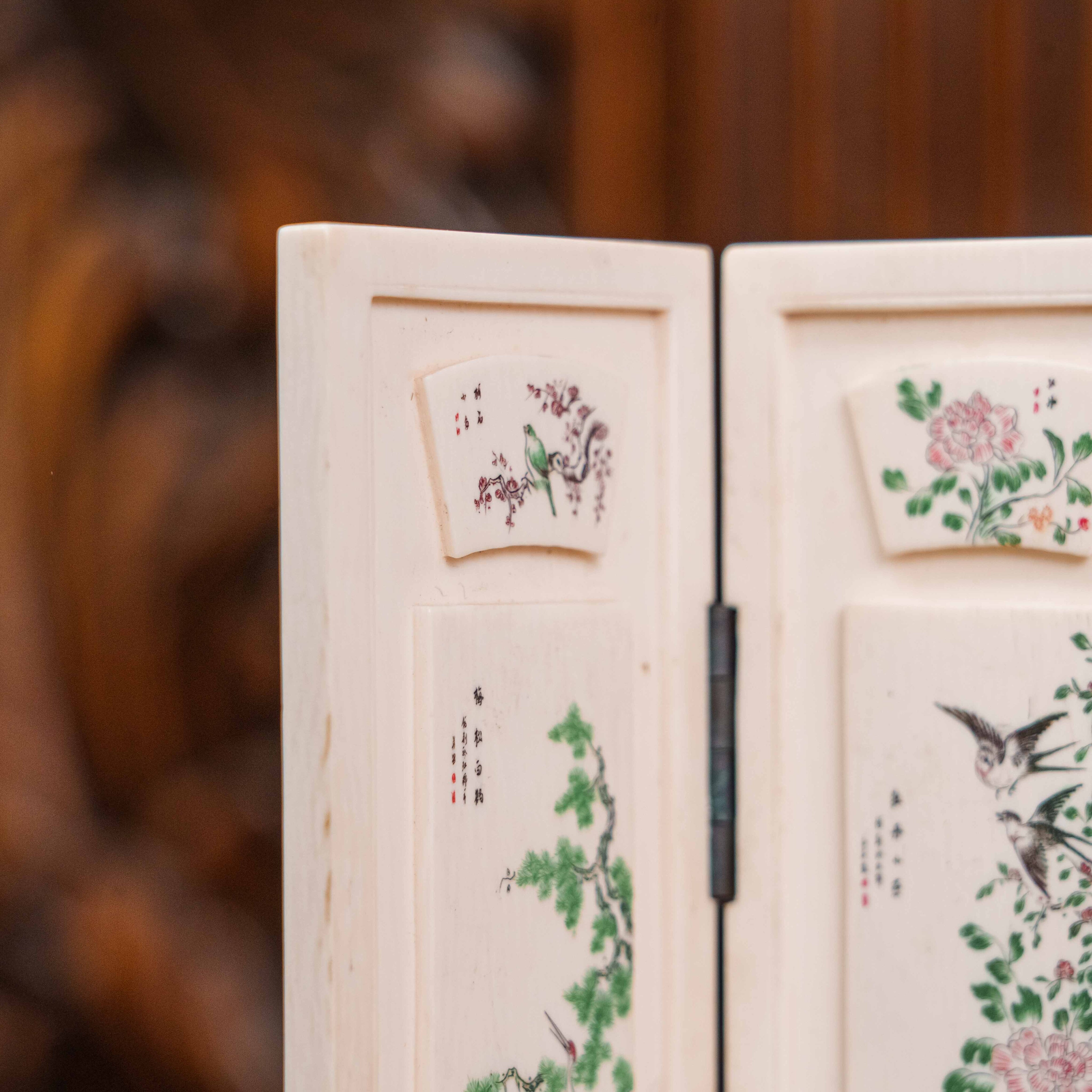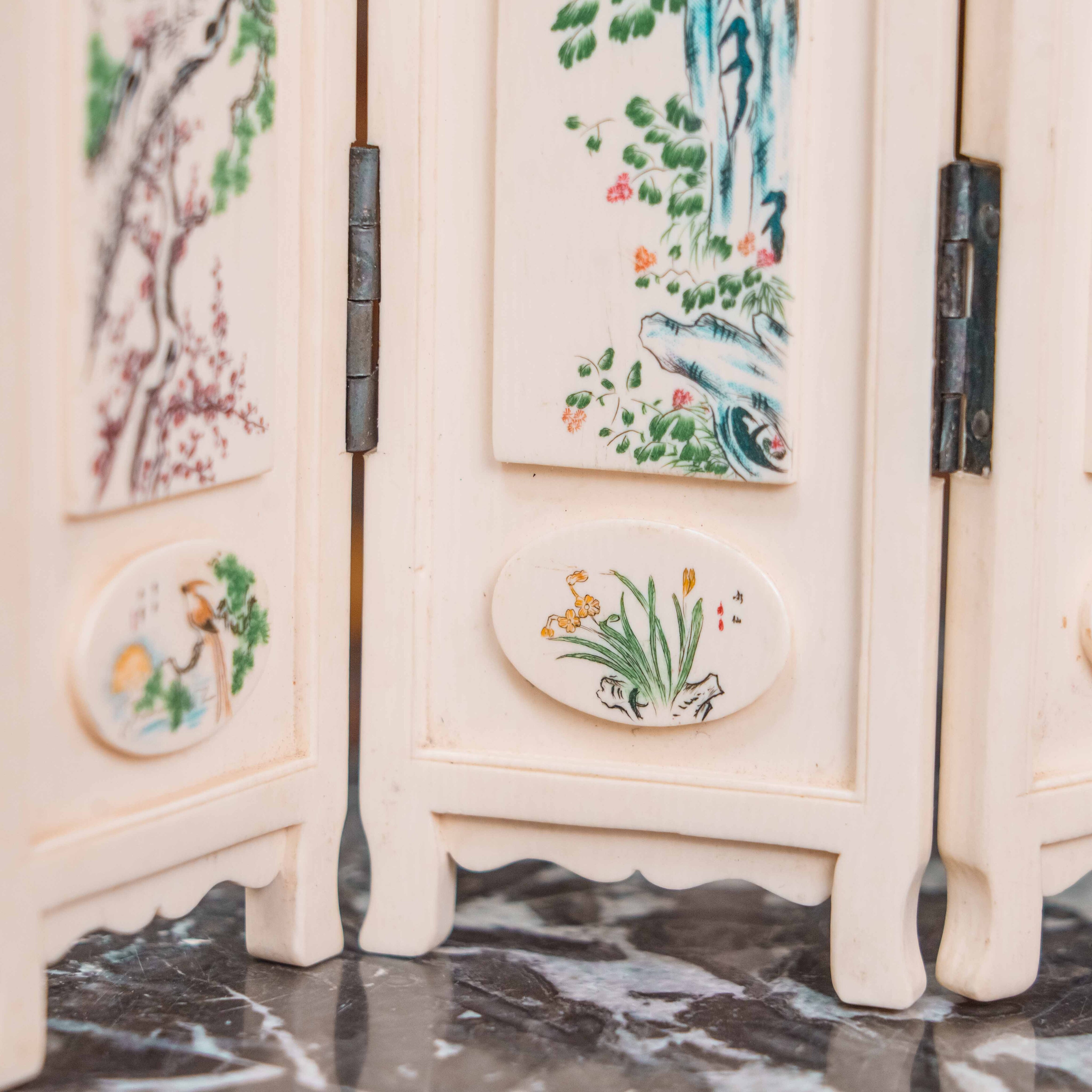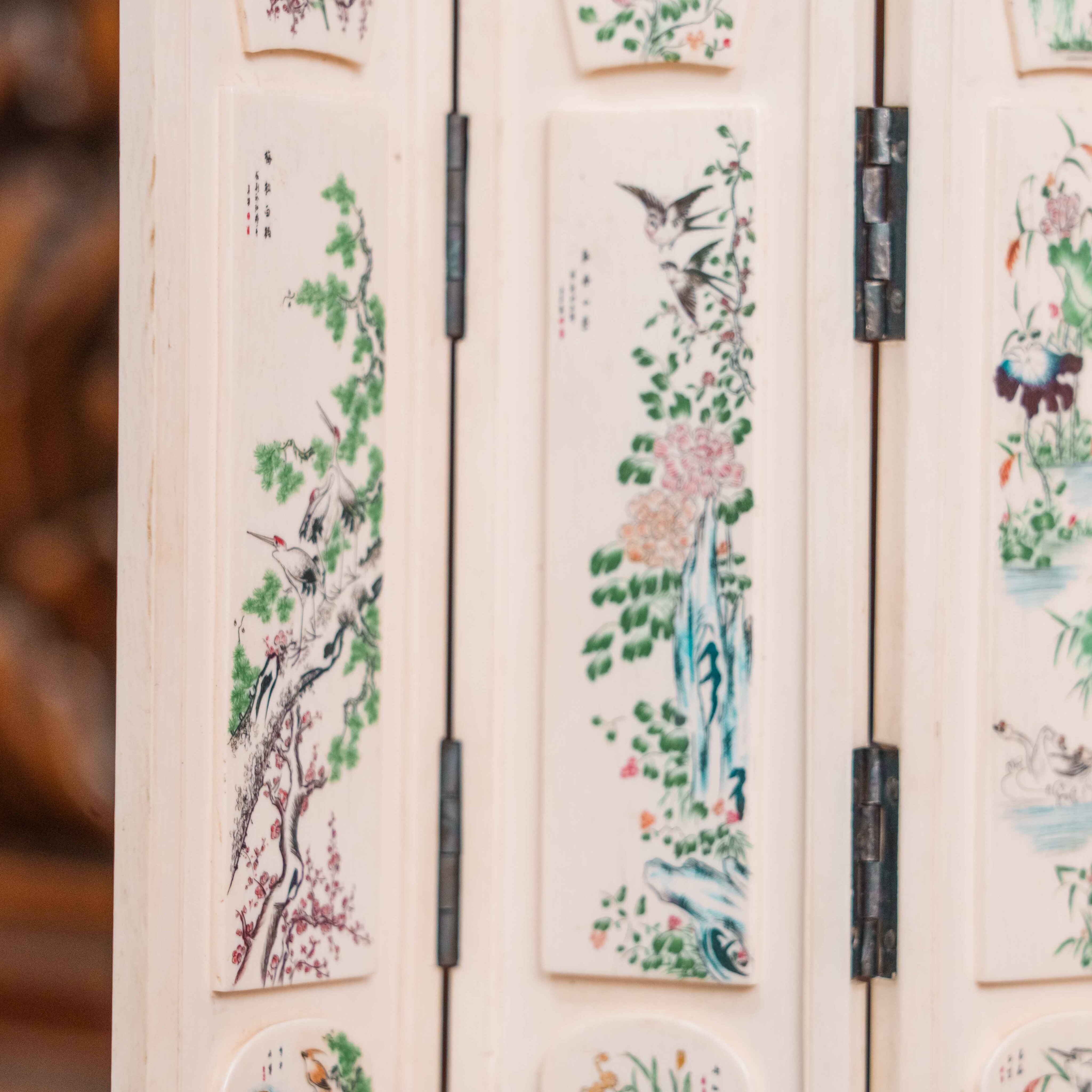 Миниатюрная настольная ширма, выполненная в китайском стиле. Такие изделия, также известные как пинфэн (屏风), что означает «защита от ветра», традиционно используются для зонирования пространства или в качестве декоративного элемента интерьера. Декоративный предмет интерьера, часто используемый как сувенир или украшение стола. Изделие выполнено в стиле шинуазри (Chinoiserie) или традиционном китайском стиле, для которого характерны узоры с изображением птиц, цветов и пейзажей. Каждый из четырех экранов имеет уникальный рисунок. Выполнена из слоновой кости китайским мастером.