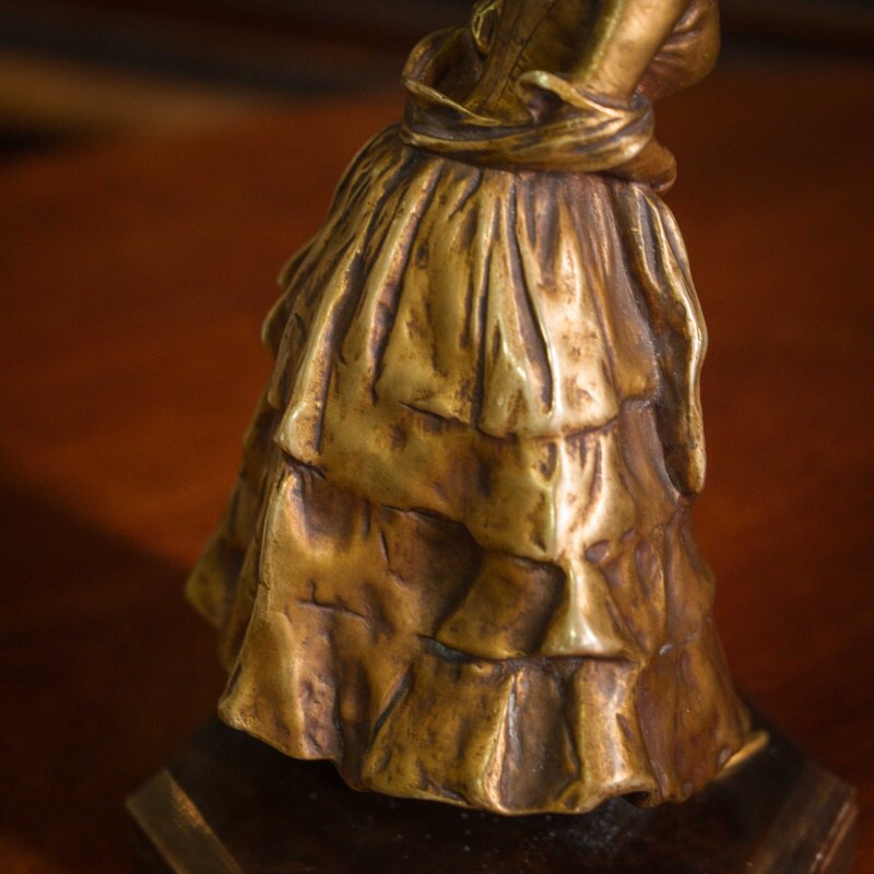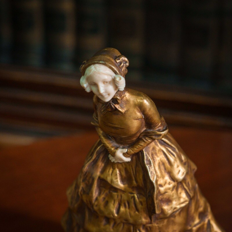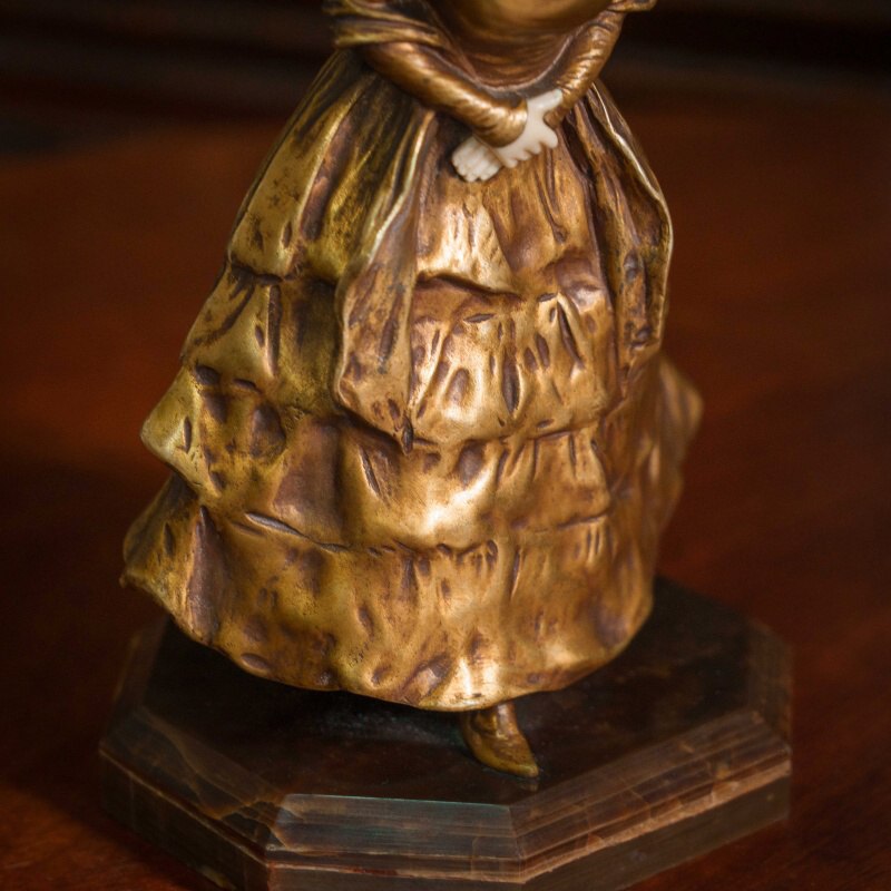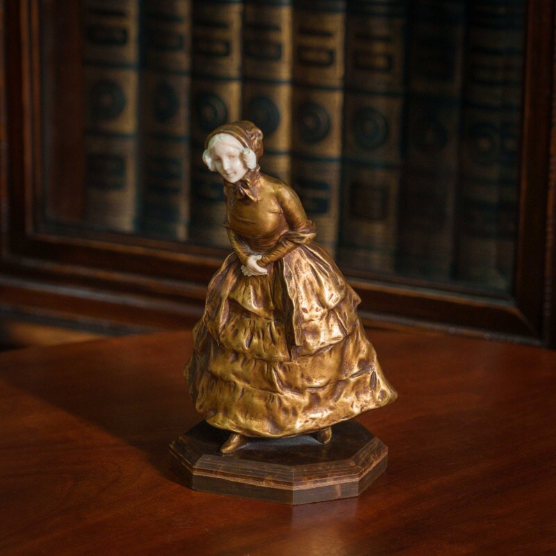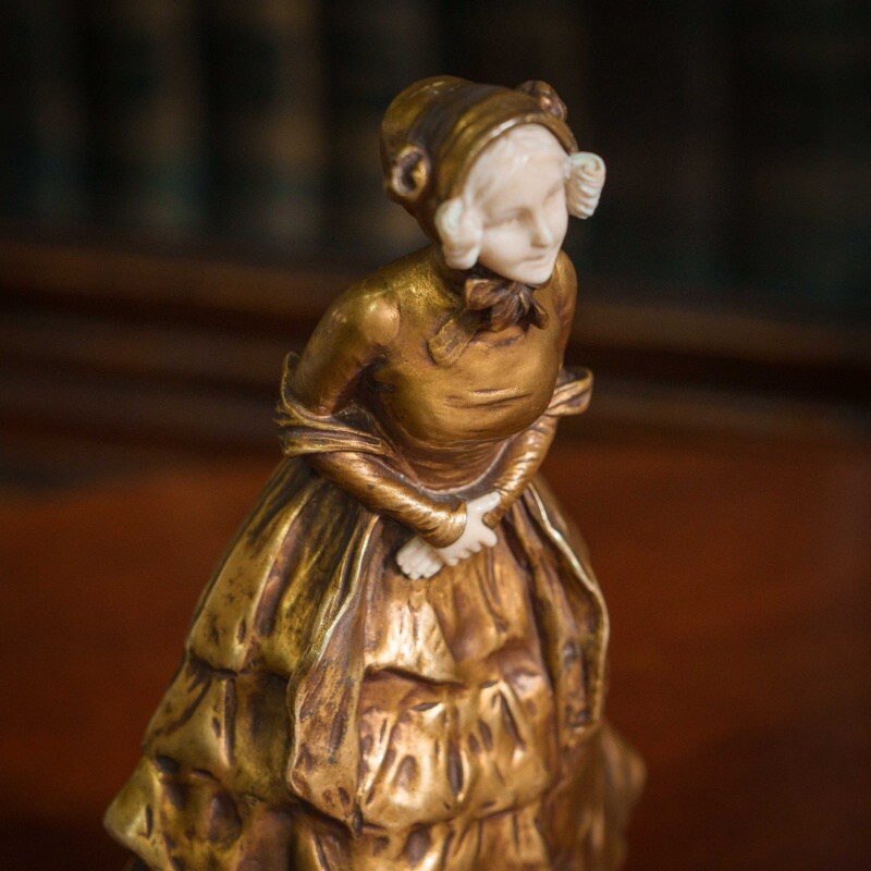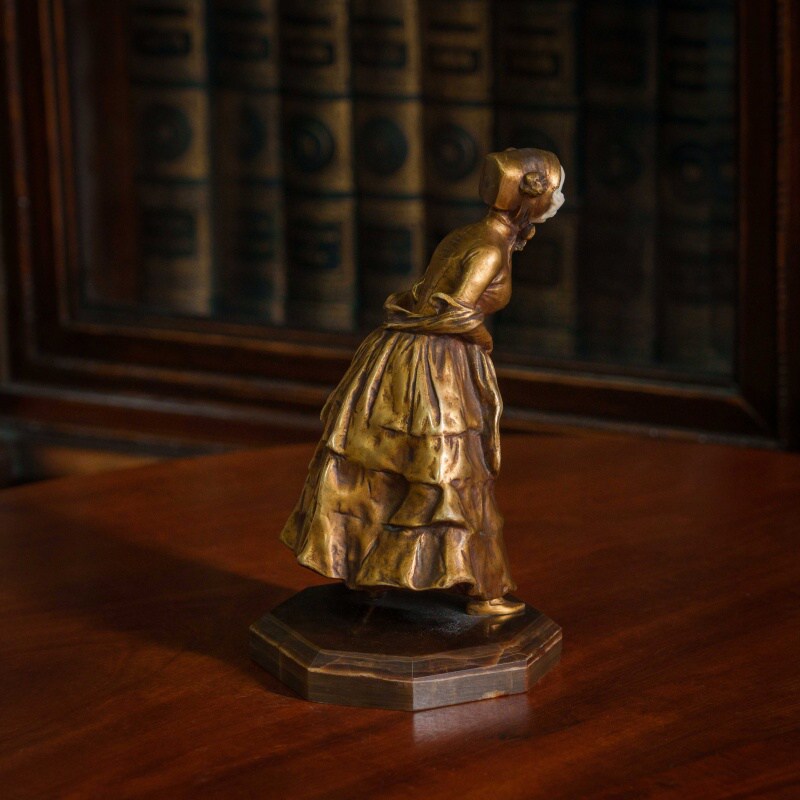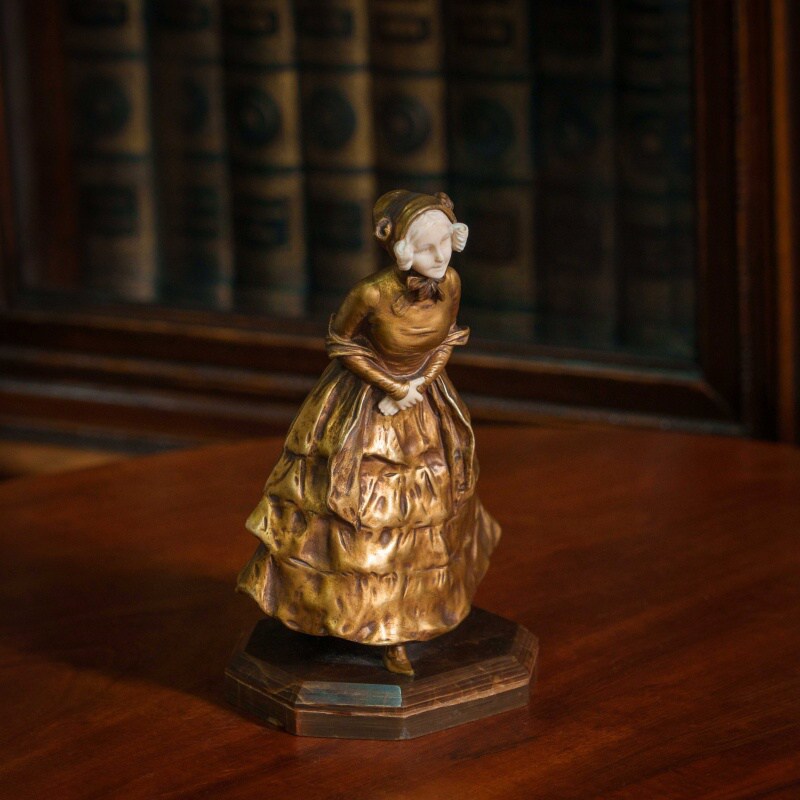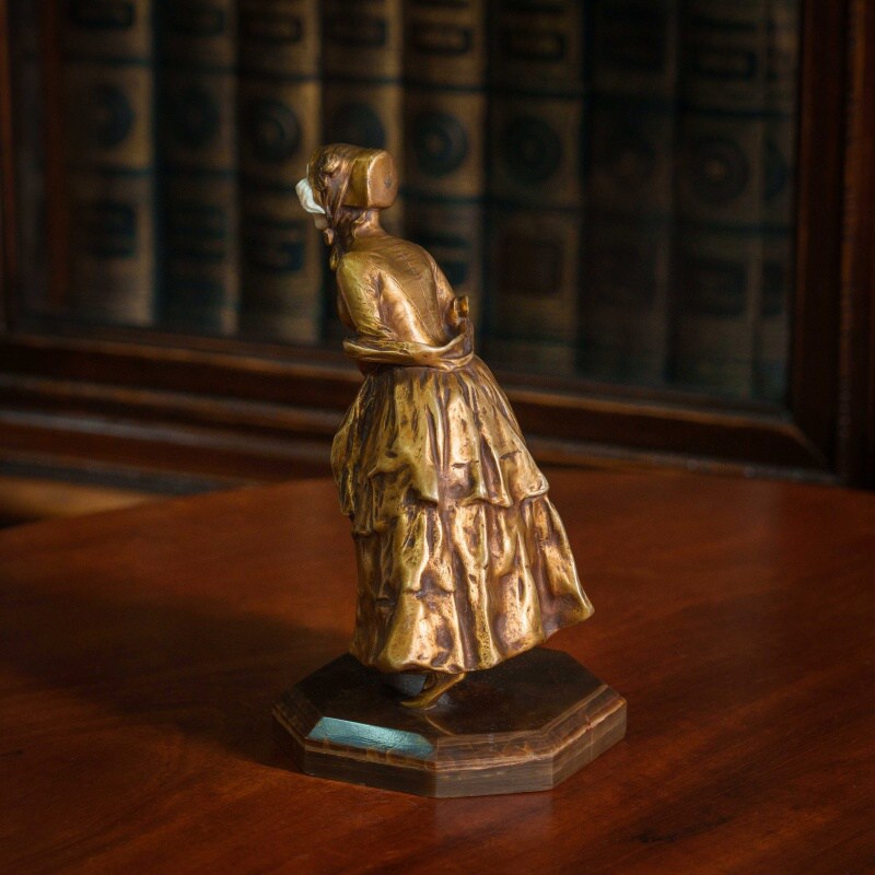 Элегантная скульптура изображает молодую девушку, выполненную в смешанной технике, что придаёт ей уникальность и изысканность. Лицо и кисти девушки вырезаны из слоновой кости, что добавляет произведению утончённости и реалистичности. Тонкость черт лица, мягкое выражение и изящные детали рук подчеркивают мастерство скульптора. Девушка облачена в богатое платье, выполненное из бронзы, с изысканными складками и деталями, которые подчёркивают движение и текстуру ткани. Платье украшено многочисленными драпировками, создающими ощущение роскоши и динамики. Подставка выполнена из натурального камня с геометрической формой, гармонично завершая композицию. Образ девушки излучает изящество и нежность, характерные для бельгийской школы скульптуры конца XIX – начала XX века.