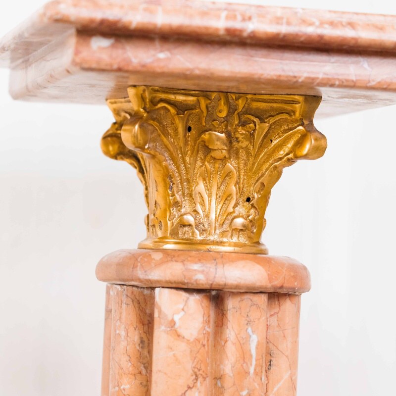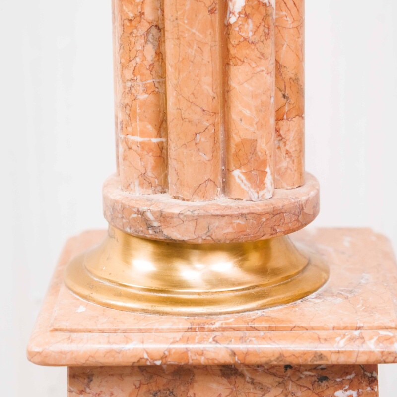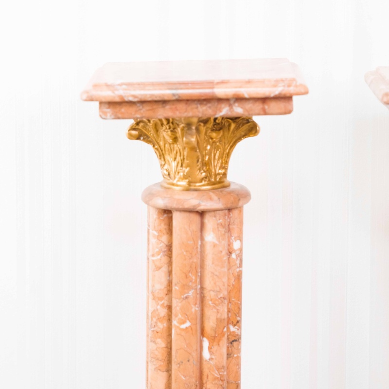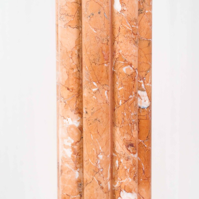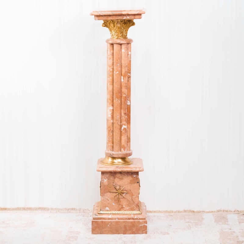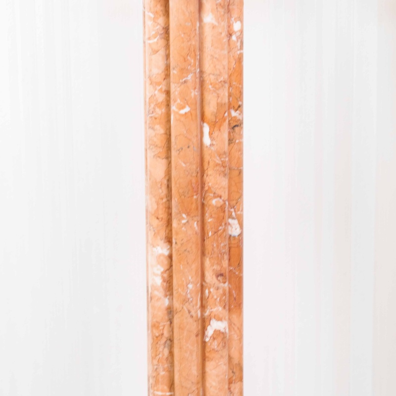 Ствол колонны высокий и стройный, облицован мрамором теплого бежево-розового оттенка с естественными прожилками, подчёркивающими природную красоту камня.
