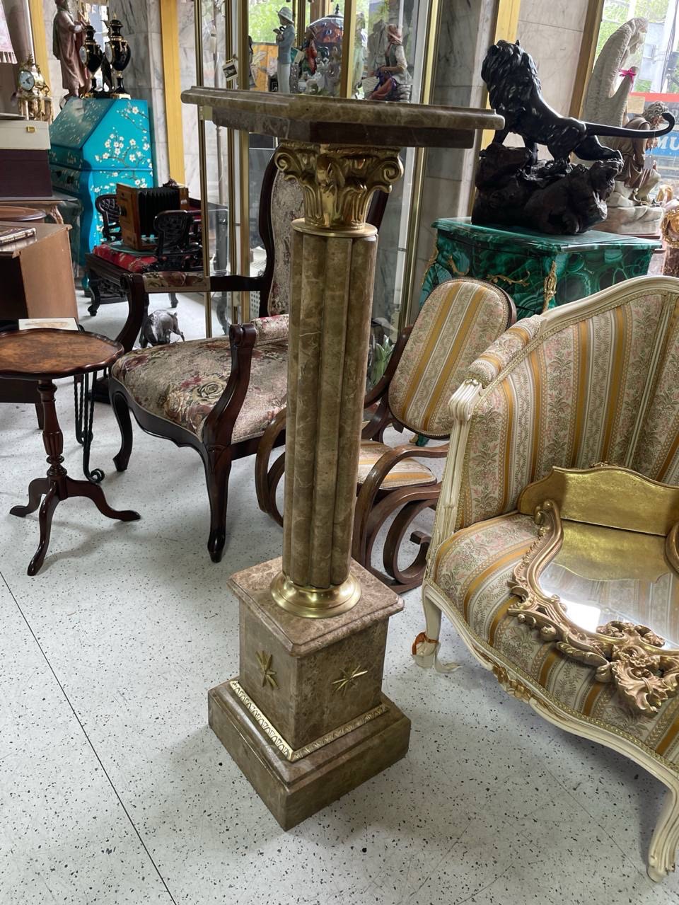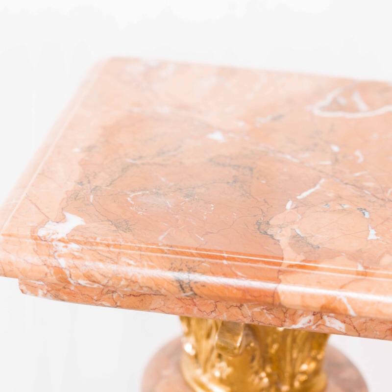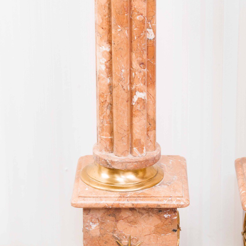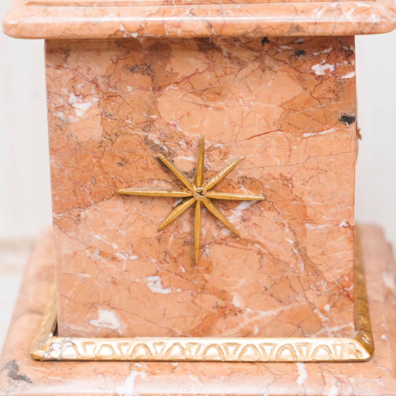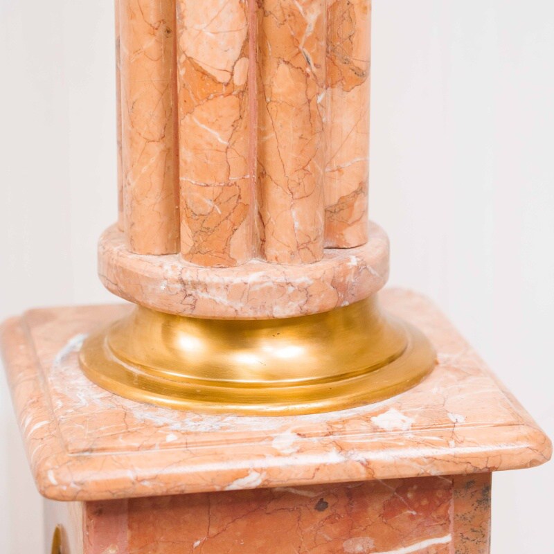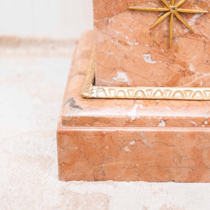 Ствол колонны высокий и стройный, облицован мрамором теплого бежево-розового оттенка с естественными прожилками, подчёркивающими природную красоту камня.