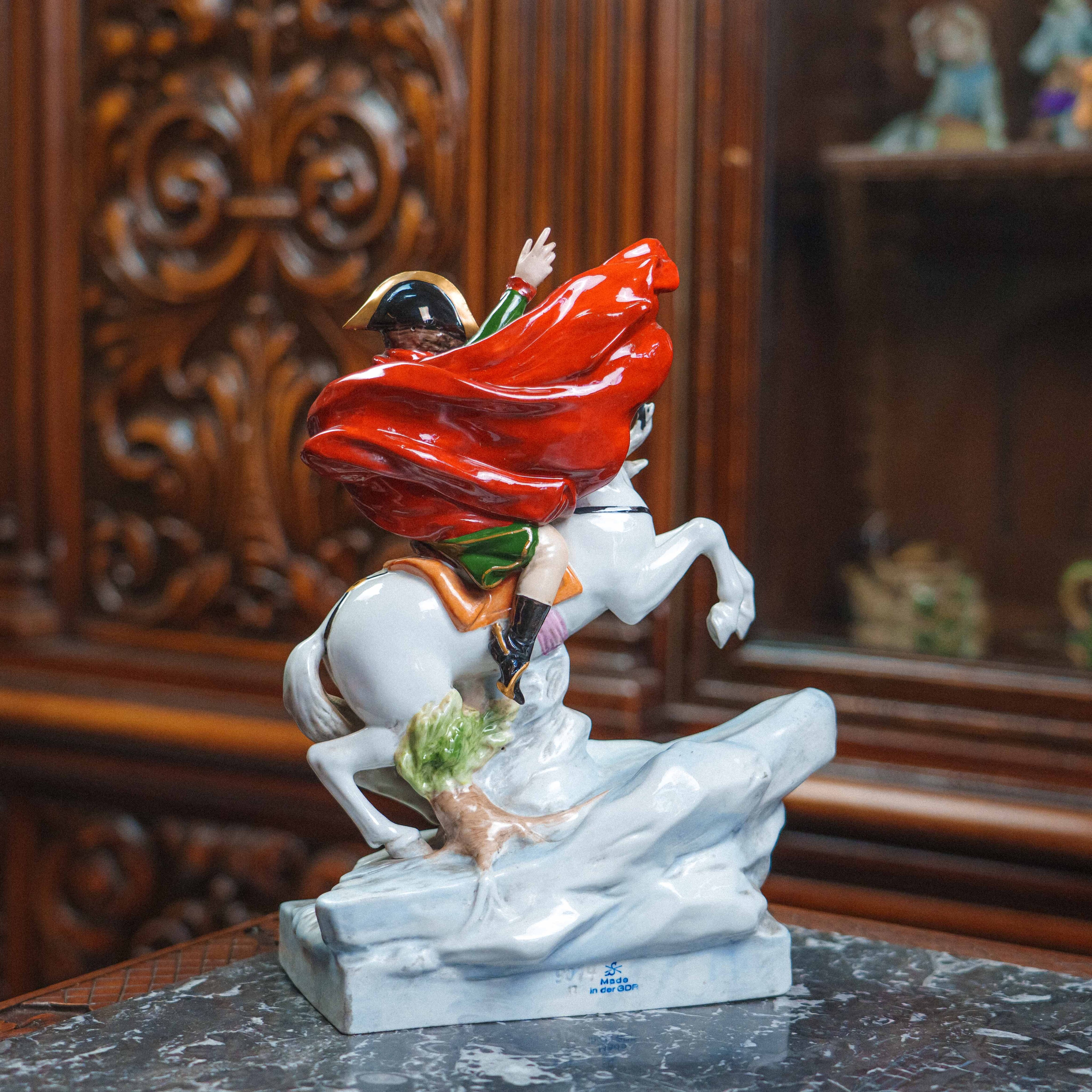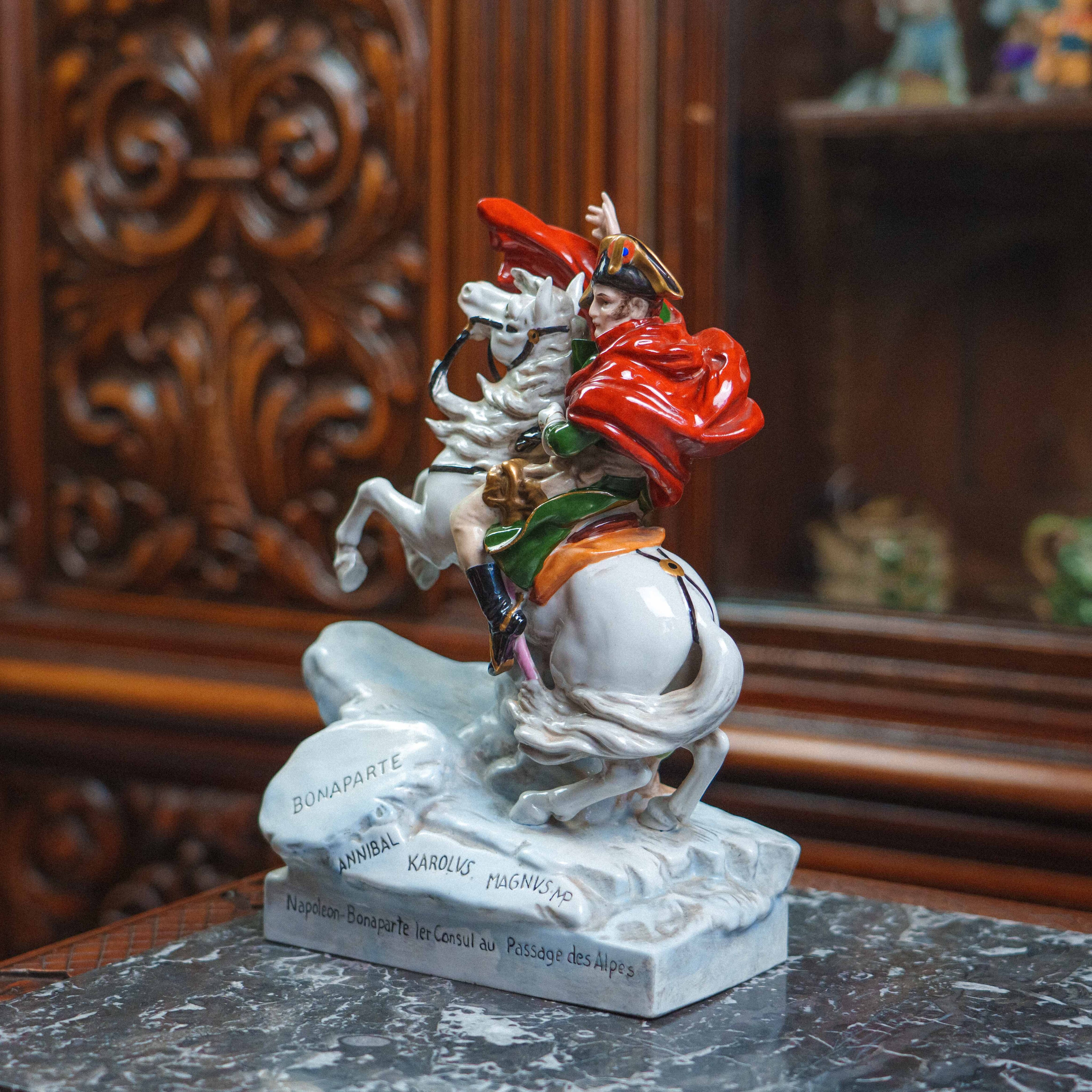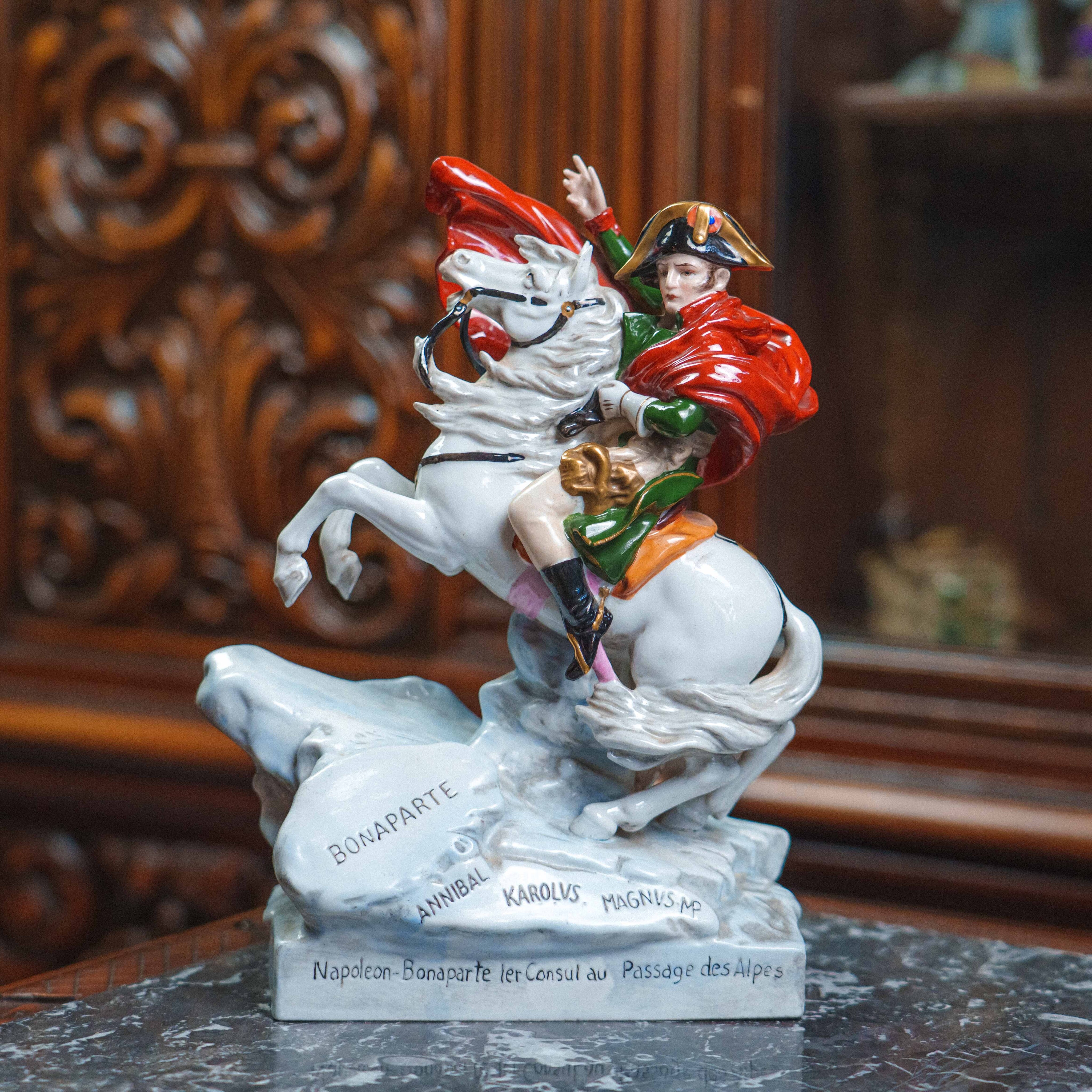 Статуэтка выполнена по мотивам знаменитой картины «Наполеон на перевале Сен-Бернар» Жака-Луи Давида. Композиция изображает Наполеона Бонапарта верхом на вздыбленном коне в момент символического перехода через Альпы — эпизода, ставшего одним из самых узнаваемых образов, связанных с наполеоновской эпохой. Император представлен в характерном облике: в двуугольной шляпе, с развевающимся красным плащом и властным жестом, указывающим направление движения. Динамика позы, напряжение фигуры коня и тщательно проработанный горный рельеф создают ощущение драматизма и торжественного пафоса. На основании размещены надписи с именами великих полководцев прошлого — BONAPARTE, ANNIBAL, KAROLVS MAGNVS, подчёркивающие преемственность военной славы и исторического величия.