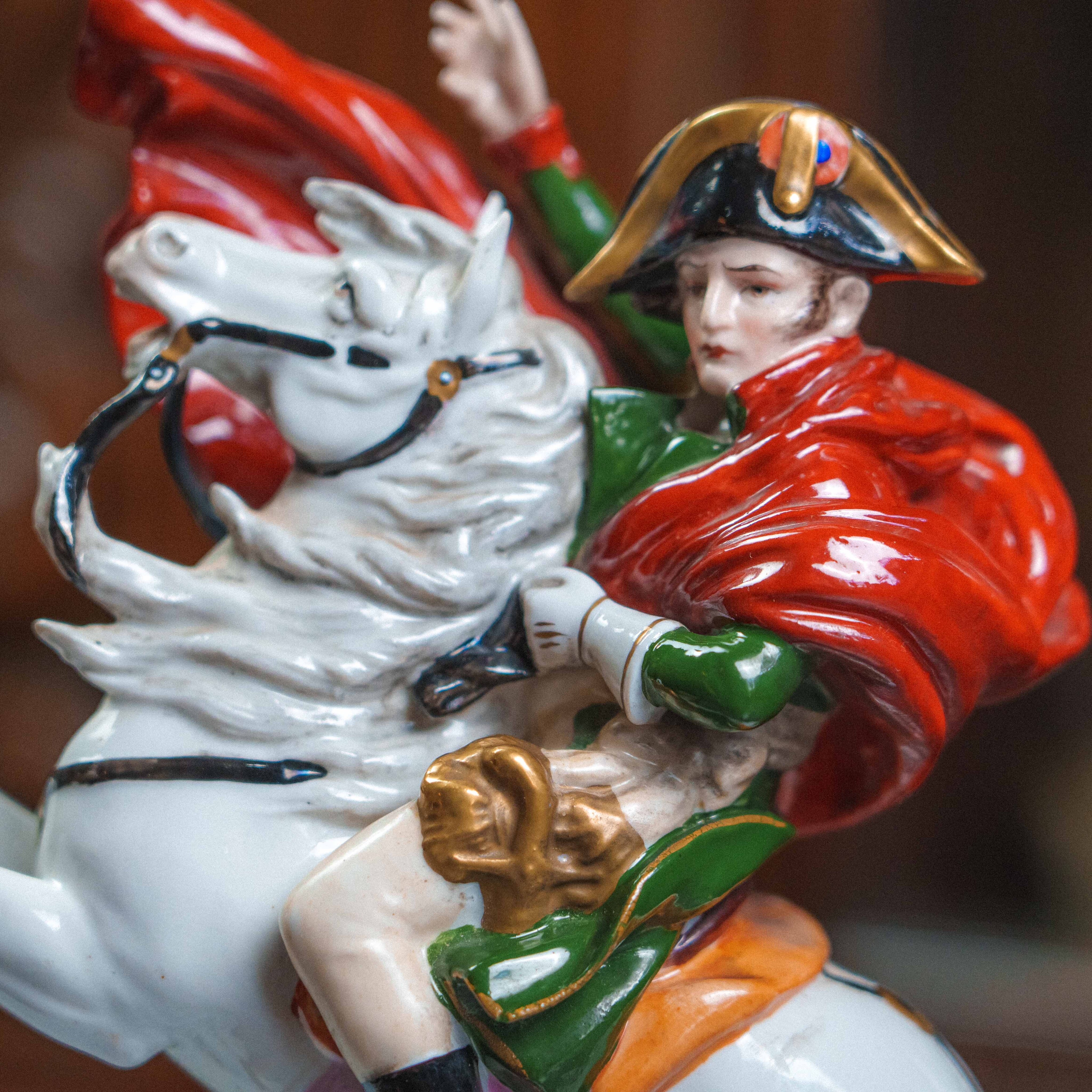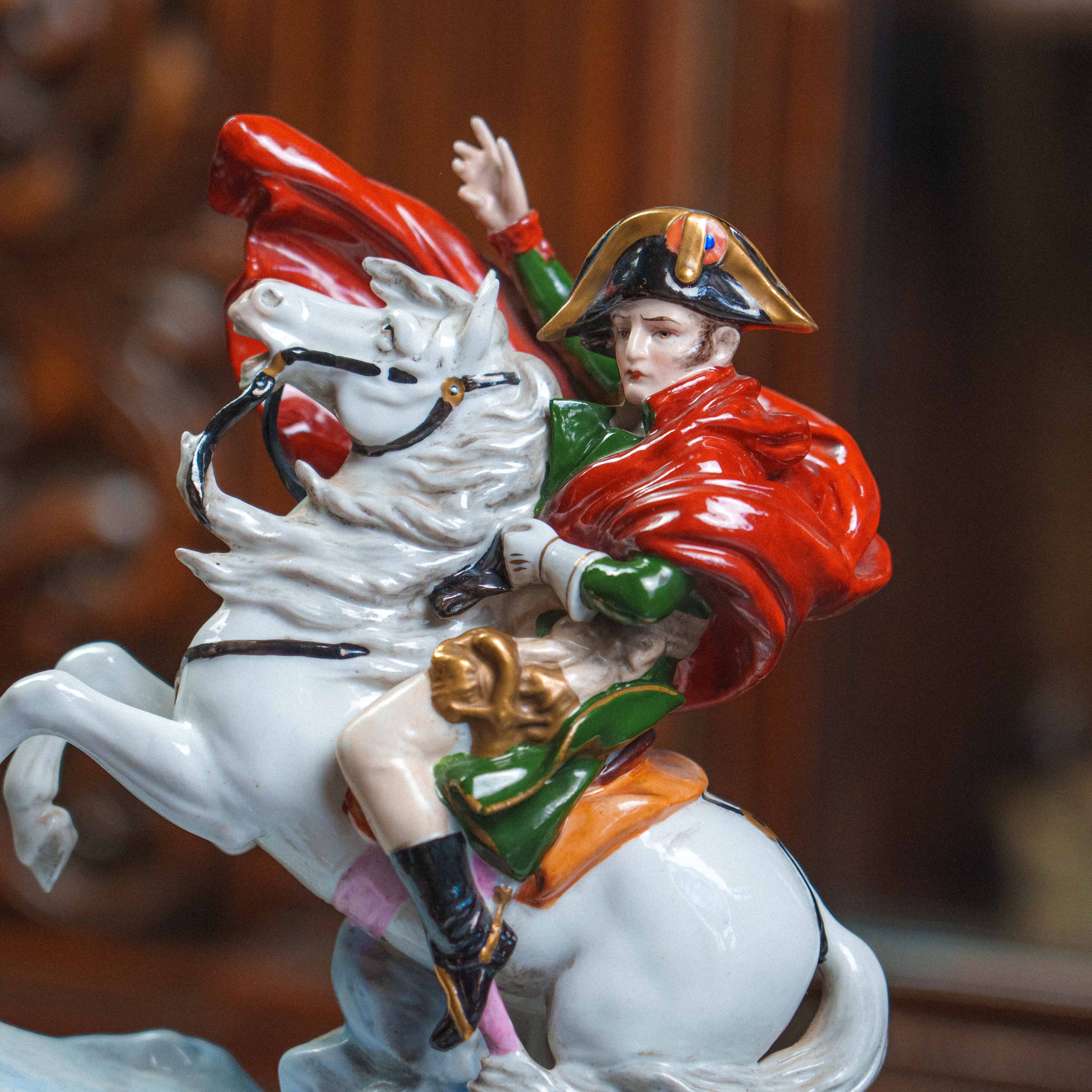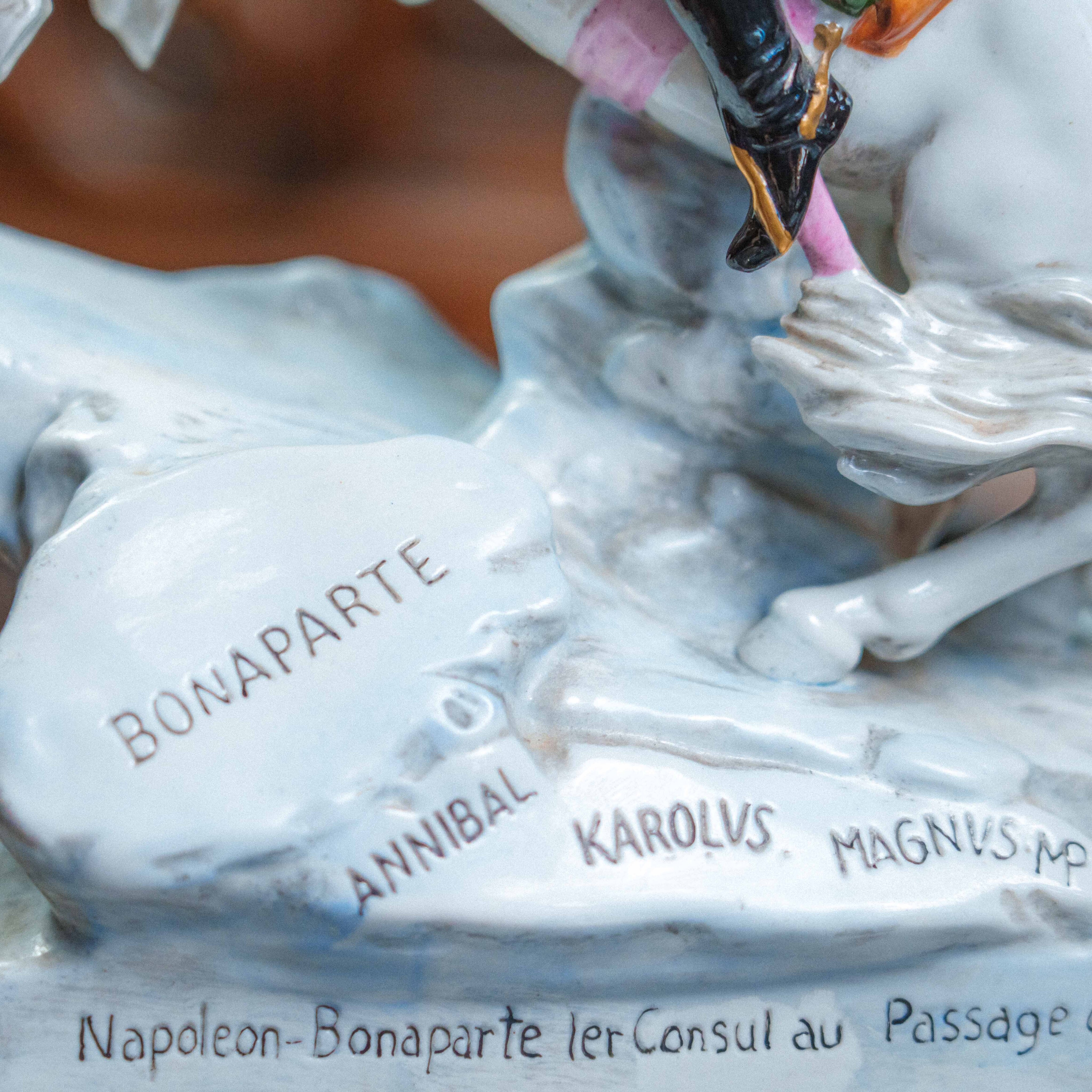 Статуэтка выполнена по мотивам знаменитой картины «Наполеон на перевале Сен-Бернар» Жака-Луи Давида. Композиция изображает Наполеона Бонапарта верхом на вздыбленном коне в момент символического перехода через Альпы — эпизода, ставшего одним из самых узнаваемых образов, связанных с наполеоновской эпохой. Император представлен в характерном облике: в двуугольной шляпе, с развевающимся красным плащом и властным жестом, указывающим направление движения. Динамика позы, напряжение фигуры коня и тщательно проработанный горный рельеф создают ощущение драматизма и торжественного пафоса. На основании размещены надписи с именами великих полководцев прошлого — BONAPARTE, ANNIBAL, KAROLVS MAGNVS, подчёркивающие преемственность военной славы и исторического величия.