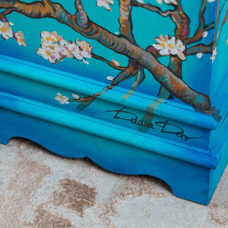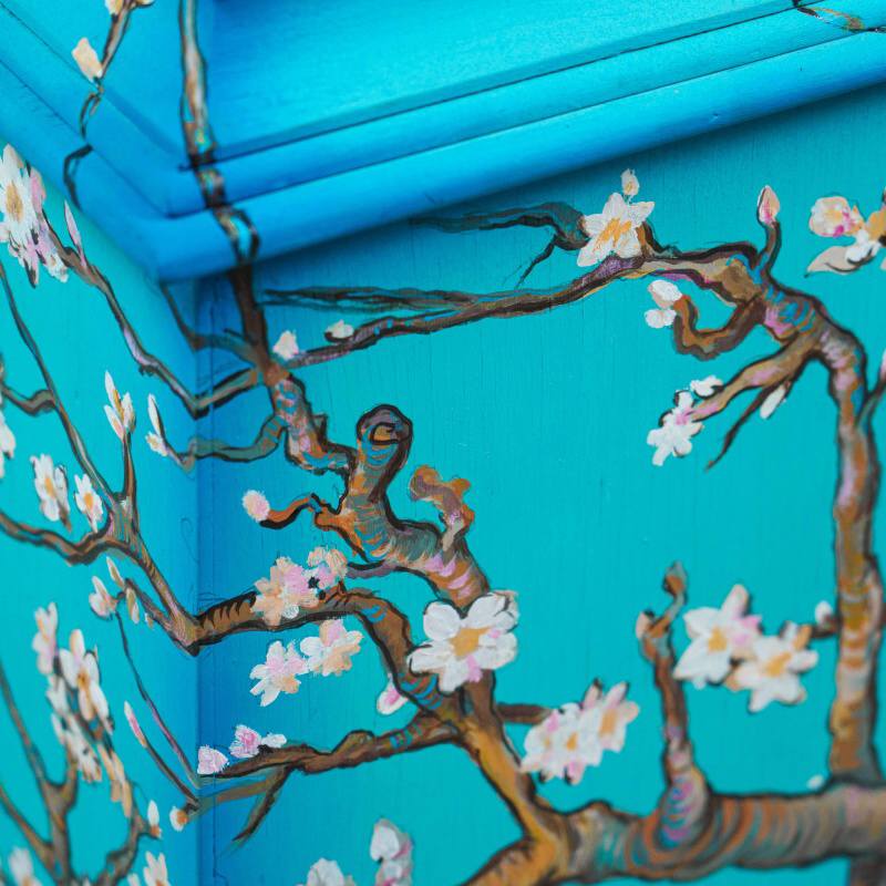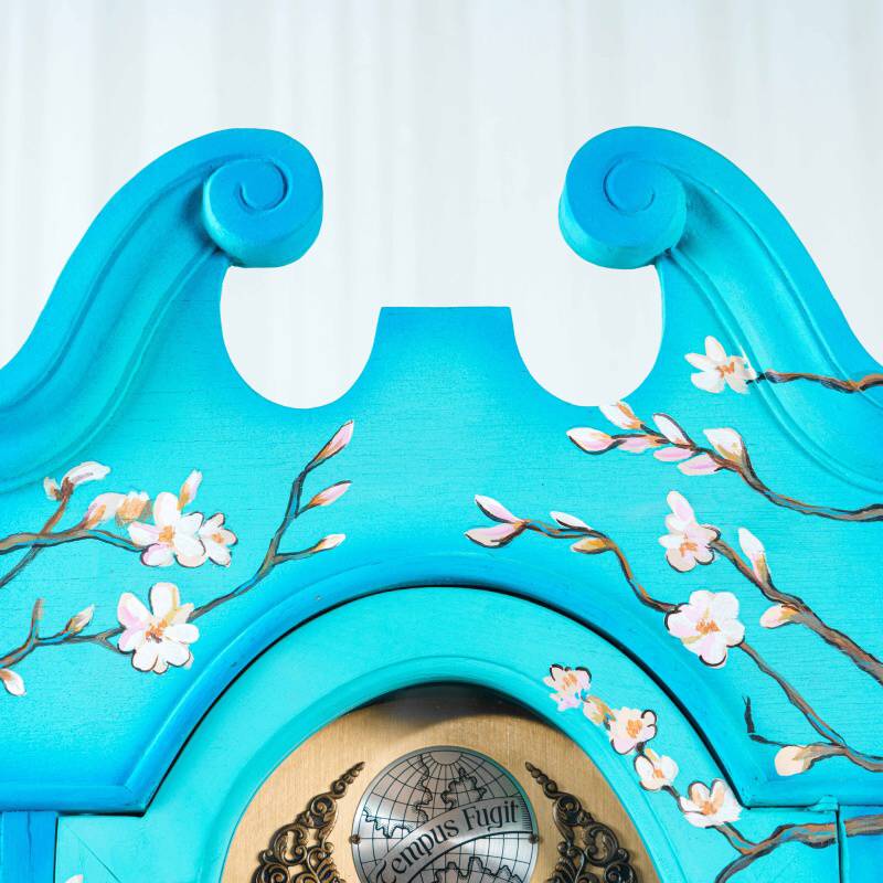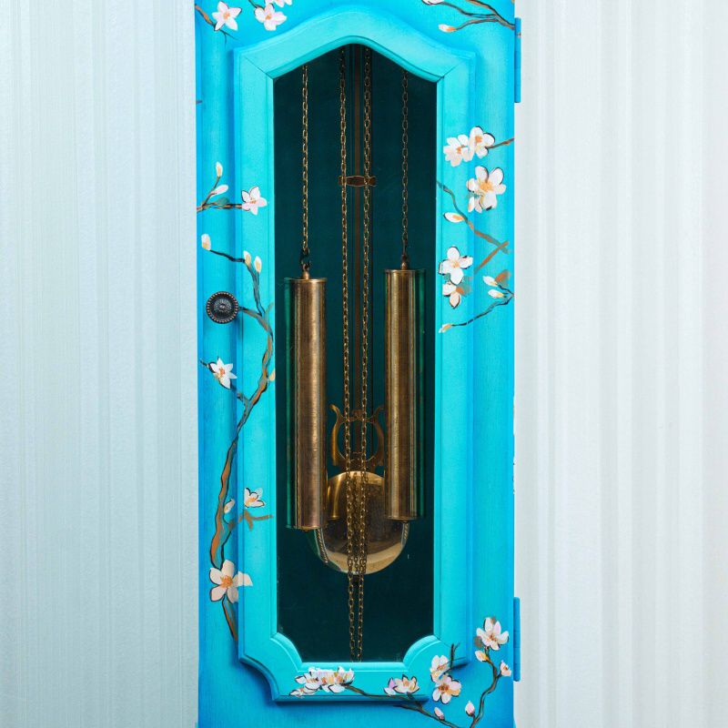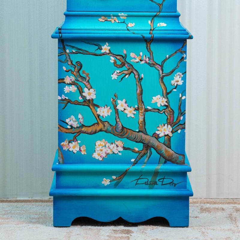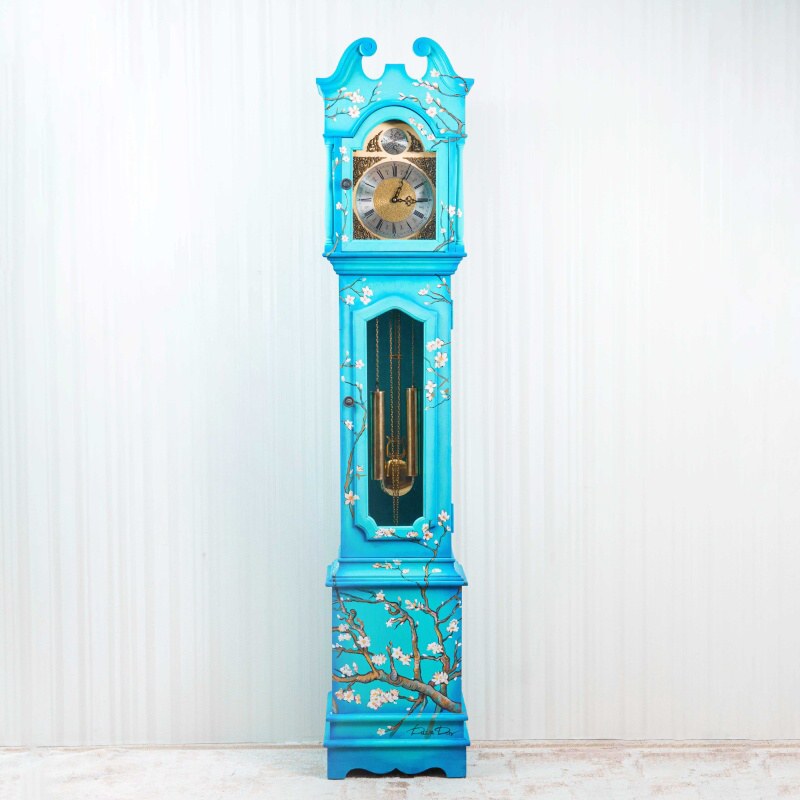 Напольные часы в классическом корпусе с выразительным силуэтом и плавно изогнутым навершием. Особое внимание привлекает декоративное оформление корпуса — украшен ручной росписью, вдохновленной знаменитой картиной голландского художника Винсента ван Гога «Ветки цветущего миндаля».
