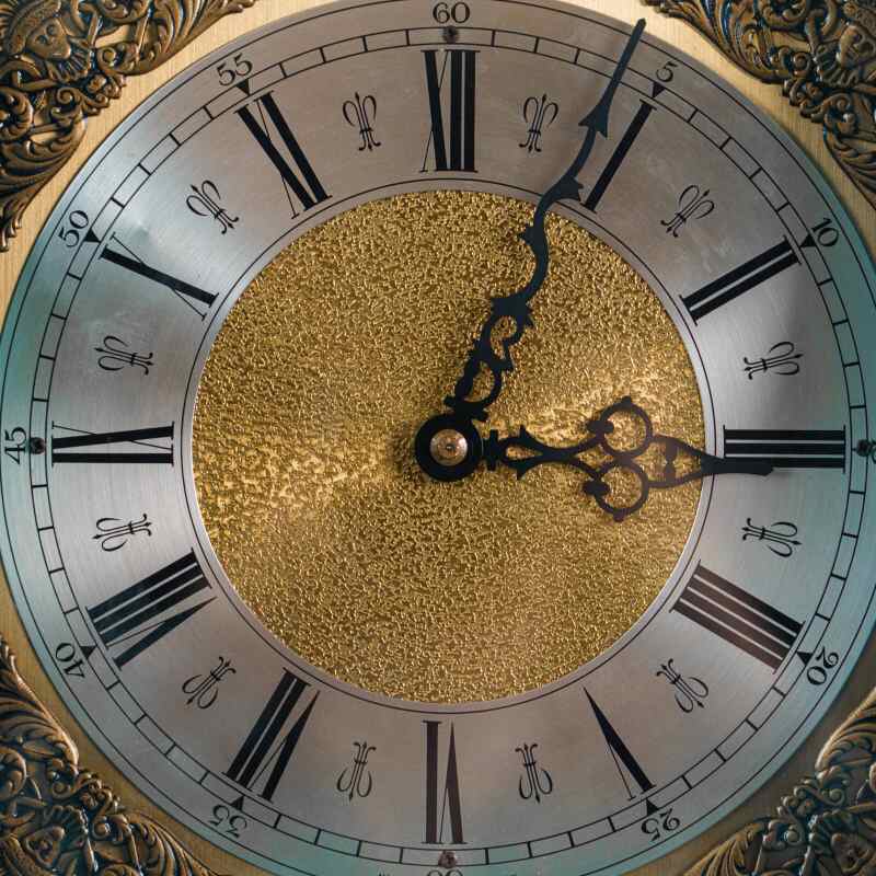 За стеклянной дверцей корпуса расположен механизм с гирями и маятником. Механизм оснащен часовым и получасовым боем.