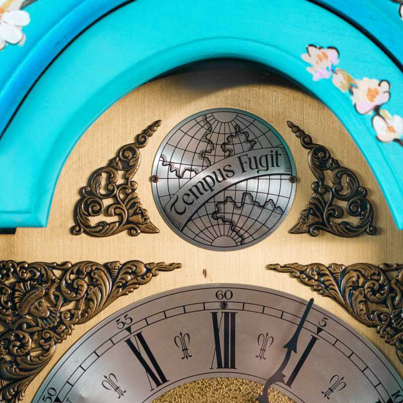 Над циферблатом расположена накладная табличка с надписью «Tempus Fugit», что в переводе означает «Время летит».