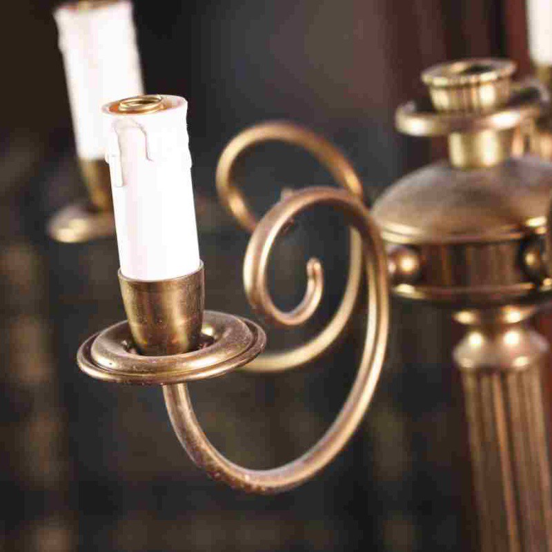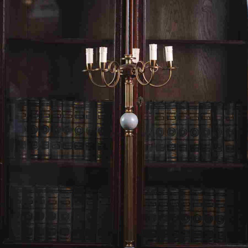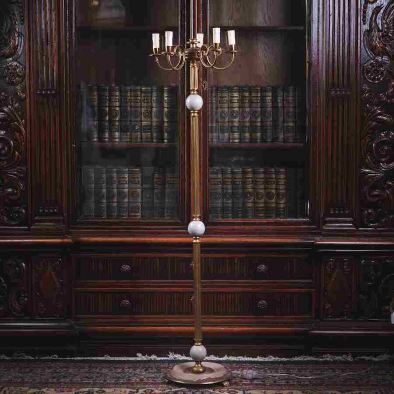 Верхняя часть оформлена в виде пяти рожков, каждый из которых украшен изогнутыми держателями в традициях классических канделябров. Тёплый золотистый оттенок латуни в сочетании с металлическим блеском придаёт торшеру благородный характер и делает его ярким акцентом интерьера.