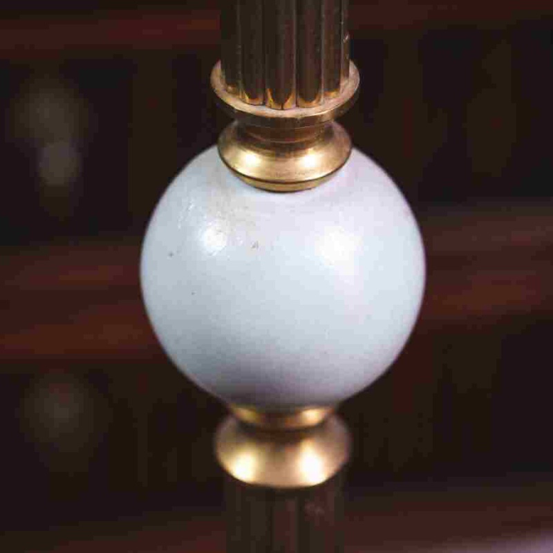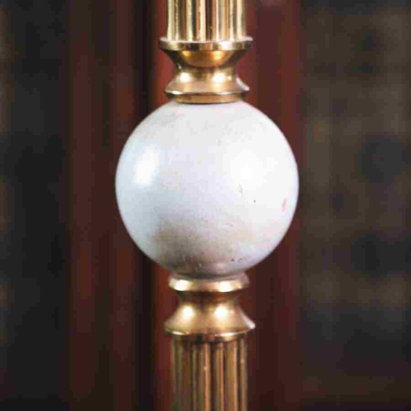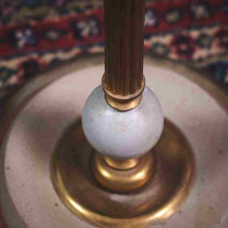 Торшер середины XX века, выполненный из металла и латуни, — элегантный предмет интерьера в классическом европейском стиле. Конструкция представляет собой высокую изящную колонну с декоративными элементами и блестящими латунными вставками, подчёркивающими утончённость и симметрию формы.