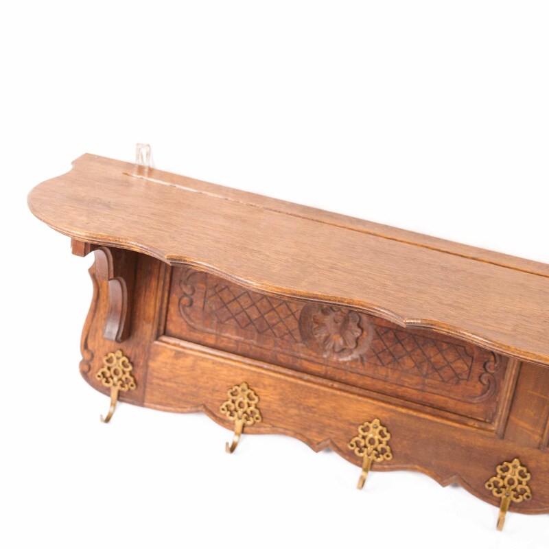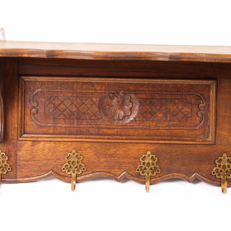 Элегантная настенная вешалка из натурального дерева, выполненная в классическом европейском стиле. Верхняя часть оформлена в виде широкой полки, удобной для размещения головных уборов, аксессуаров или декоративных предметов.