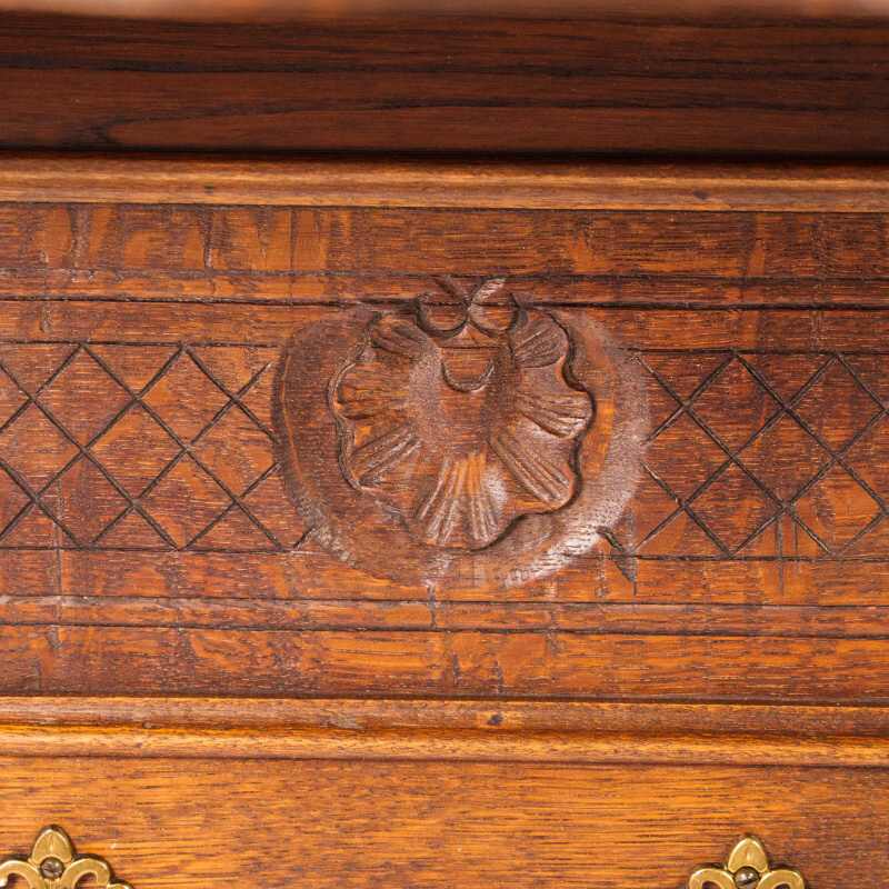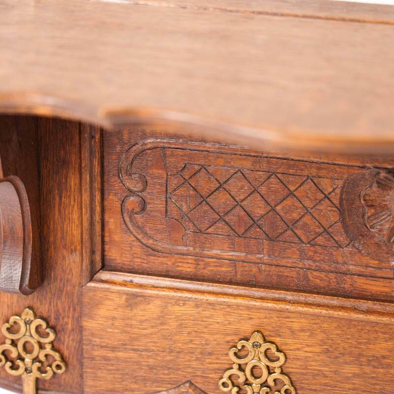 Фасад украшен двумя резными панелями с геометрическим и растительным орнаментом, дополненными центральными декоративными элементами. Нижняя часть имеет фигурный край, придающий изделию лёгкость и выразительность.