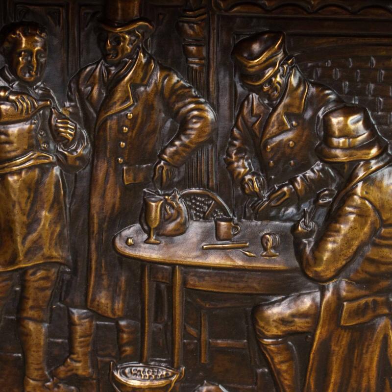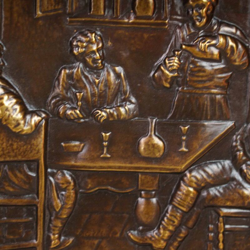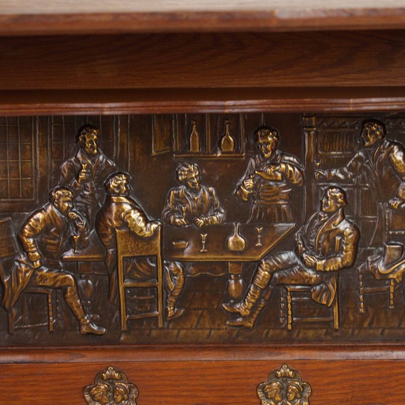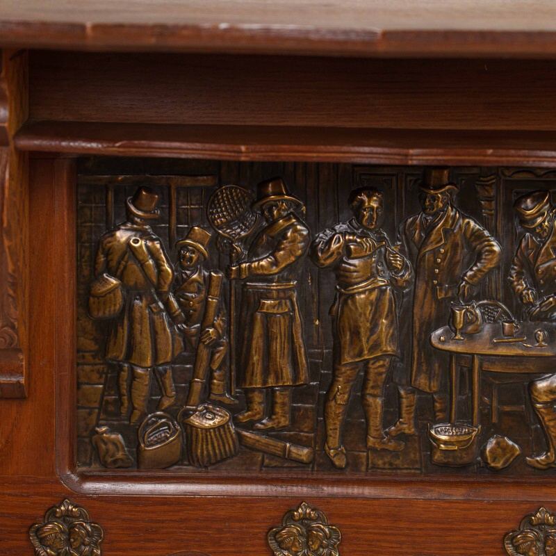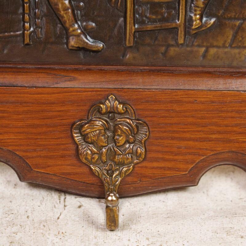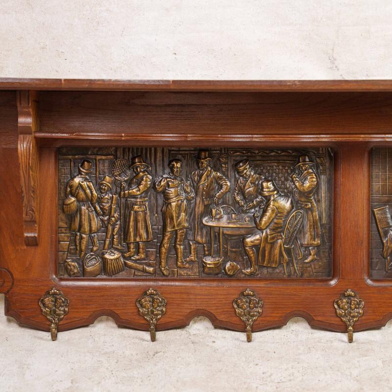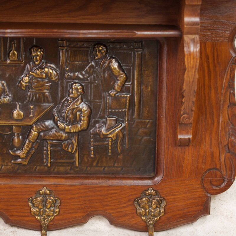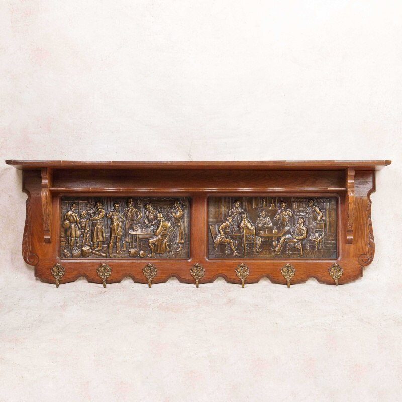 Антикварная настенная вешалка в охотничьем стиле, выполненная из массива дуба, — редкий образец европейского декоративно-прикладного искусства середины XX века. Центральная часть украшена двумя крупными латунными барельефными панно, изображающими жанровые сцены из таверны и охотничьих застолий.