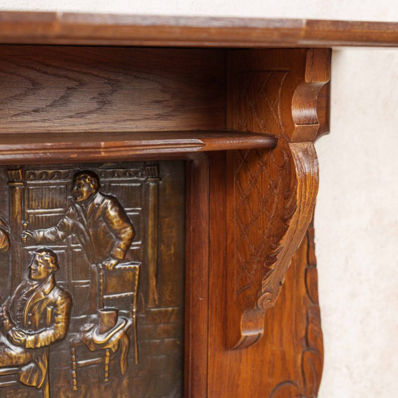 Детально проработанные рельефы в духе старинной европейской живописи придают предмету особую атмосферу уюта и исторического характера. Тёплый оттенок дуба с лёгкой патиной гармонично сочетается с бронзово-золотистым блеском латунных вставок.