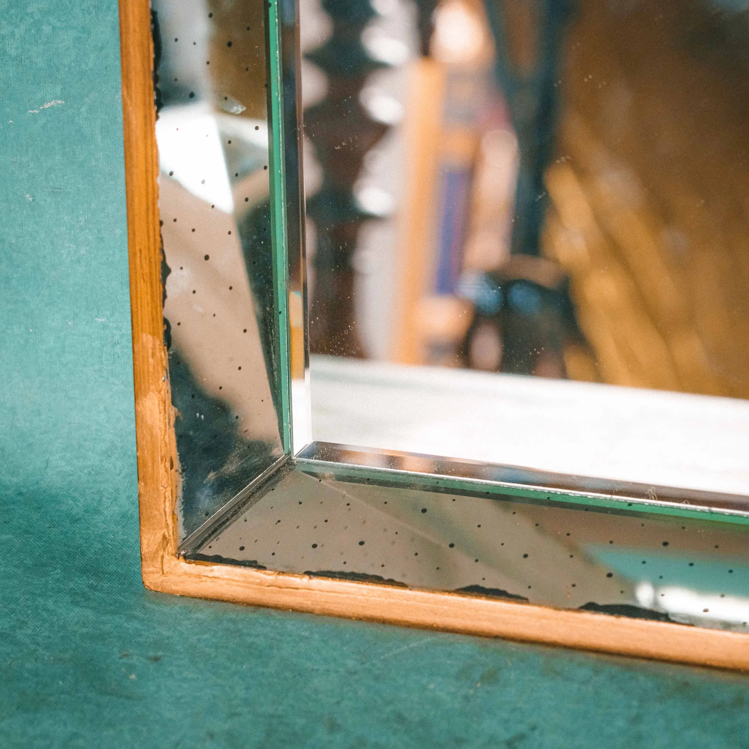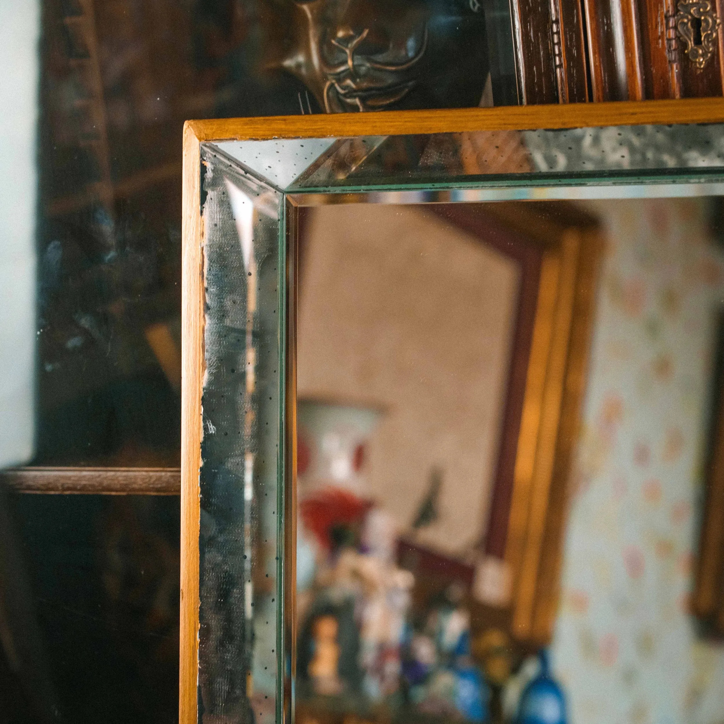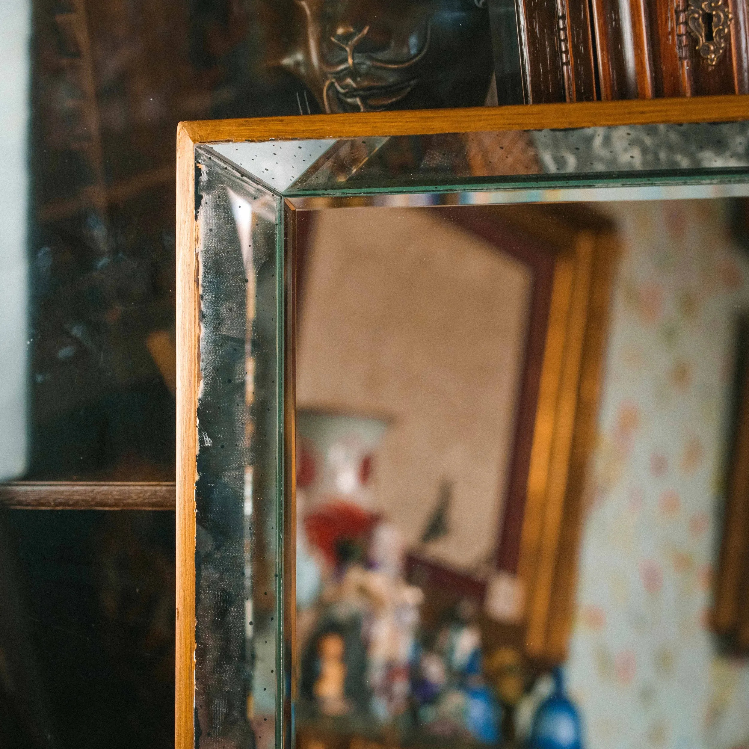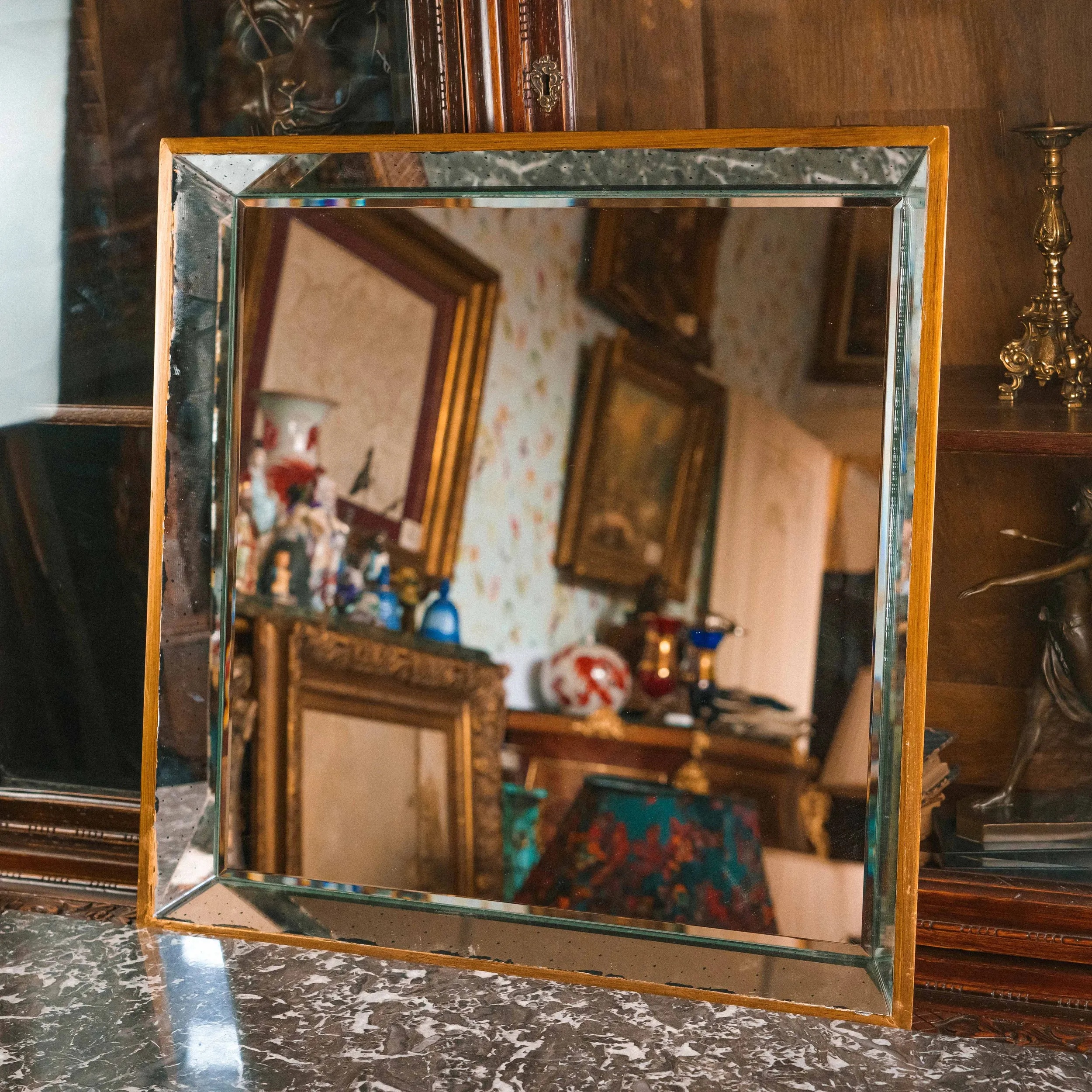 Это квадратное антикварное зеркало представляет собой более утонченный и геометрический дизайн, характерный для стиля Арт-Деко или Венецианского зеркала. Основное зеркальное полотно обрамлено скошенными зеркальными фацетами, которые создают эффект мерцания и глубины. Внутренний и внешний края имеют тонкую окантовку из золочёной или бронзированной рамки. Зеркальные панели могут иметь легкую патину или следы старения, что подчеркивает его антикварный статус. Благодаря своей чистой геометрической форме и светоотражающей поверхности, это зеркало прекрасно подходит как для классического, так и для современного интерьера, добавляя ему элегантности и света.