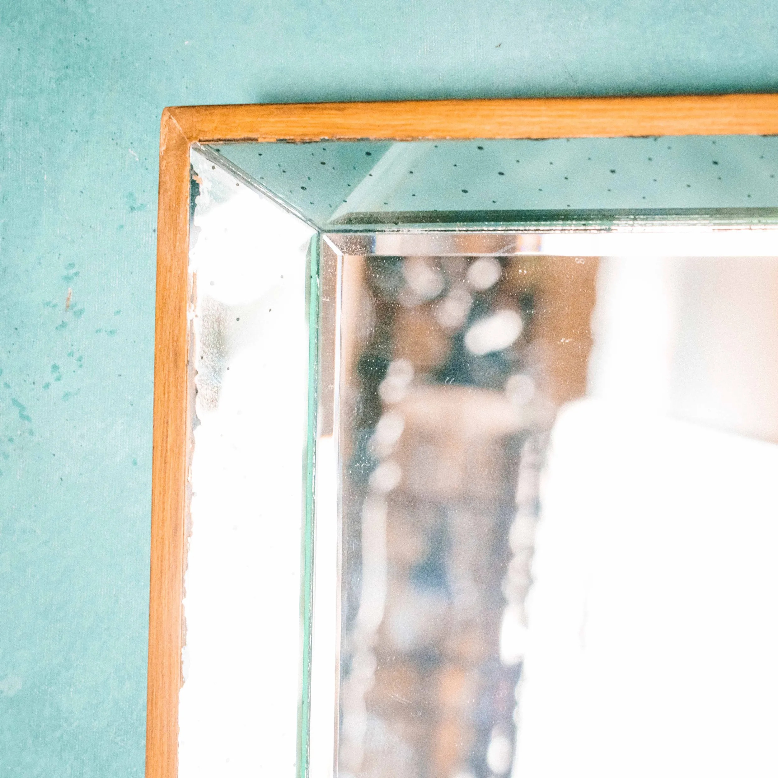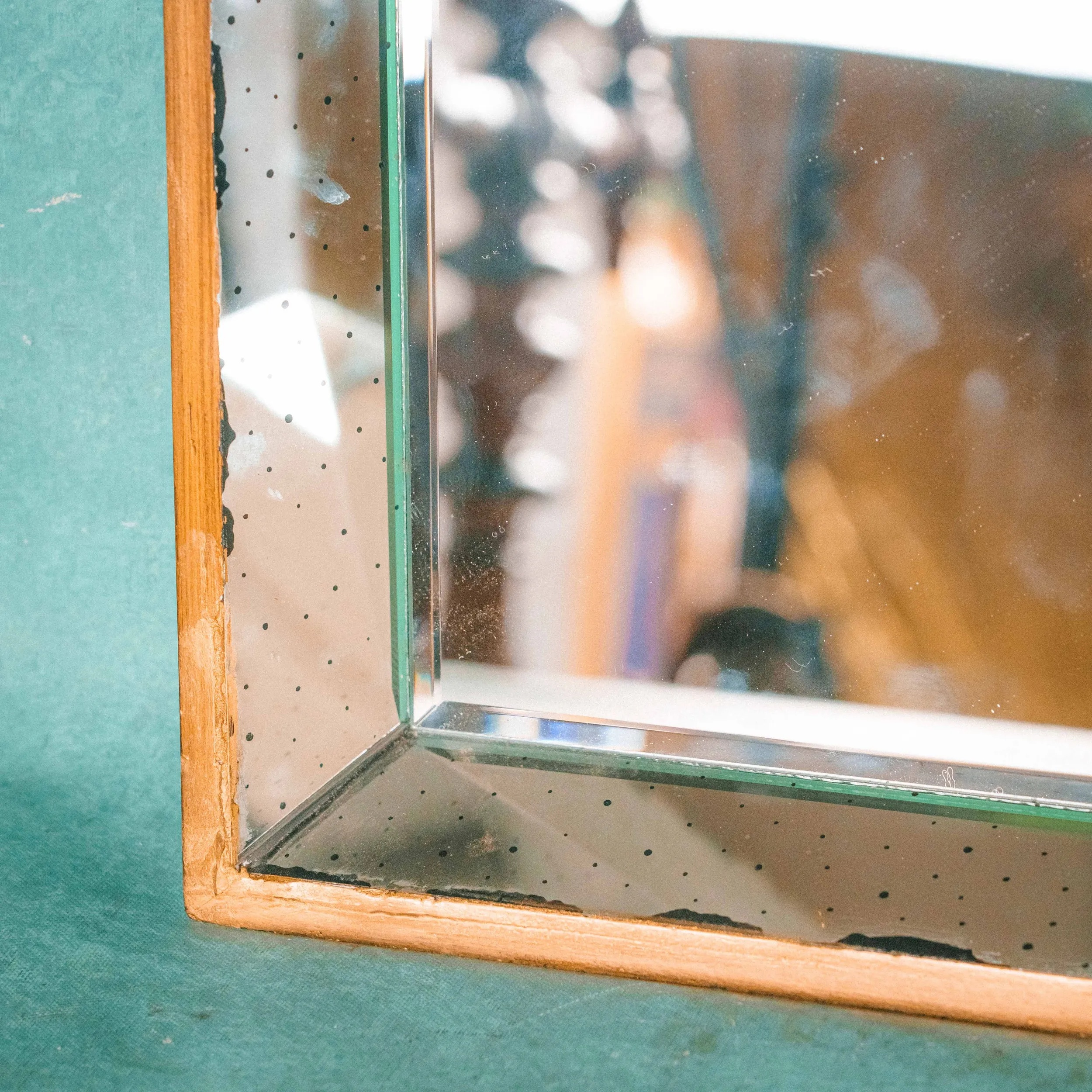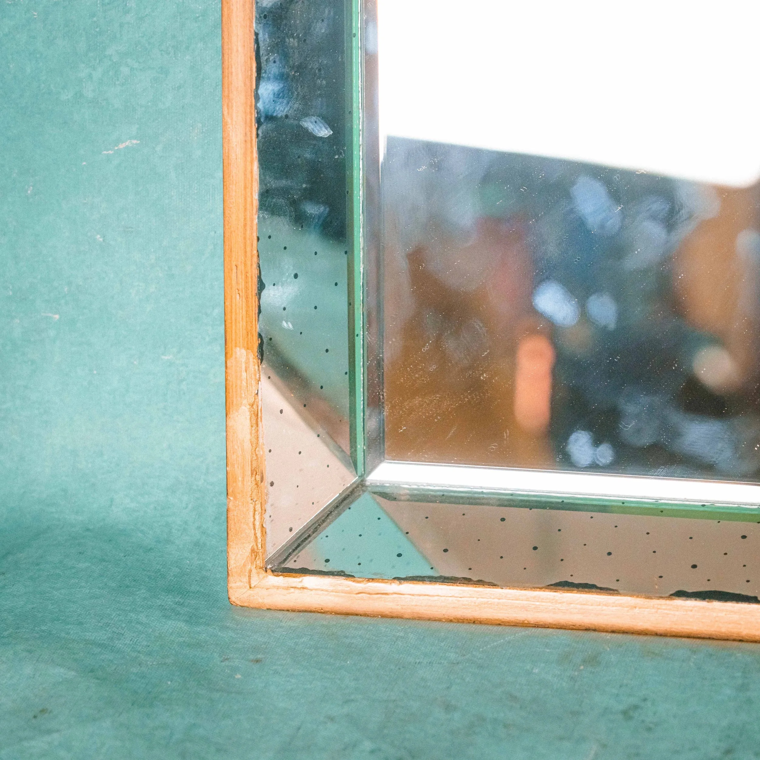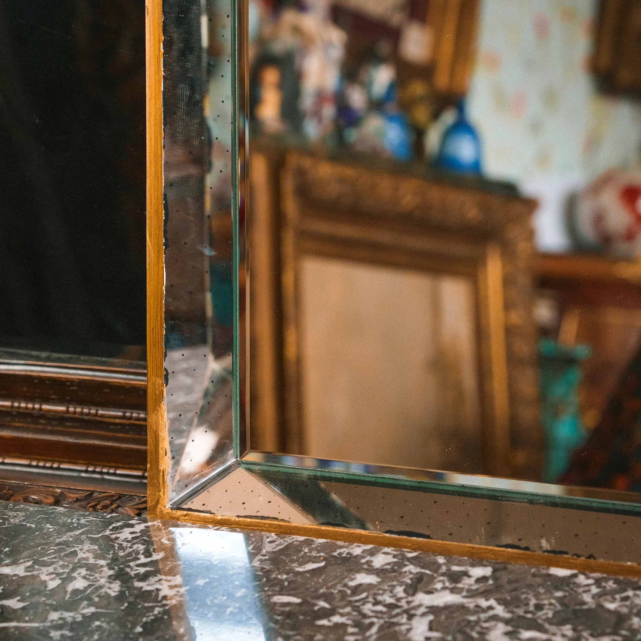 Это квадратное антикварное зеркало представляет собой более утонченный и геометрический дизайн, характерный для стиля Арт-Деко или Венецианского зеркала. Основное зеркальное полотно обрамлено скошенными зеркальными фацетами, которые создают эффект мерцания и глубины. Внутренний и внешний края имеют тонкую окантовку из золочёной или бронзированной рамки. Зеркальные панели могут иметь легкую патину или следы старения, что подчеркивает его антикварный статус. Благодаря своей чистой геометрической форме и светоотражающей поверхности, это зеркало прекрасно подходит как для классического, так и для современного интерьера, добавляя ему элегантности и света.