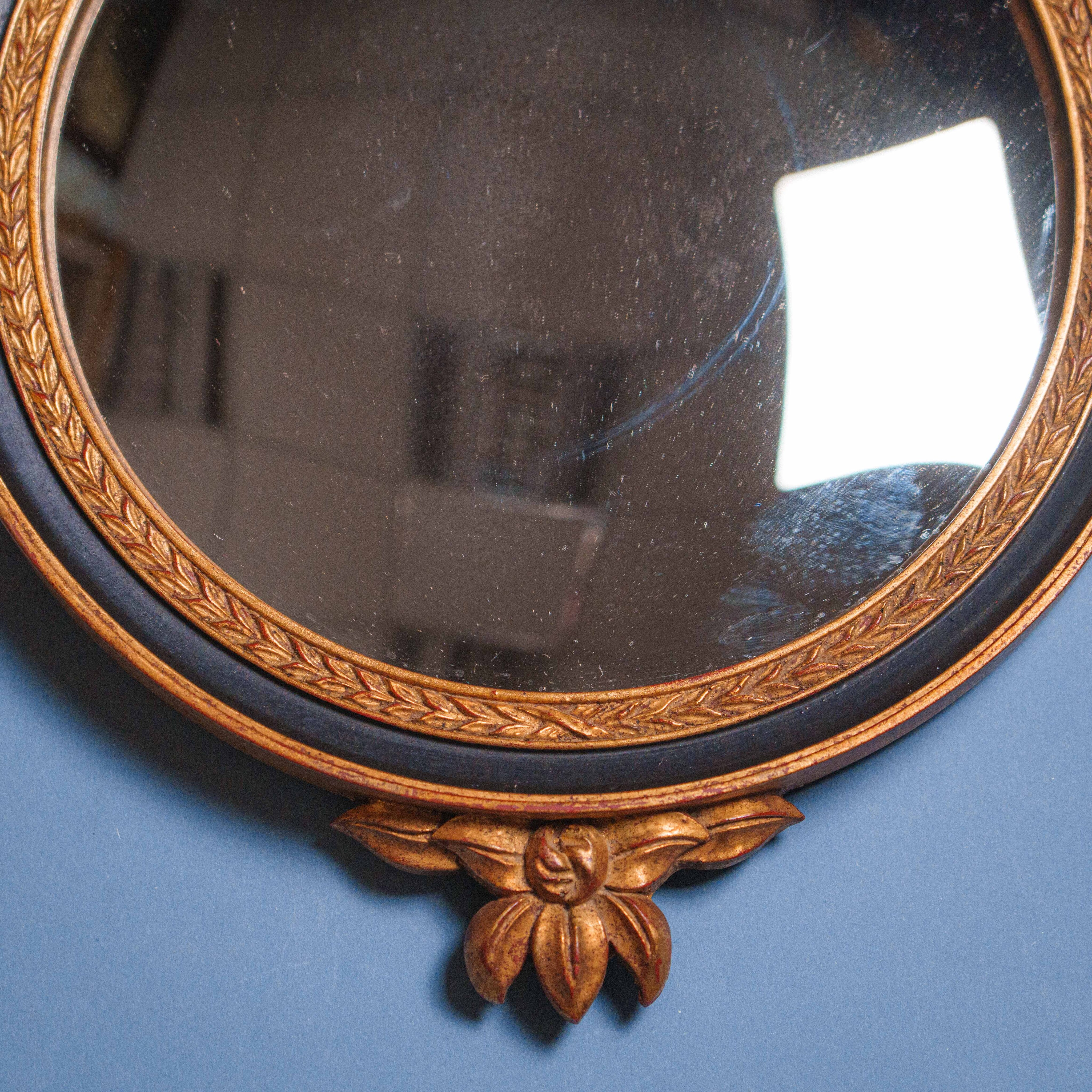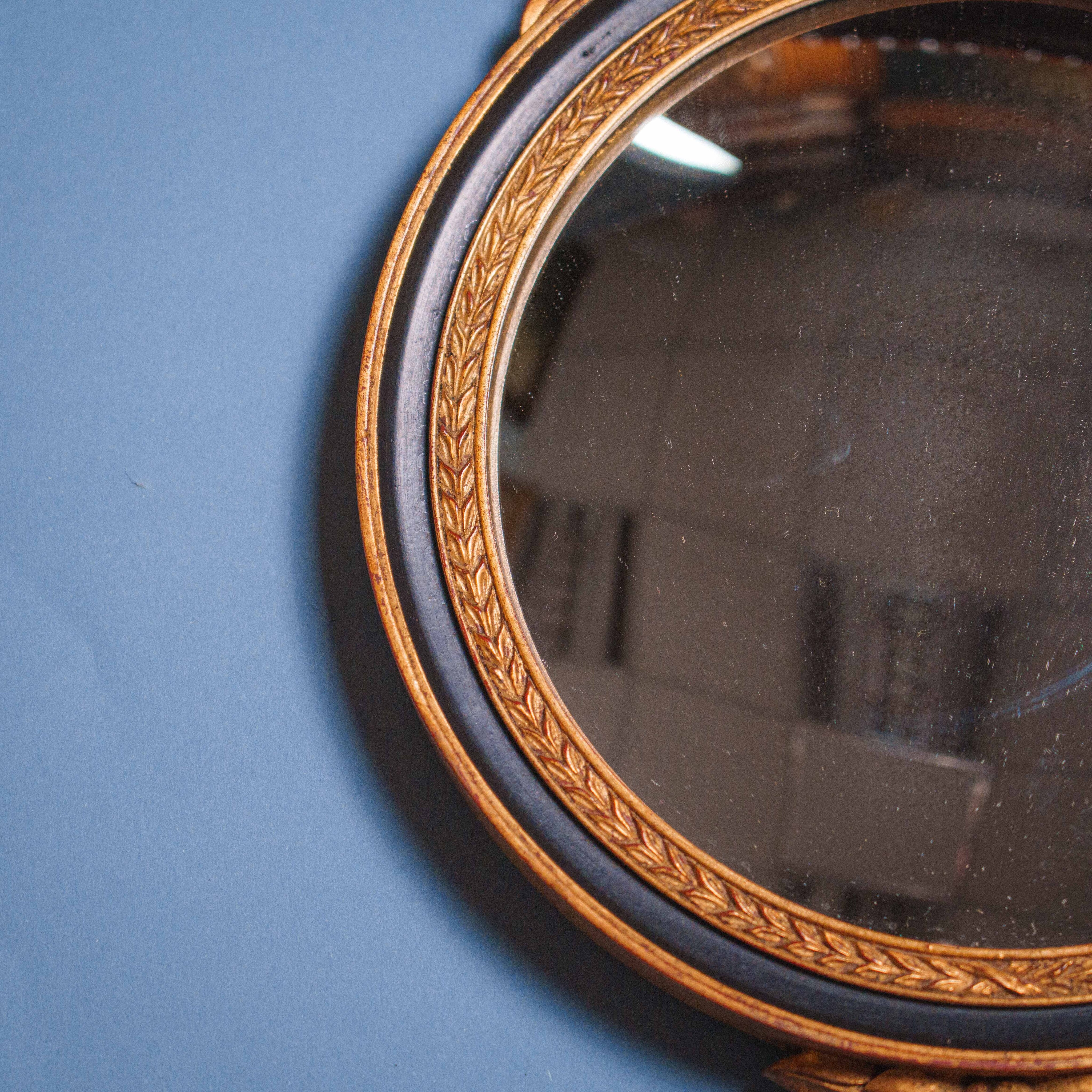 Настенное зеркало в рельефной раме из полимерного материала, выполненное в классическом европейском стиле. Композицию венчает выразительный орёл с расправленными крыльями — символ силы, власти и защиты, характерный для неоклассических и ампирных интерьеров. Круглая зеркальная поверхность обрамлена тонкой резьбой с орнаментальным пояском, подчёркивающим изящество формы. Рама изготовлена из полимера и окрашена в тёплый золотисто-медовый оттенок, что придаёт предмету благородный, интерьерный характер. Такое зеркало органично впишется в классический кабинет, гостиную, прихожую или станет выразительным акцентом в антикварной композиции.