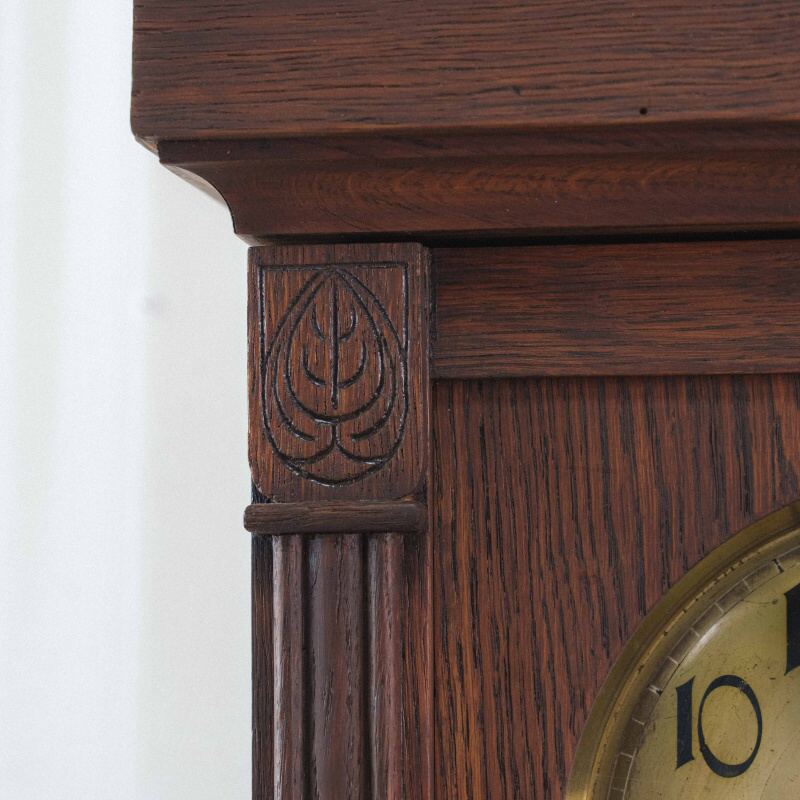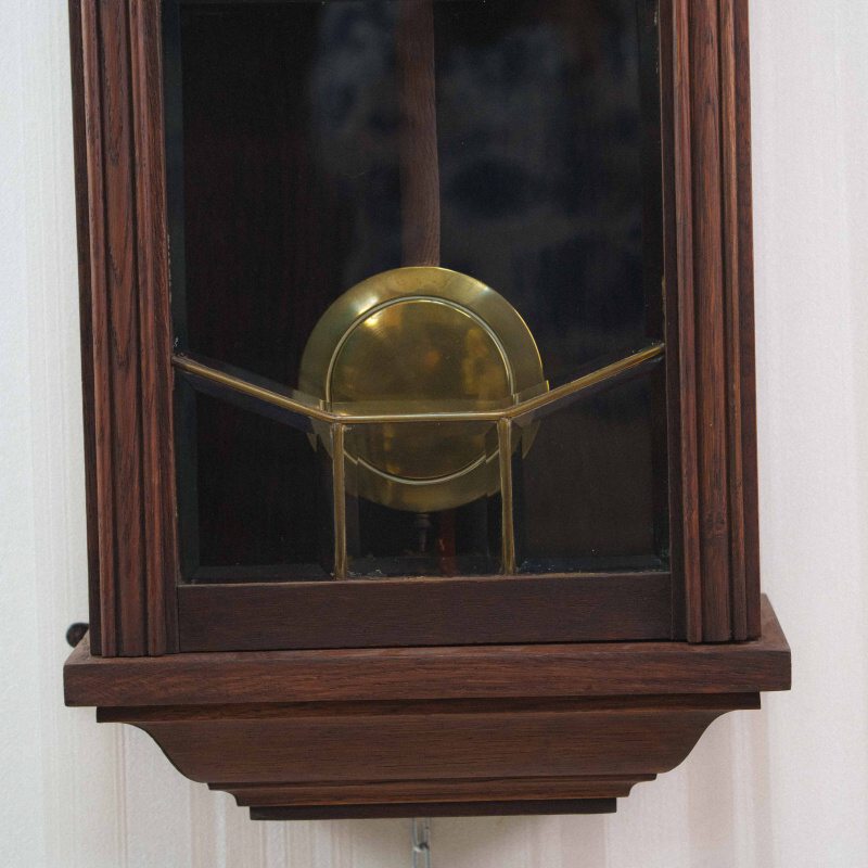 Корпус выполнен в стиле позднего модерна или раннего ар-деко из массива дуба. Характерные резные плечики по бокам от циферблата и ступенчатое завершение сверху– отличительный почерк мастеров Mauthe. Механизм с семидневным запасом хода. Два отверстия на циферблате говорят о наличии боя каждые полчаса и час. Латунная линза маятника в нижней застекленной части корпуса– типичный элемент немецких регуляторов того времени.