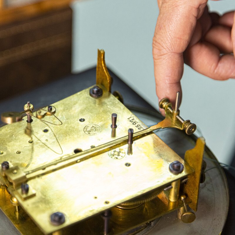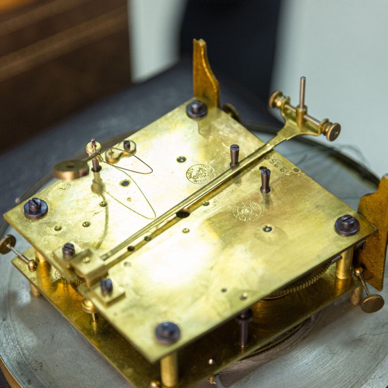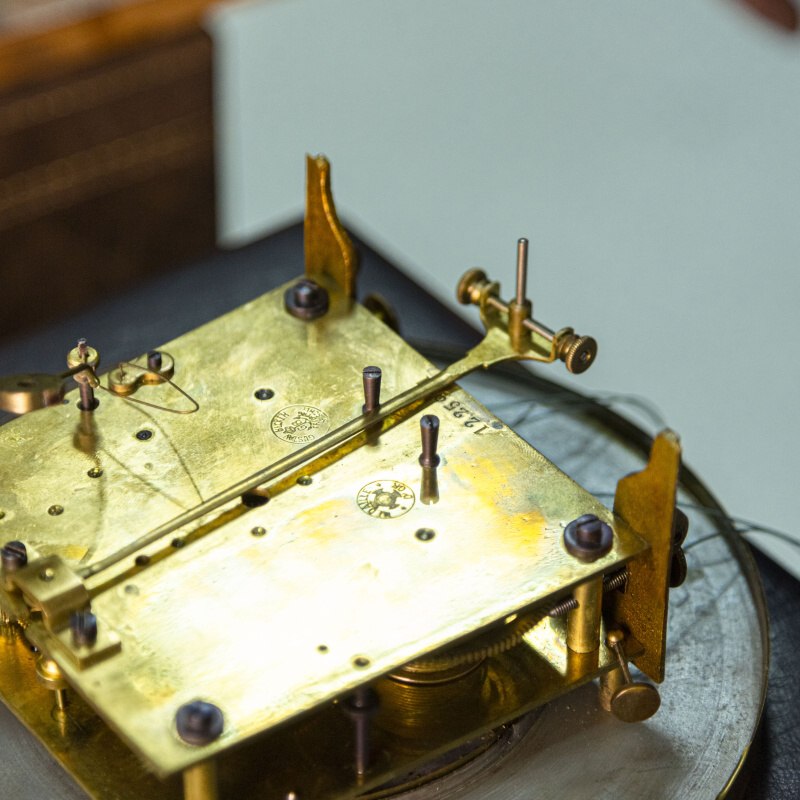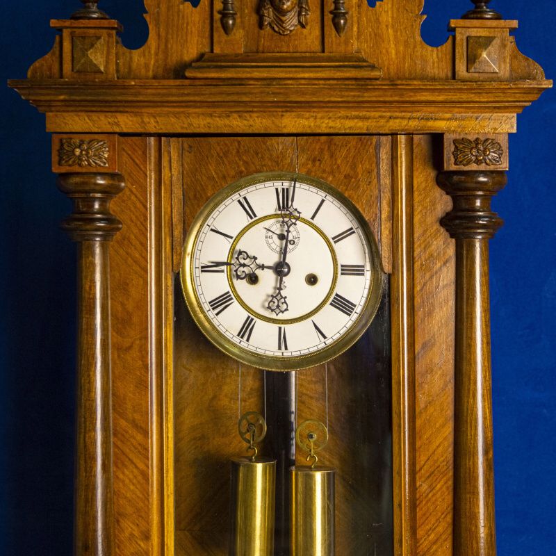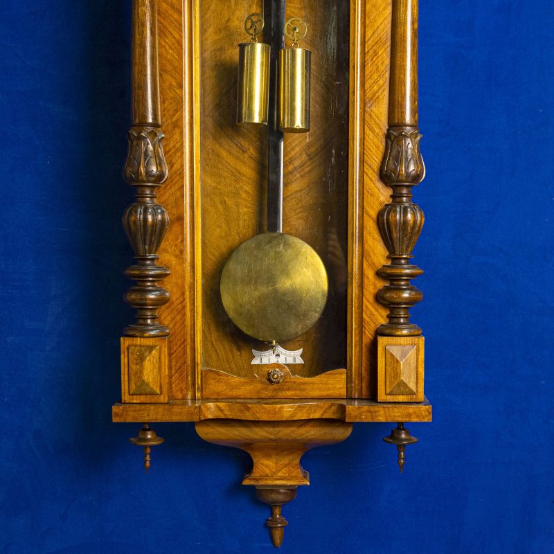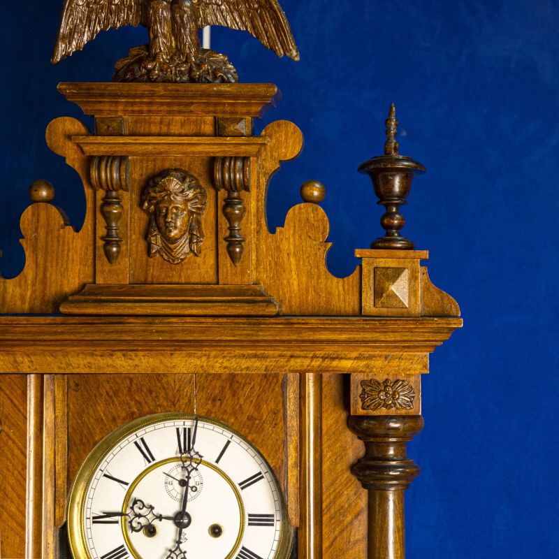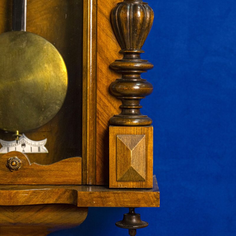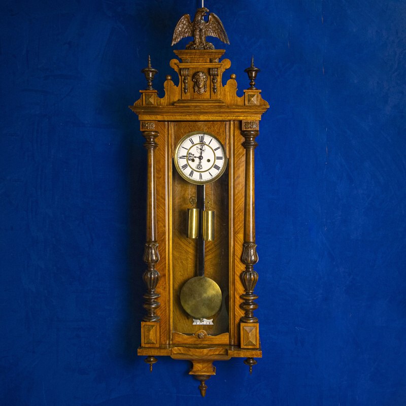 Настенные часы в корпусе классической формы. Декоративное оформление представлено многоуровневыми полуколоннами сложной формы. Эмалевый циферблат с римскими цифрами великолепно сочетается со стрелками классической формы. На задней панели часового механизма имеется фирменное клеймо фирмы Густава Беккера – якорь под короной и инициалы GB / SILESIA.