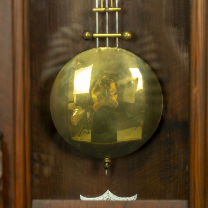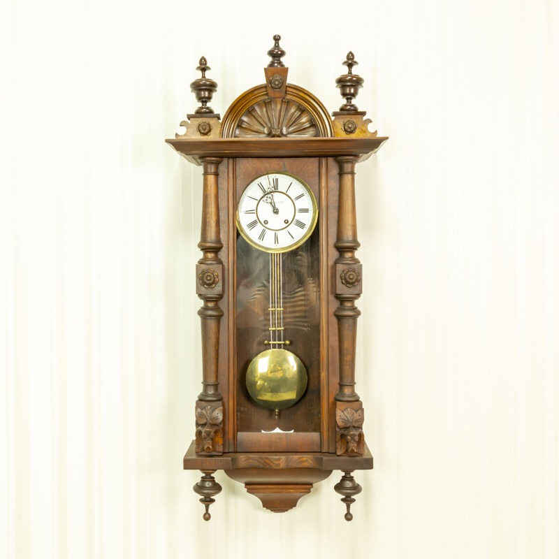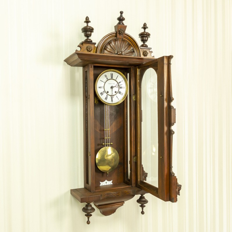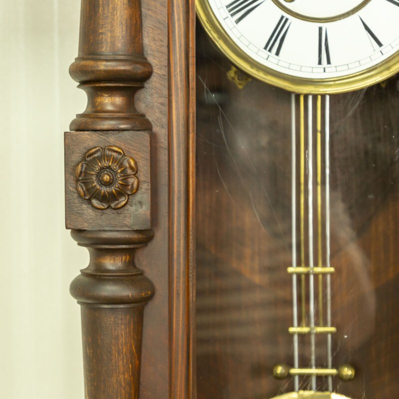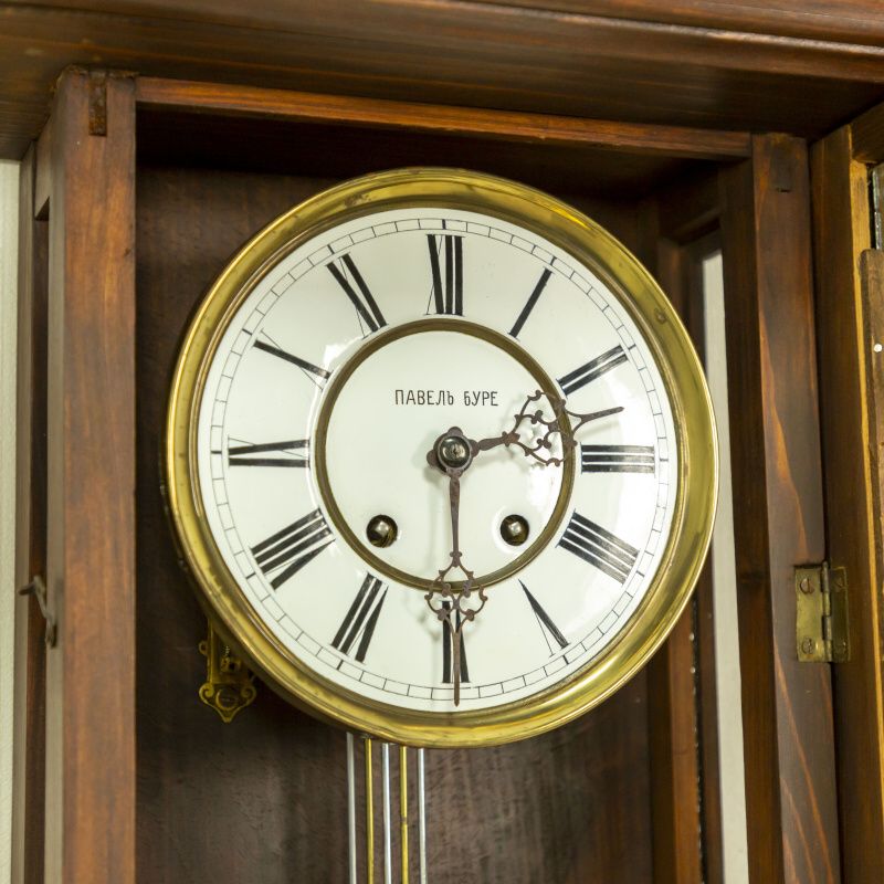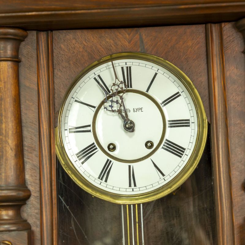 Изящные часы изготовленные в мастерской Павла Буре, в конце XIX века. Корпус часов выполнен из дерева, и элегантно украшен резными элементами. Эмалевый циферблат, великолепно сочетается с двумя стрелками классической формы. На задней стенке механизма имеется клеймо часовой мастерской Lenzkirch.