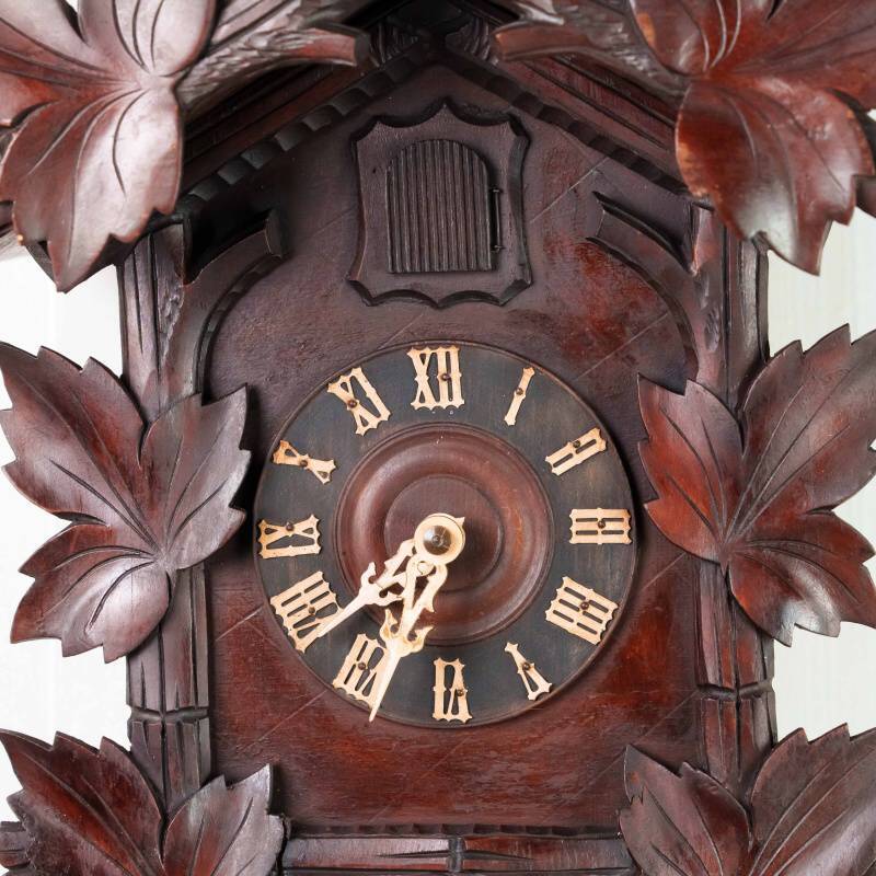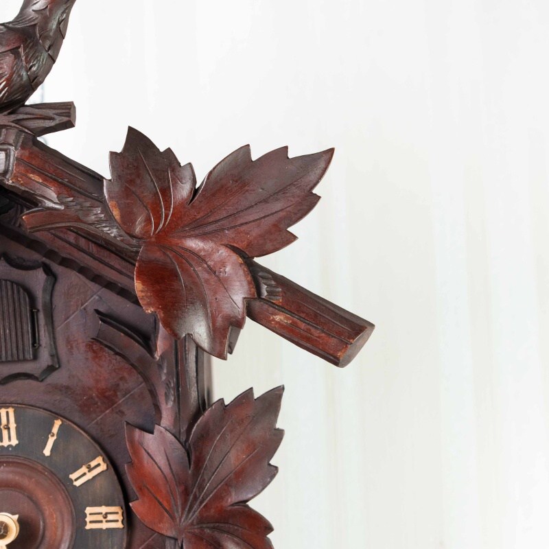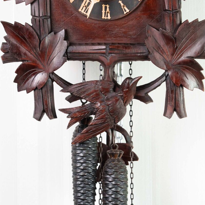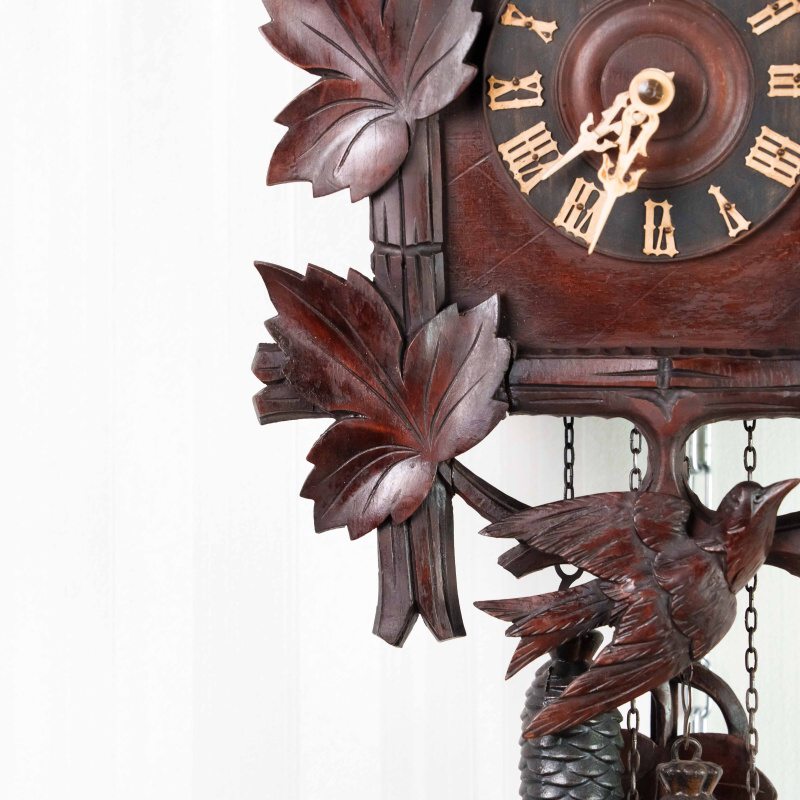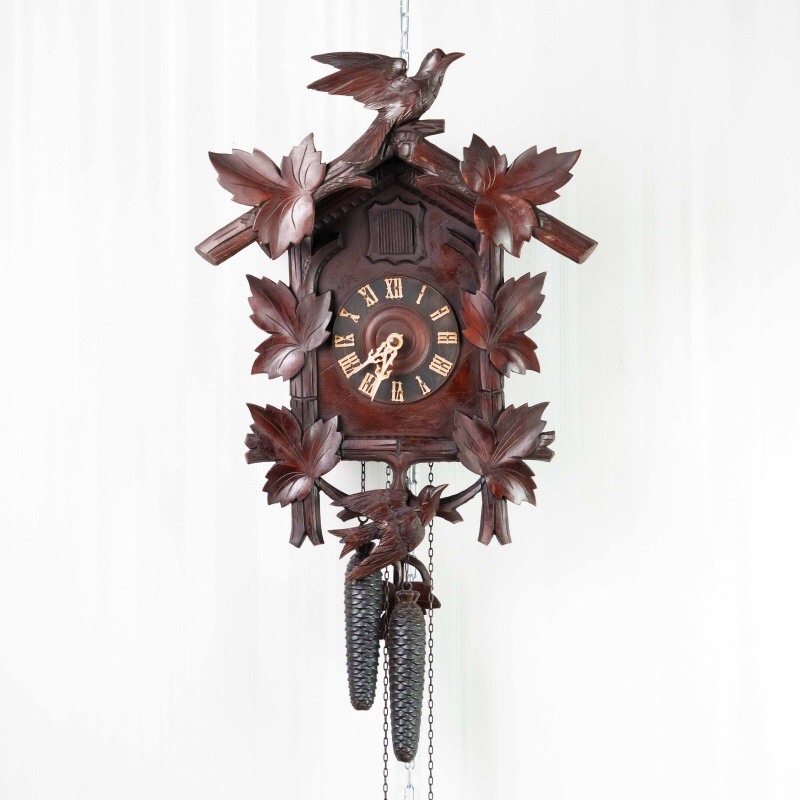Немецкие часы с кукушкой выполнены из дерева и украшены богатым орнаментом в виде резных дубовых листьев. Верхнюю часть корпуса венчает фигура птицы с распростёртыми крыльями — символ домашнего уюта и гармонии. Декоративные гирьки в форме еловых шишек и маятник придают часам подлинный характер изделий из Шварцвальда, где подобные модели получили широкое распространение. Циферблат с римскими цифрами обрамлён резным орнаментом и дополнен ажурными стрелками. При каждом часе и получасе из дверцы появляется фигурка кукушки, издающая характерный звонкий звук, что делает часы не только измерителем времени, но и живым декоративным элементом интерьера.