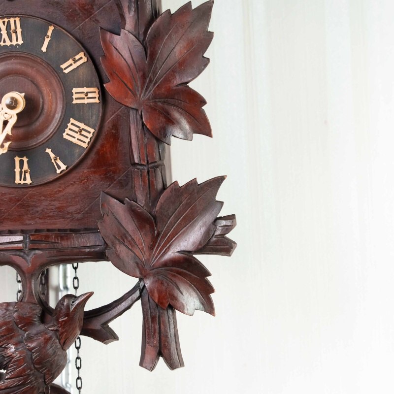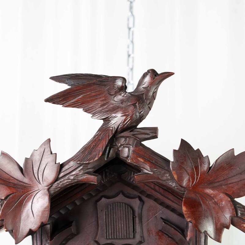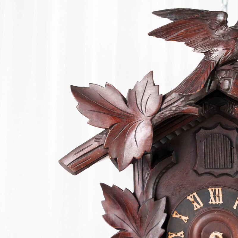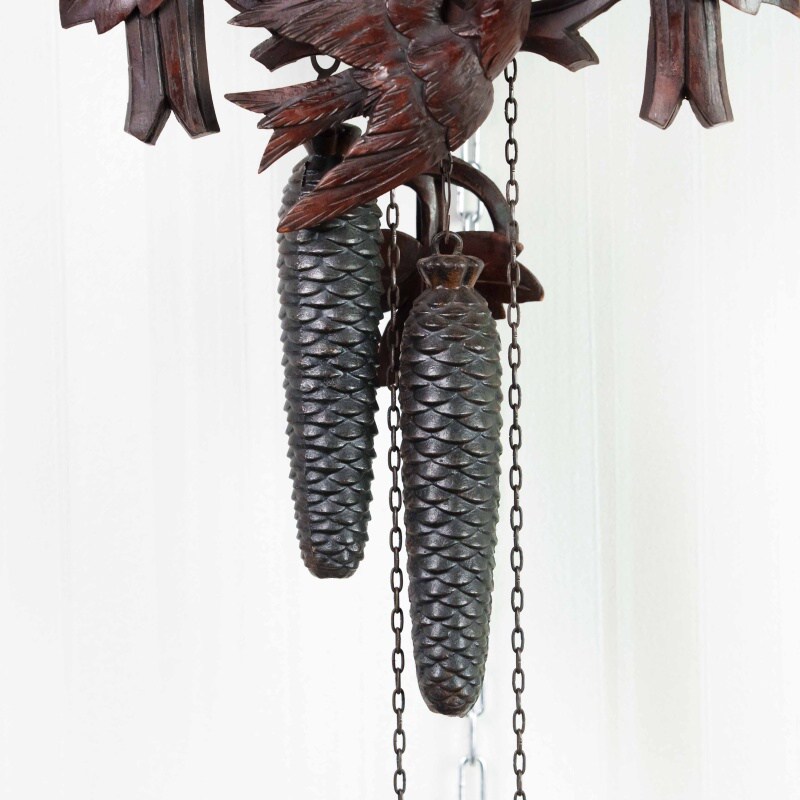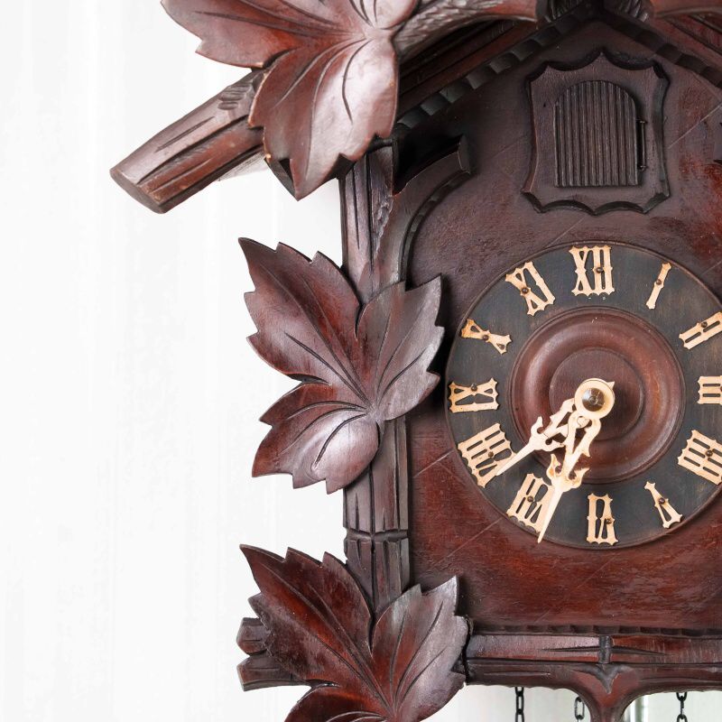 Немецкие часы с кукушкой выполнены из дерева и украшены богатым орнаментом в виде резных дубовых листьев. Верхнюю часть корпуса венчает фигура птицы с распростёртыми крыльями — символ домашнего уюта и гармонии. Декоративные гирьки в форме еловых шишек и маятник придают часам подлинный характер изделий из Шварцвальда, где подобные модели получили широкое распространение. Циферблат с римскими цифрами обрамлён резным орнаментом и дополнен ажурными стрелками. При каждом часе и получасе из дверцы появляется фигурка кукушки, издающая характерный звонкий звук, что делает часы не только измерителем времени, но и живым декоративным элементом интерьера.