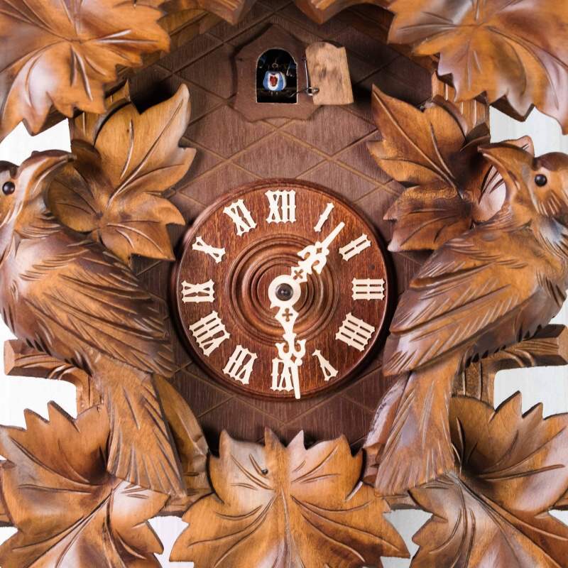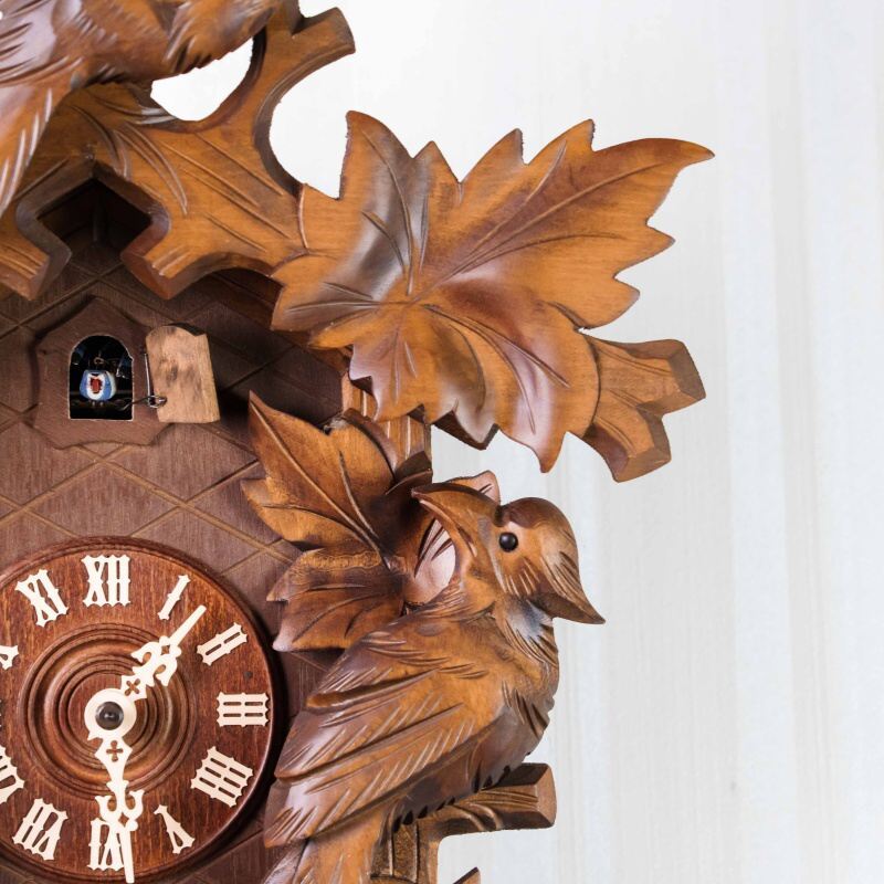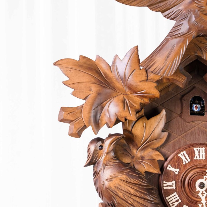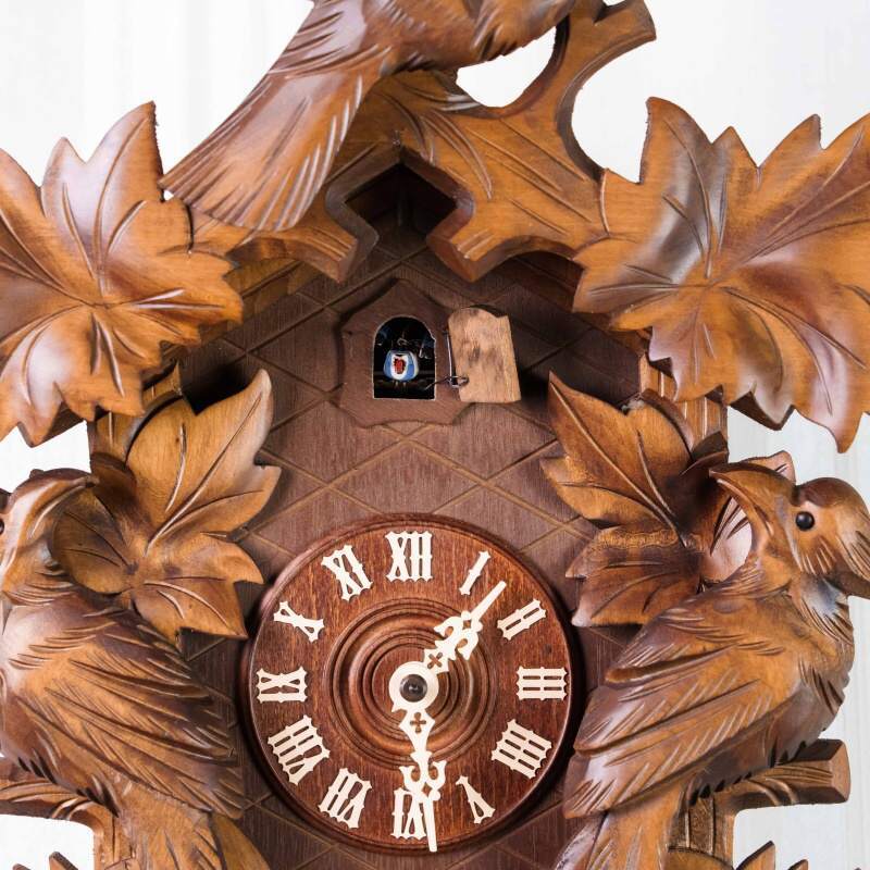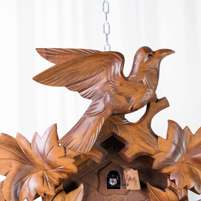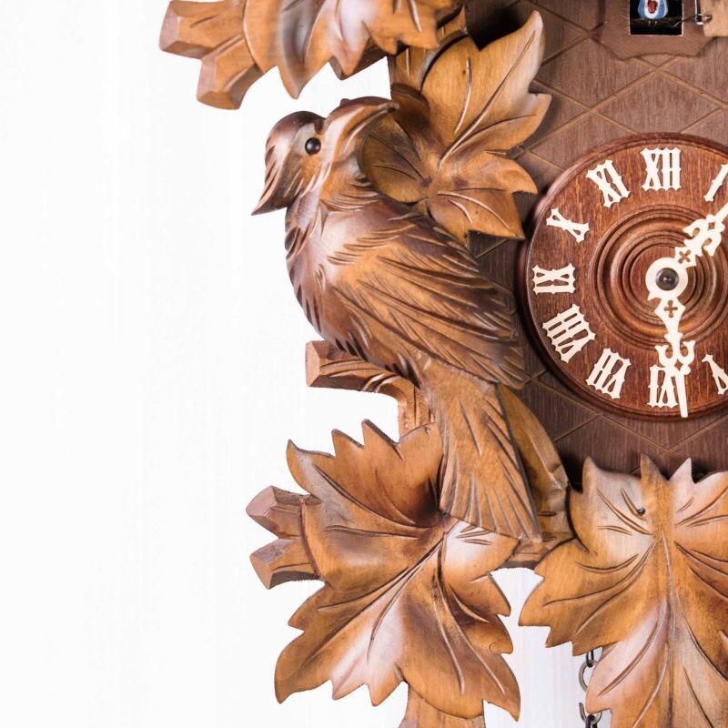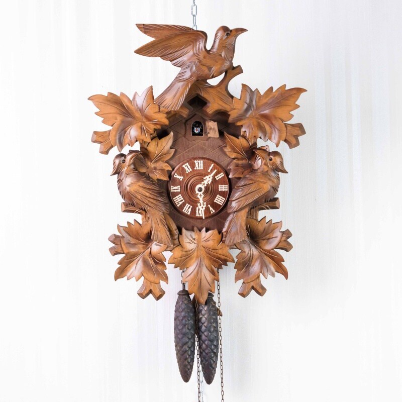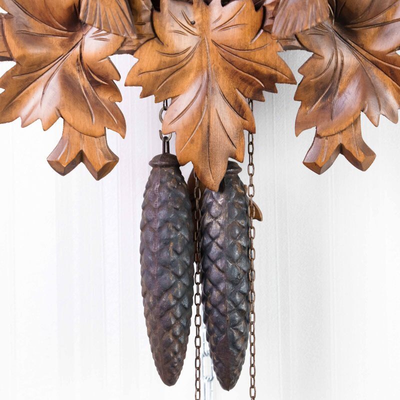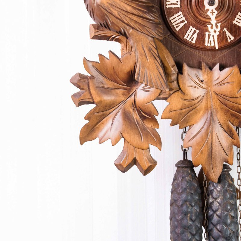 Немецкие часы с кукушкой выполнены из дерева и украшены богатым орнаментом в виде резных дубовых листьев. Верхнюю часть корпуса венчает фигура птицы с распростёртыми крыльями — символ домашнего уюта и гармонии. Декоративные гирьки в форме еловых шишек и маятник придают часам подлинный характер изделий из Шварцвальда, где подобные модели получили широкое распространение. Циферблат с римскими цифрами обрамлён резным орнаментом и дополнен ажурными стрелками. При каждом часе и получасе из дверцы появляется фигурка кукушки, издающая характерный звонкий звук, что делает часы не только измерителем времени, но и живым декоративным элементом интерьера.