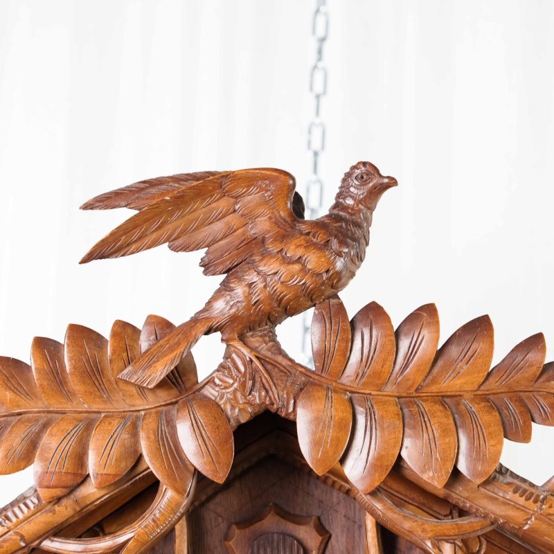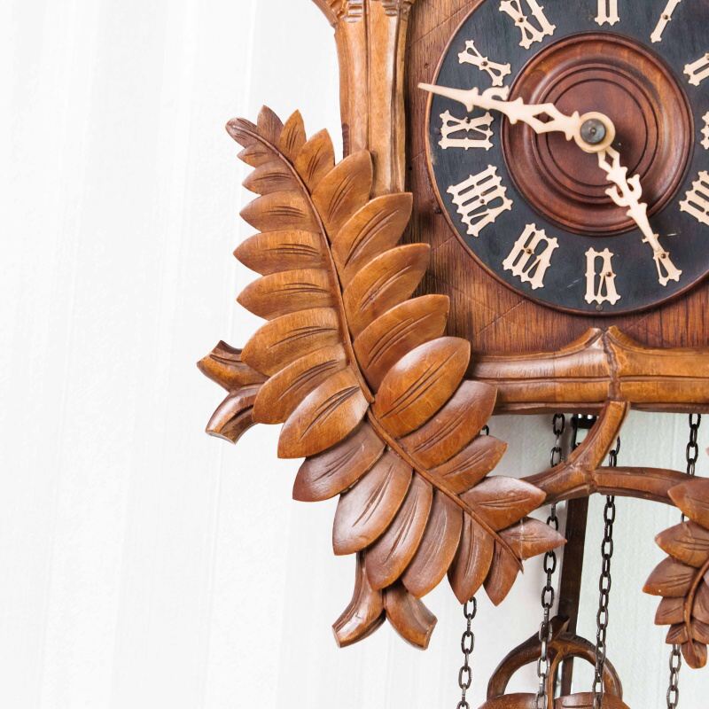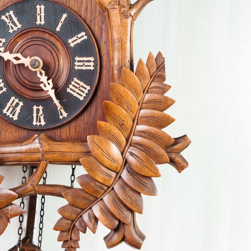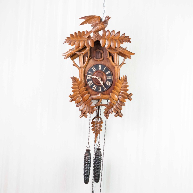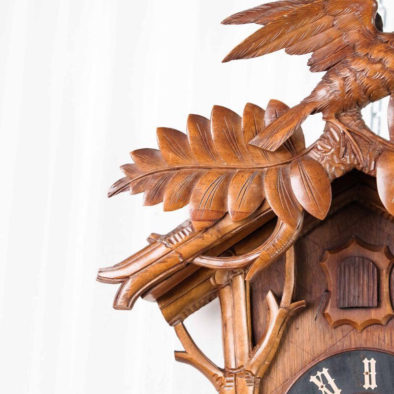 Немецкие часы с кукушкой выполнены из дерева и украшены богатым орнаментом в виде резных дубовых листьев. Верхнюю часть корпуса венчает фигура птицы с распростёртыми крыльями — символ домашнего уюта и гармонии. Декоративные гирьки в форме еловых шишек и маятник придают часам подлинный характер изделий из Шварцвальда, где подобные модели получили широкое распространение. Циферблат с римскими цифрами обрамлён резным орнаментом и дополнен ажурными стрелками. При каждом часе и получасе из дверцы появляется фигурка кукушки, издающая характерный звонкий звук, что делает часы не только измерителем времени, но и живым декоративным элементом интерьера.
