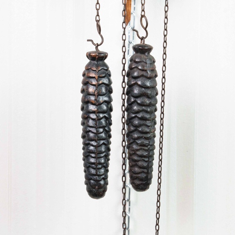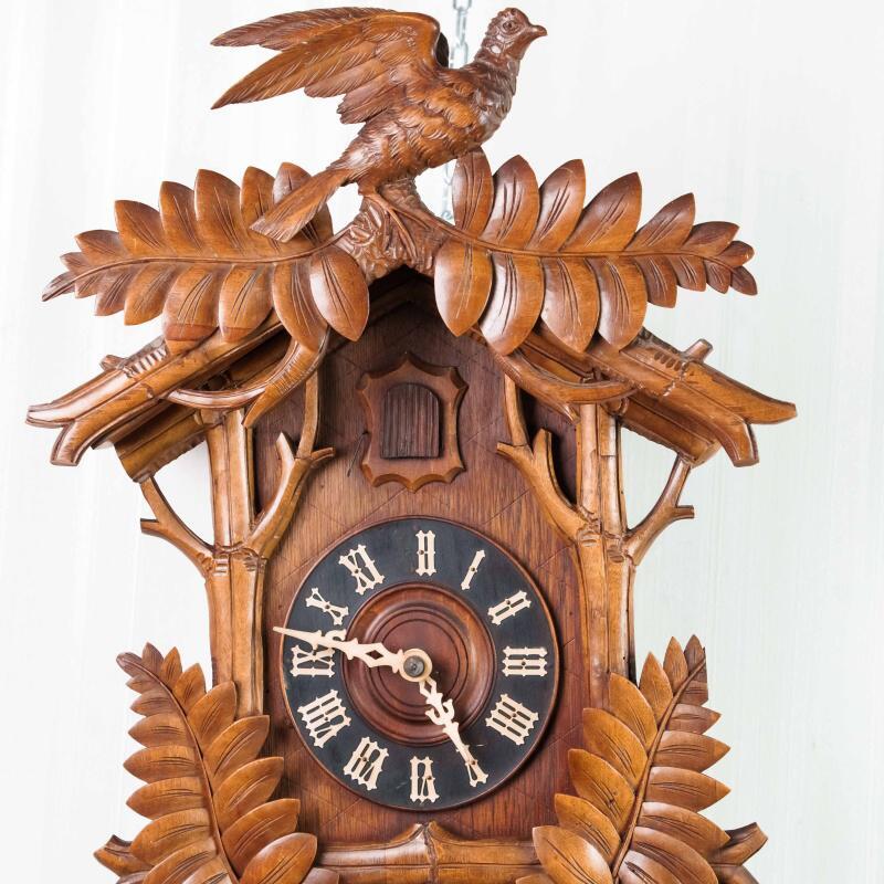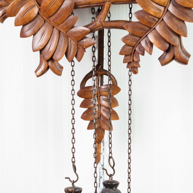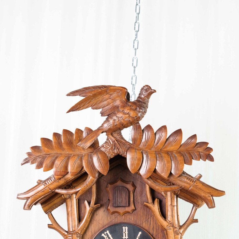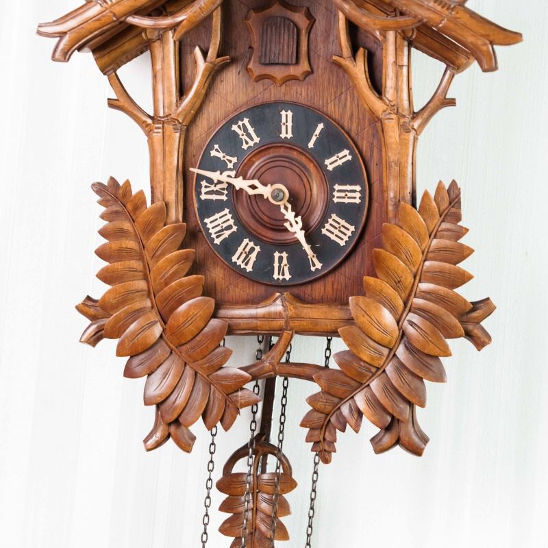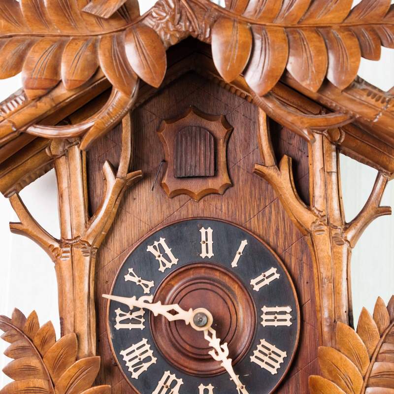 Немецкие часы с кукушкой выполнены из дерева и украшены богатым орнаментом в виде резных дубовых листьев. Верхнюю часть корпуса венчает фигура птицы с распростёртыми крыльями — символ домашнего уюта и гармонии. Декоративные гирьки в форме еловых шишек и маятник придают часам подлинный характер изделий из Шварцвальда, где подобные модели получили широкое распространение. Циферблат с римскими цифрами обрамлён резным орнаментом и дополнен ажурными стрелками. При каждом часе и получасе из дверцы появляется фигурка кукушки, издающая характерный звонкий звук, что делает часы не только измерителем времени, но и живым декоративным элементом интерьера.