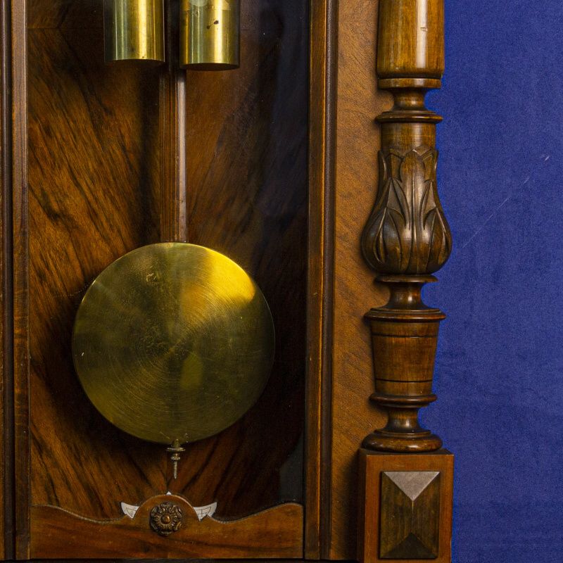 Настенные часы в корпусе классической формы. Декоративное оформление представлено многоуровневыми полуколоннами сложной формы. Эмалевый циферблат с арабскими цифрами великолепно сочетается со стрелками классической формы. На задней панели часового механизма имеется фирменное клеймо фирмы Густава Беккера – якорь под короной и инициалы GB / SILESIA.